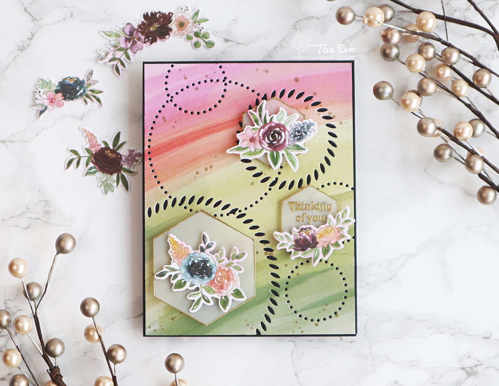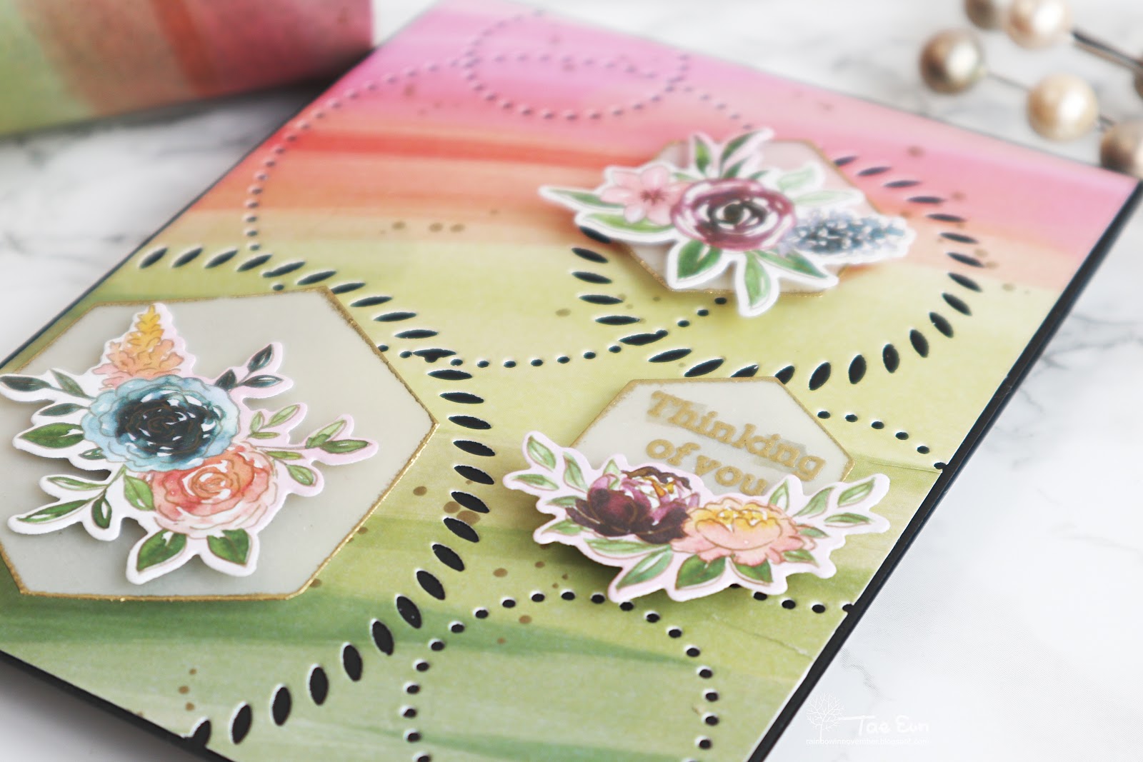 Now I started assembling the card by adhering the background panel on a black cardbase. The hexagons were then foam mounted and the floral clusters were added on them using some foam adhesives.