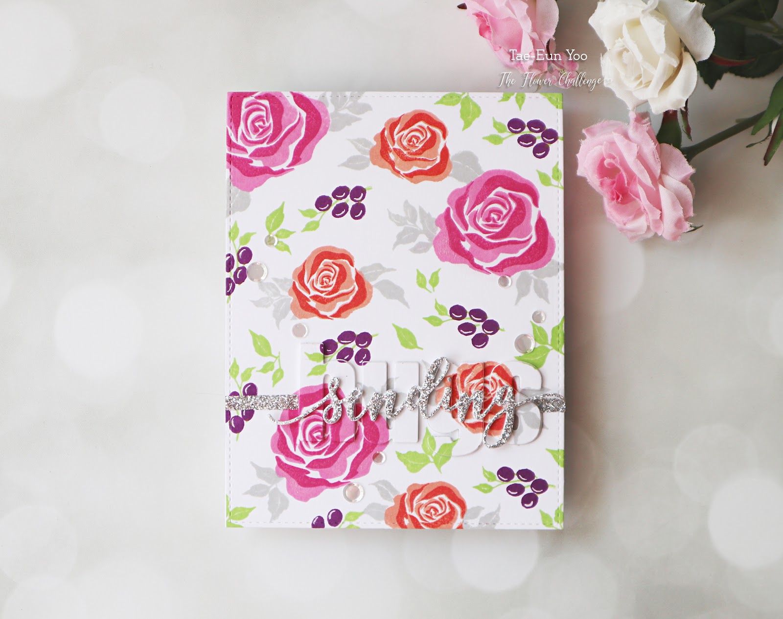 “sending” was cut using Love and Hugs word plate die as well from some Adhesive Glitter Paper glossy fine silver and some white cardstock. I stacked them together and added it on “hugs”
