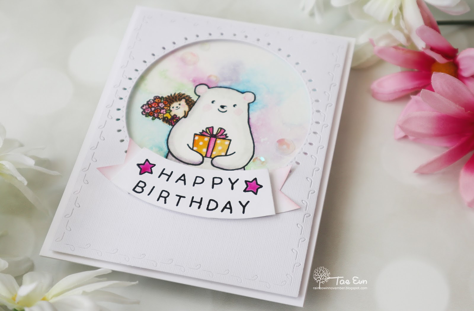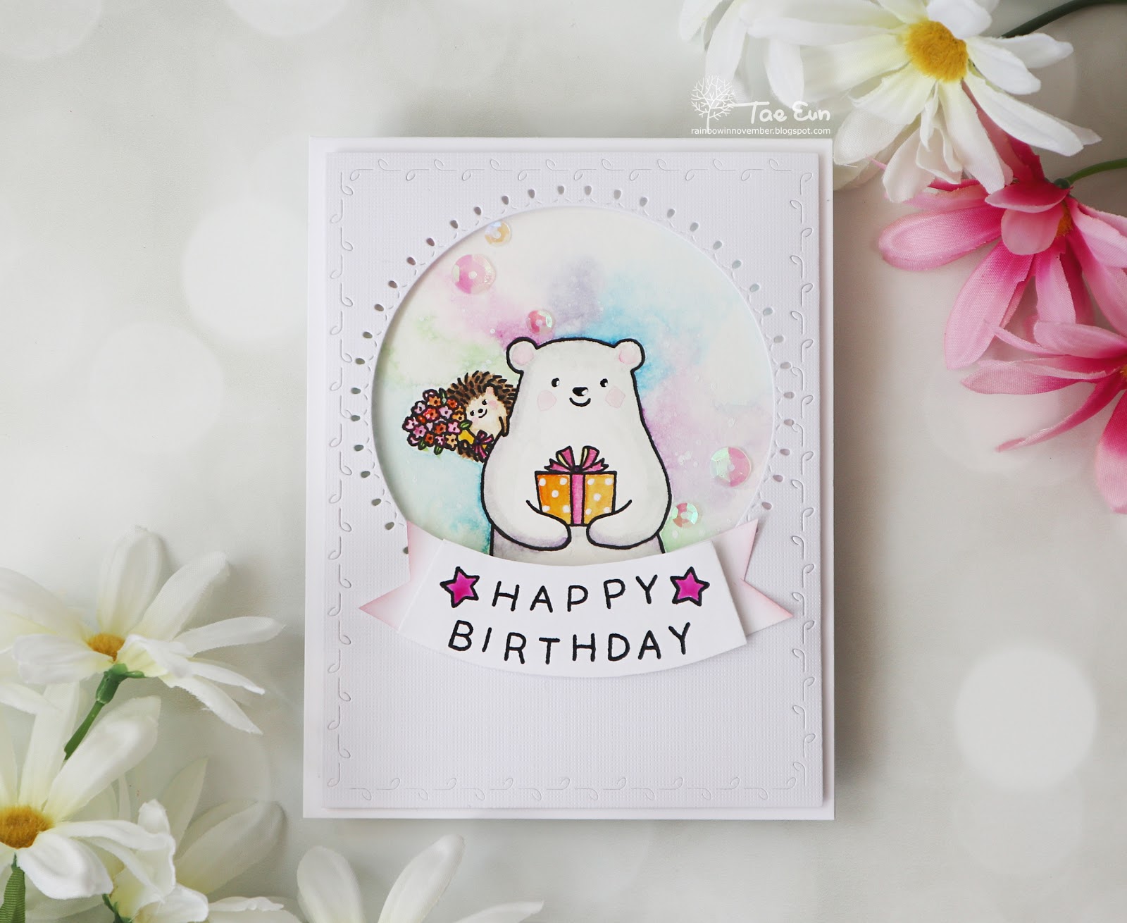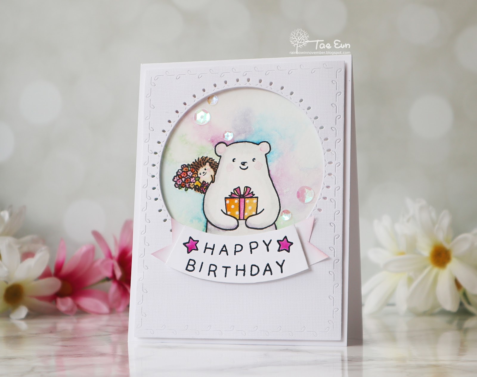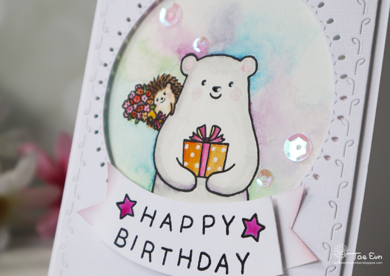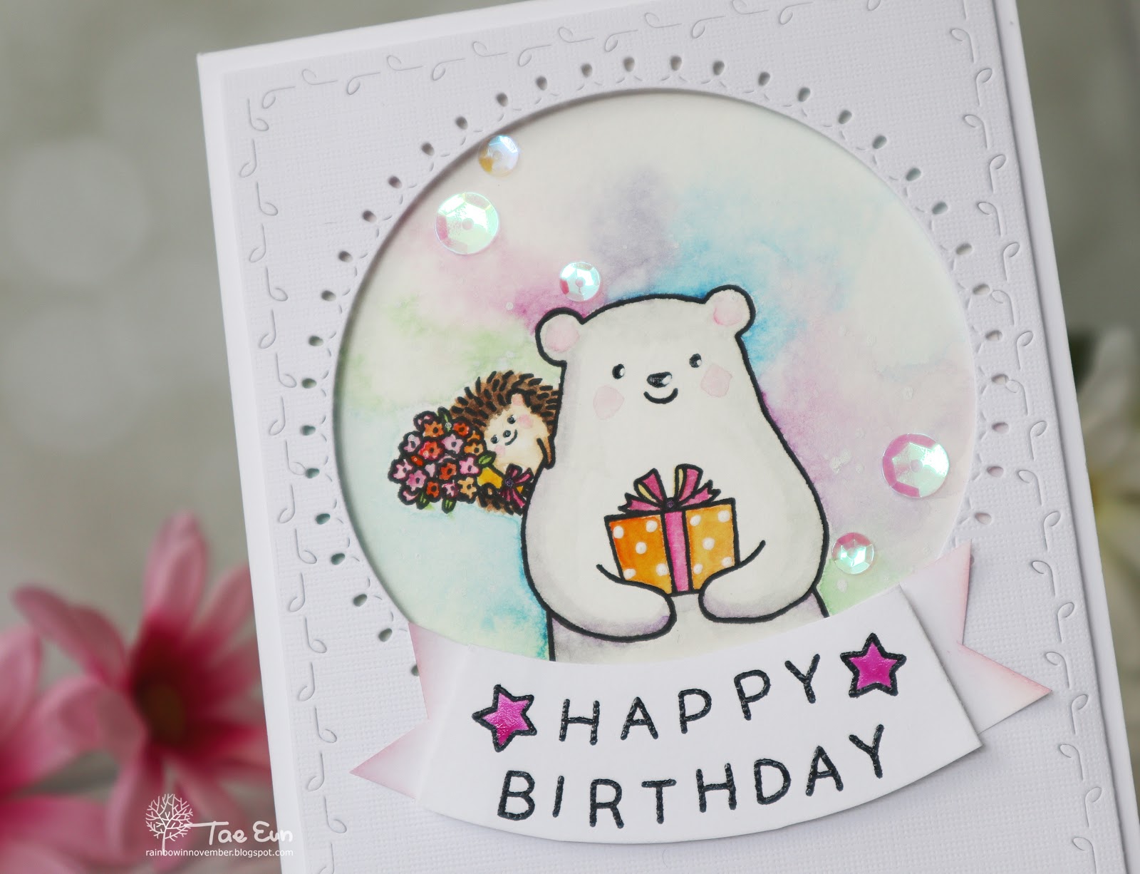 I started off by stamping the image on a watercolor paper in black pigment ink. I watercolored the hedgehog and the polar bear. To make the white bear pop, I added watercolor wash in the background and splattered white ink on it.