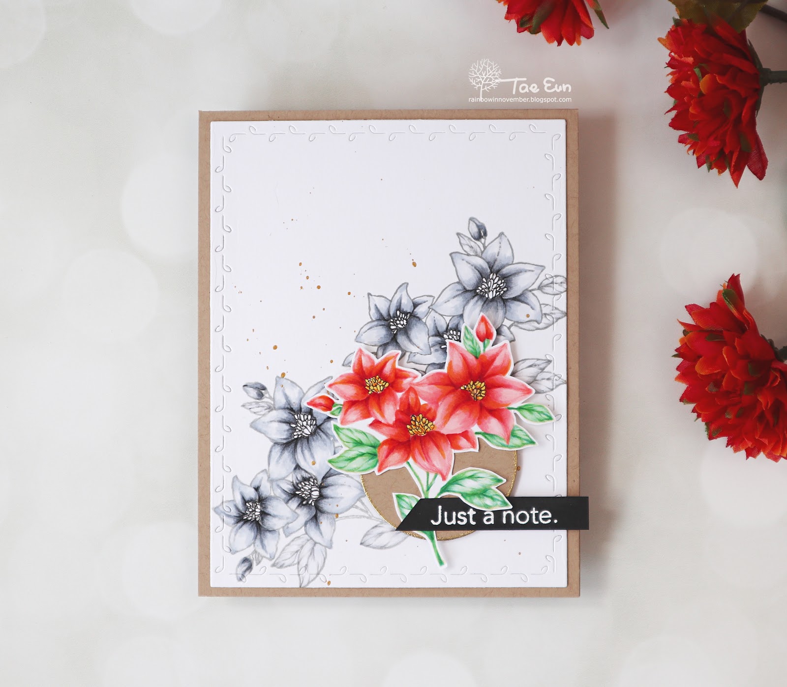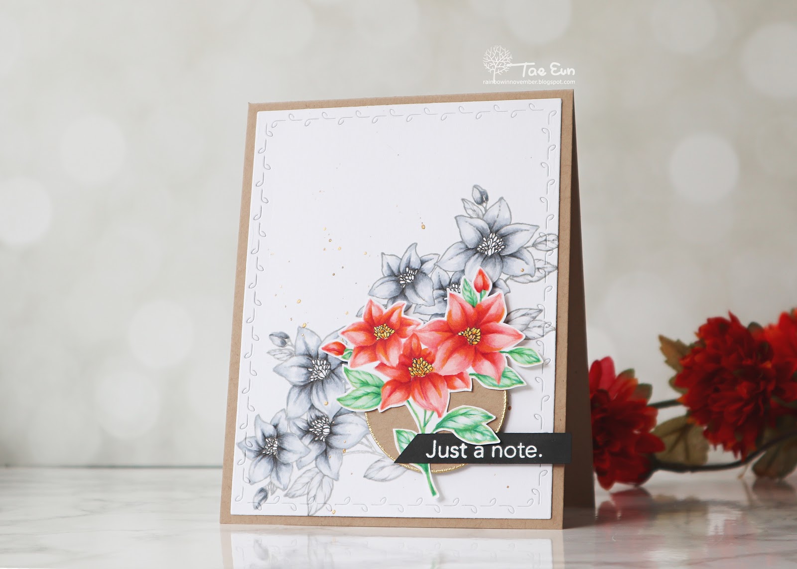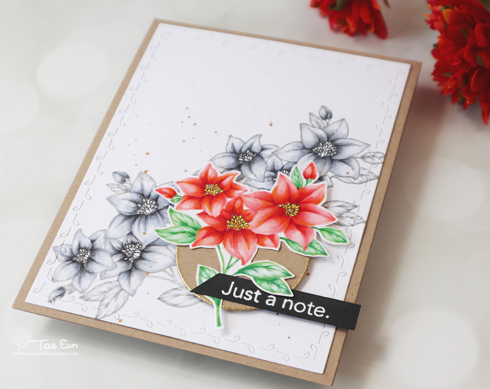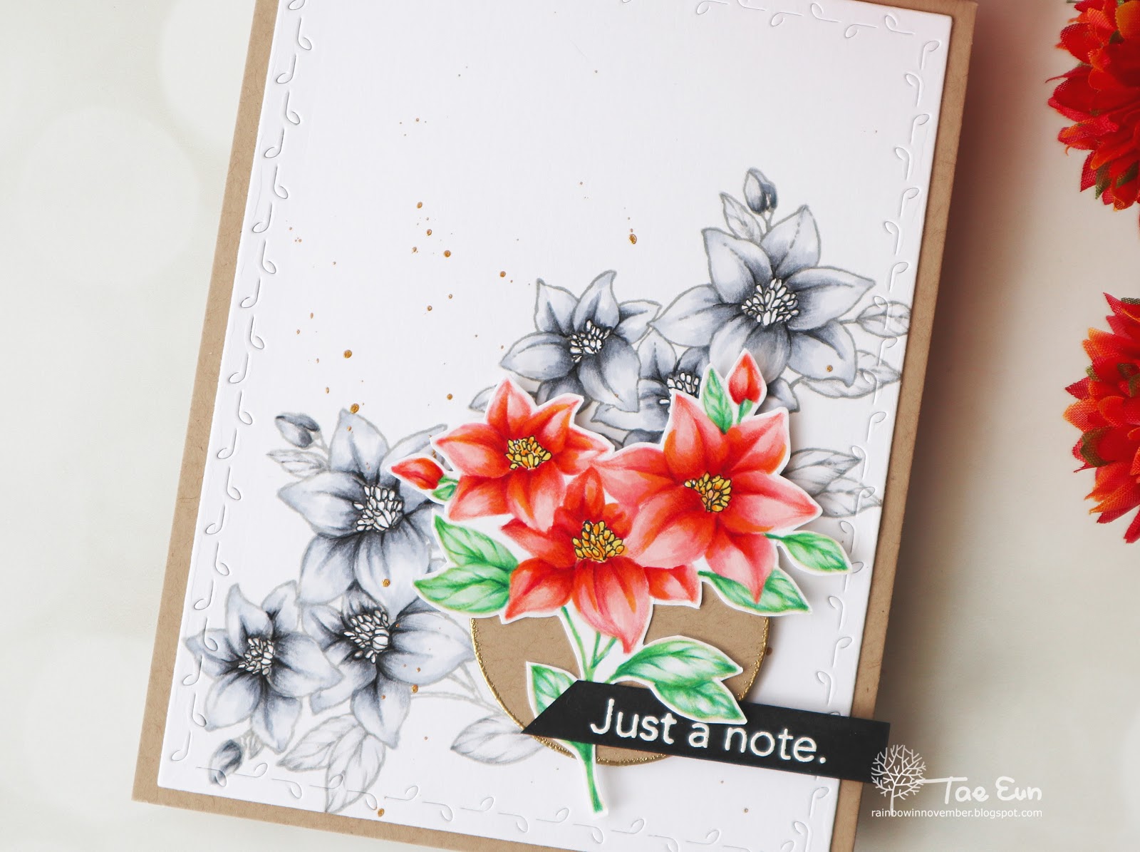 I stamped the floral cluster two times on a white cardstock panel in gray Memento ink. I colored the image using C Copic colors and added details using Polychromos pencils also in cool gray. I then splattered gold watercolor on the panel and let it dry.
