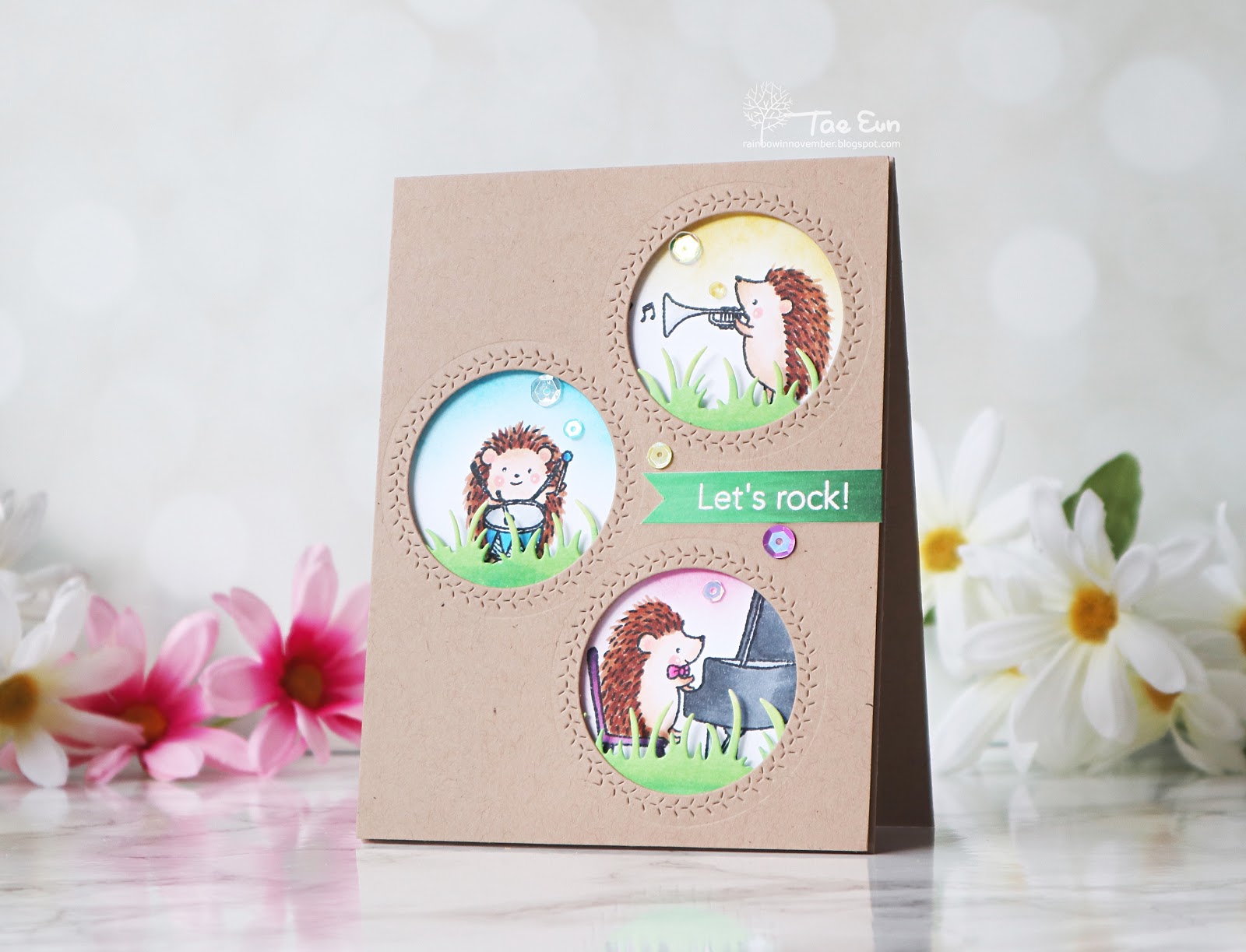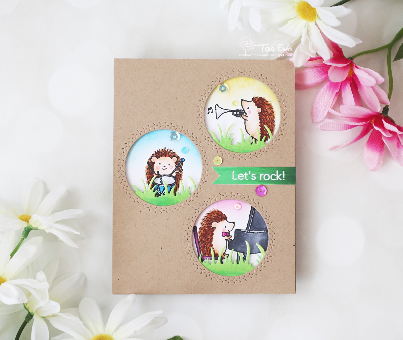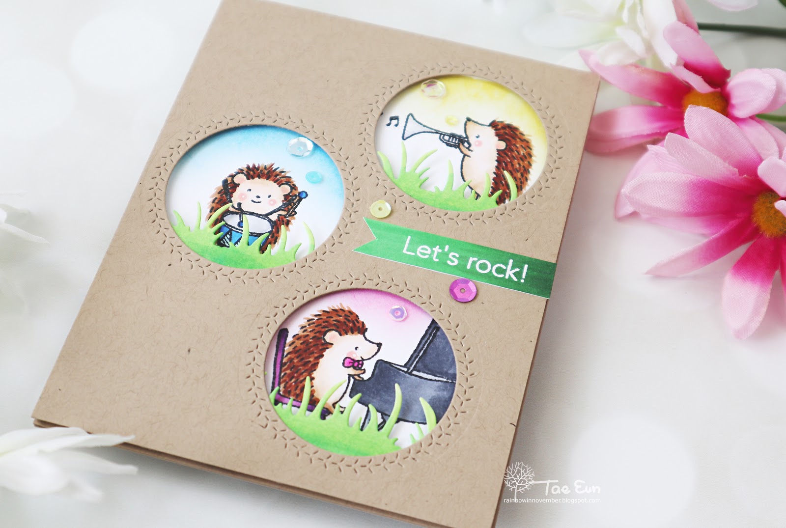 I stamped three hedgehogs from Hedgie Harmony(30-589) on a A2 sized white cardstock panel in black Memento ink. I used the kraft panel with three windows as my guide to place the stamps. I then colored the hedgehogs and instruments using Copic markers. I ink blended around the images in yellow, blue and pink respectively using Distress inks.