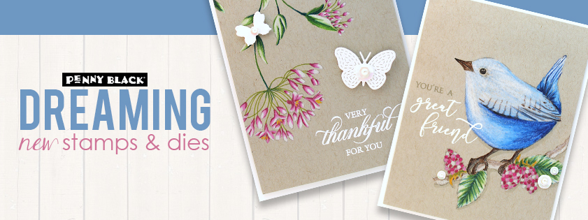 I had the pleasure to play with the new stamp and die collection, called Dreaming by Penny Black. It is a lovely release again which includes beautiful floral stamps, cute critters and gorgeous scenic stamps.