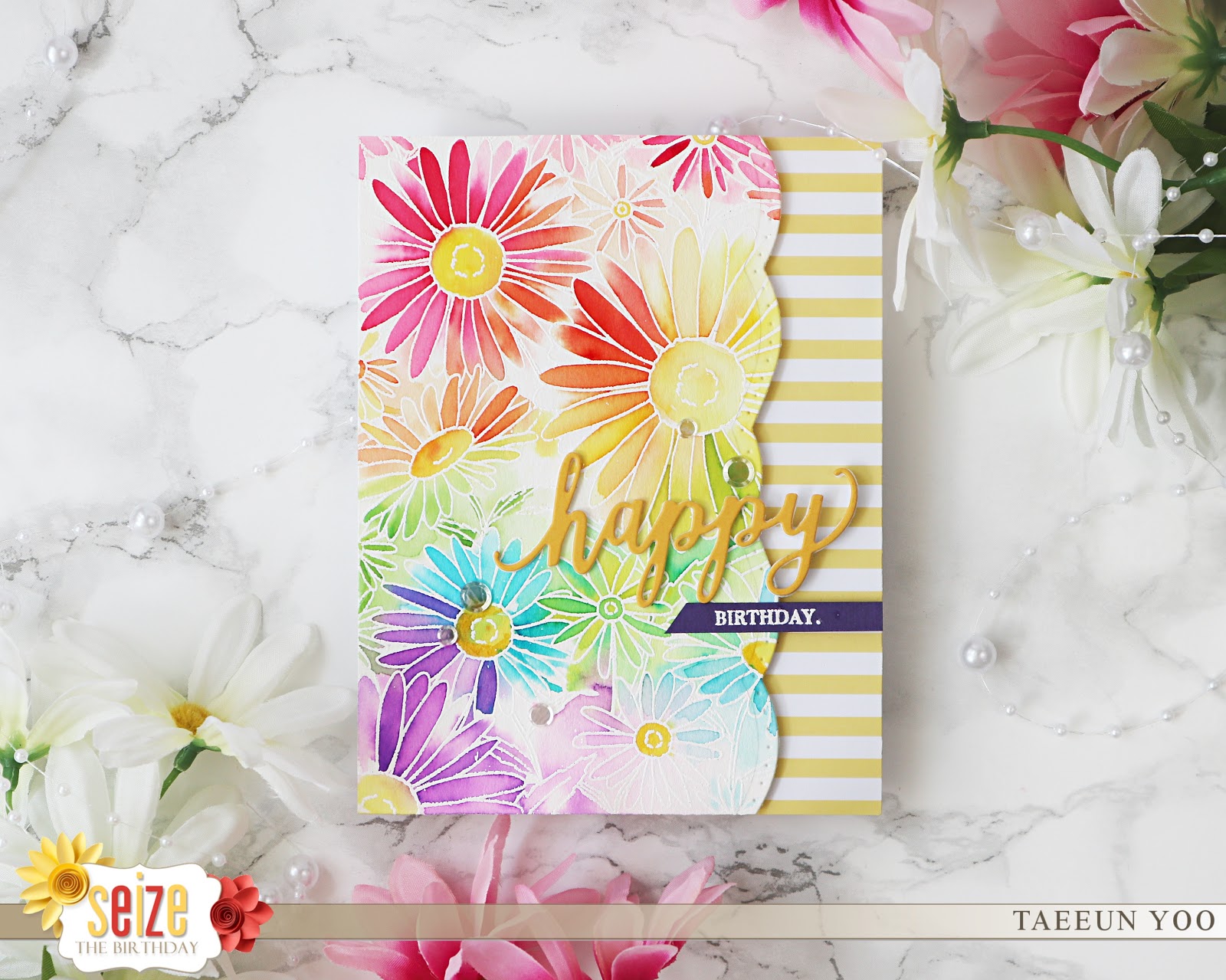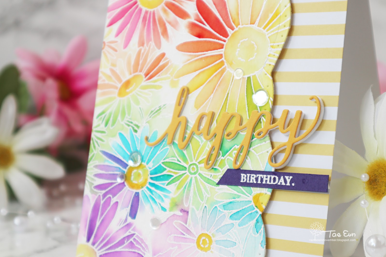 I white heat embossed the Daisy Fields on a watercolor cardstock and colored it using Color Burst powders in rainbow colors. I then cut the right side with a die from Scalloped Borders Three die set by Spellbeinders.