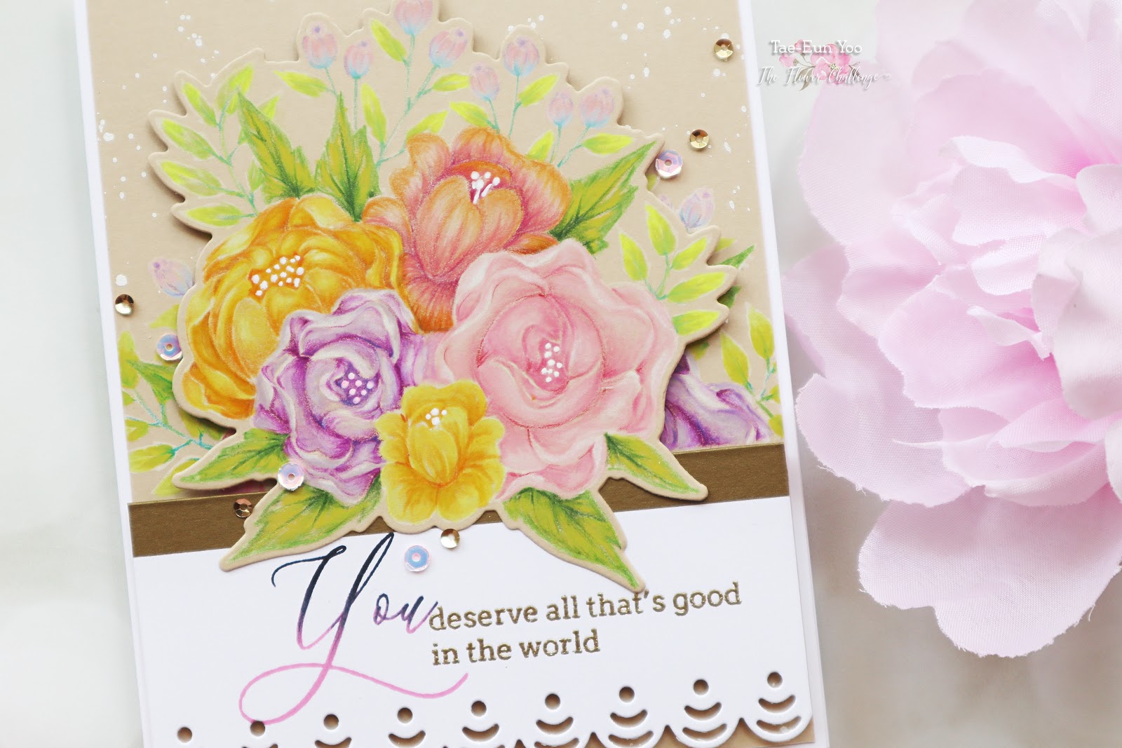 I also stamped and colored the same bouquet on a separate Almond cream cardstock panel and splattered white opaque ink on it. To add the sentiment I decided to make a extra panel cutting the bottom using one of Lacey Edgers dies. The sentiment is from Blooming Bouquet set as well. I gold heat embossed the small words and stamped the big “You” in black and pink in ombre style. On the top border of the panel I adhered the Matte Gold washi tape to add golden accent.