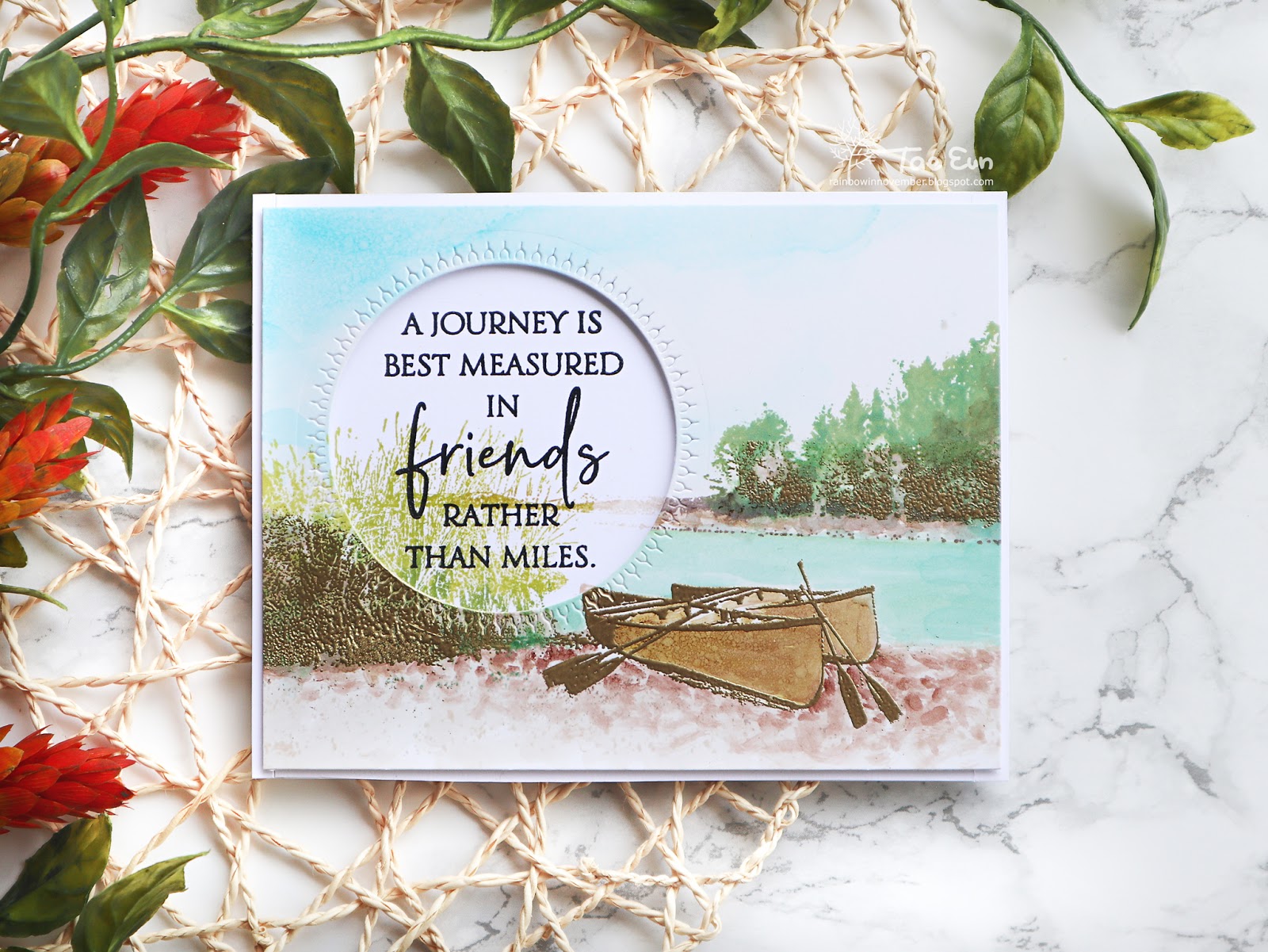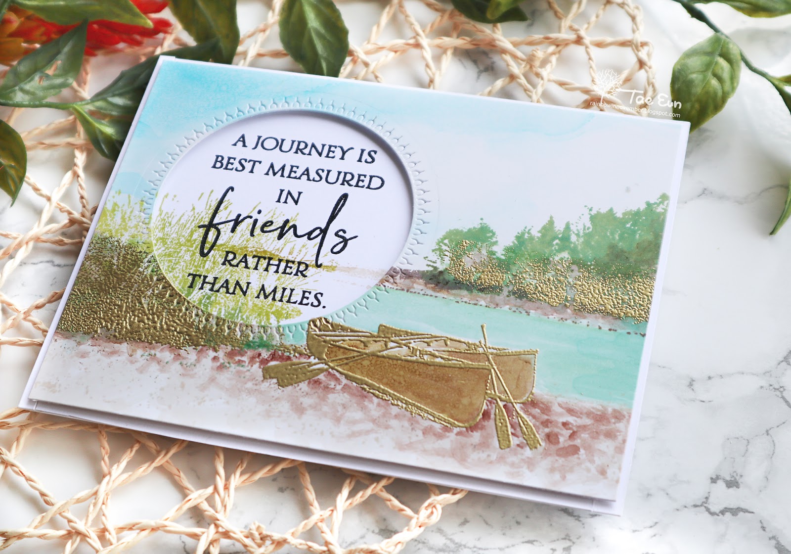 After the panel was completely dry I gold heat embossed the boats and the bottom parts of the bush and the trees. I then cut a circle using one of the Stitched Circles (51-551) die set. To add the sentiment I stamped the scene on a white cardbase in the same colors and stamped the sentiment from Destination Sentiments (30-590) set in black pigment ink and clear heat embossed it. Lastly I foam mounted the colored panel on the cardbase.