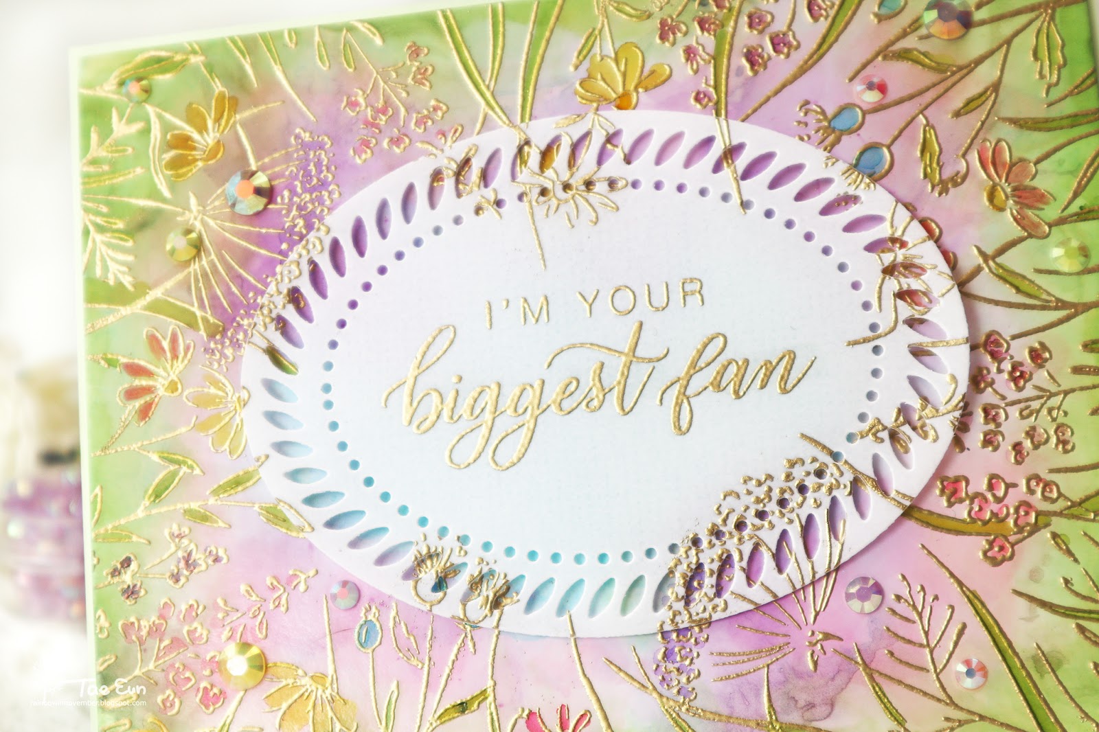 I started off by stamping the floral border image on a Alcohol ink cardstock in light Memento ink. The stamped image helped me as my guide while I added colors on the background. To create the background I dropped green, purple, pink and light blue ink on a palette and added rubbing alcohol to them to lighten the colors.