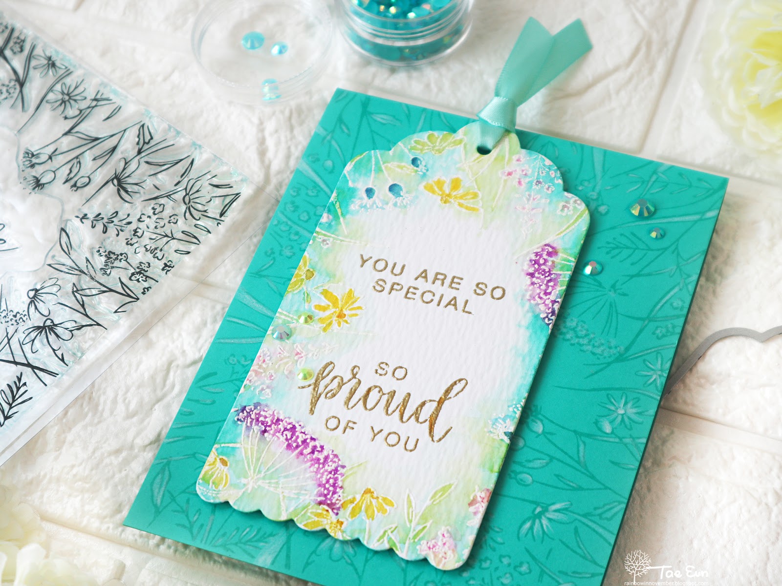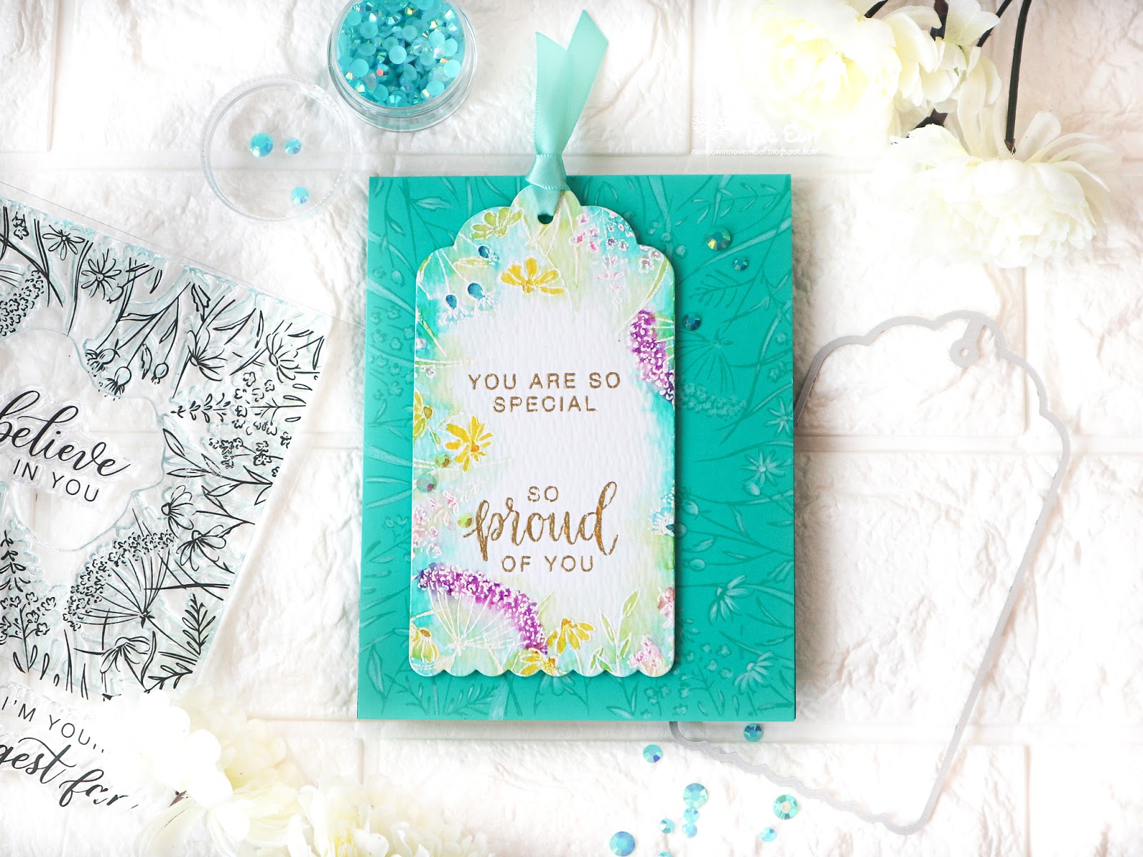 I chose a cardbase which is in the similar color like Aquamarine of the Liquid Watercolor. I stamped the image from You Make A Difference set on the cardbase in pool color to get a tone on tone look. I cut the big tag from watercolor paper using a tag die from Classic Tags with Fillable Elements set and white heat embossed the image on it.