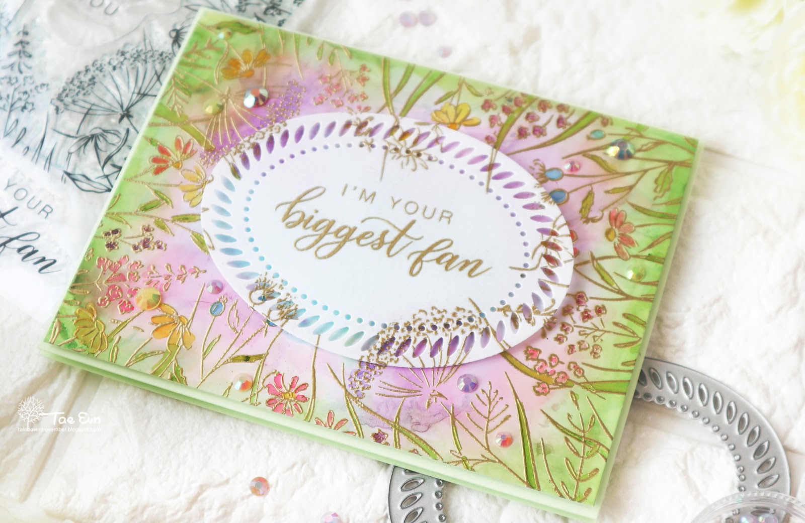 I narrowed down the colored panel a little bit and foam mounted it on a French Mint cardbase. The vellum panel with the sentiment was added using some clear foam adhesives. To finish off I scattered jewels in various colors from the pretty Jewel Mix.