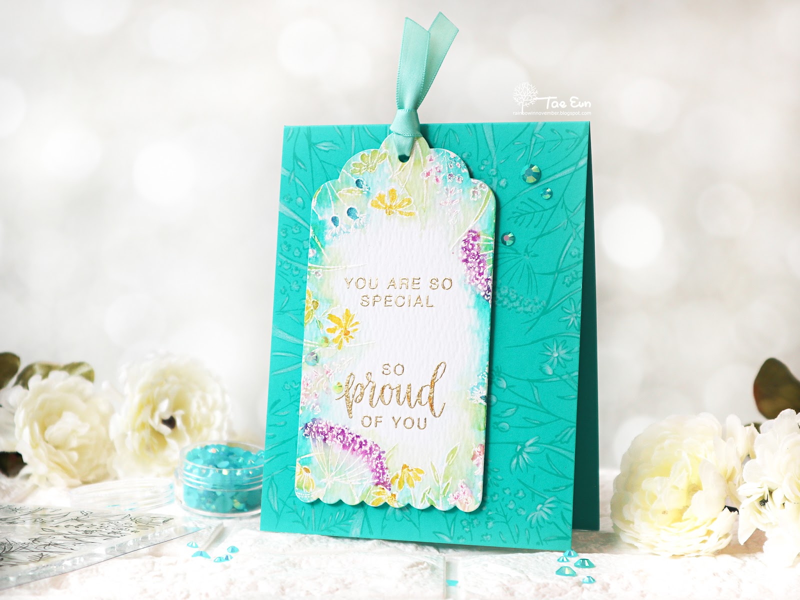 I tied a ribbon in the tag and foam mounted it on the cardbase. To embellish my card I added some jewels from Jewel Mix.