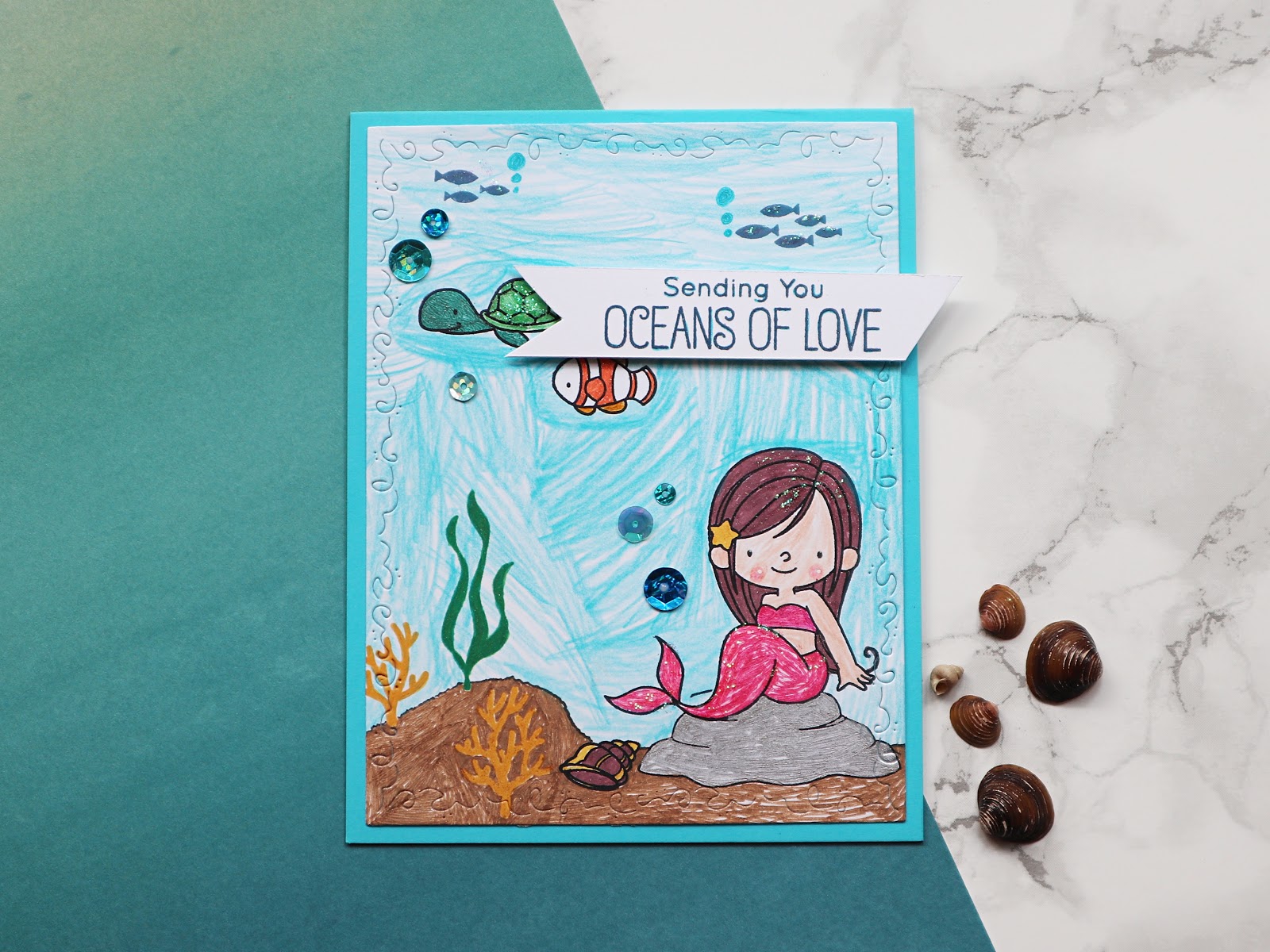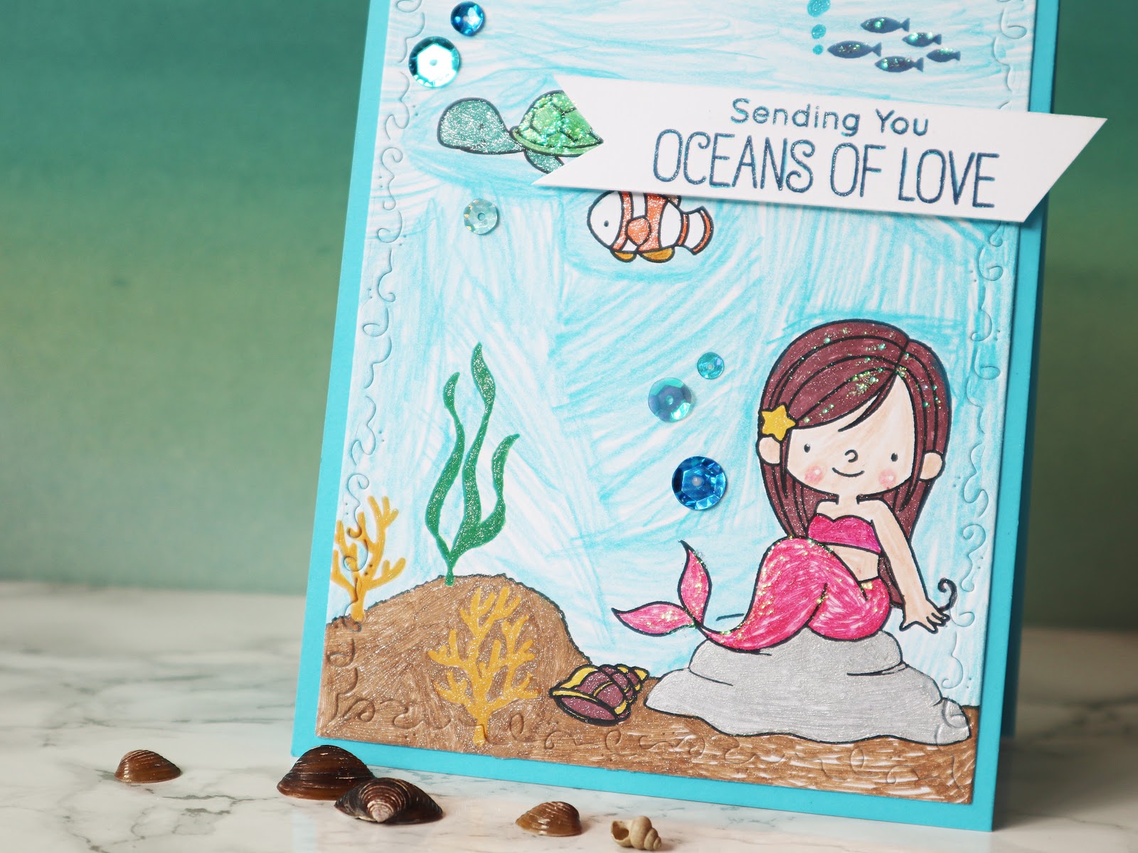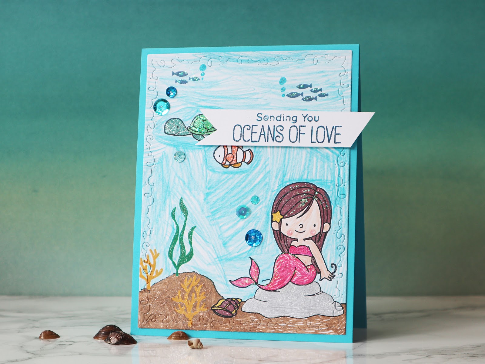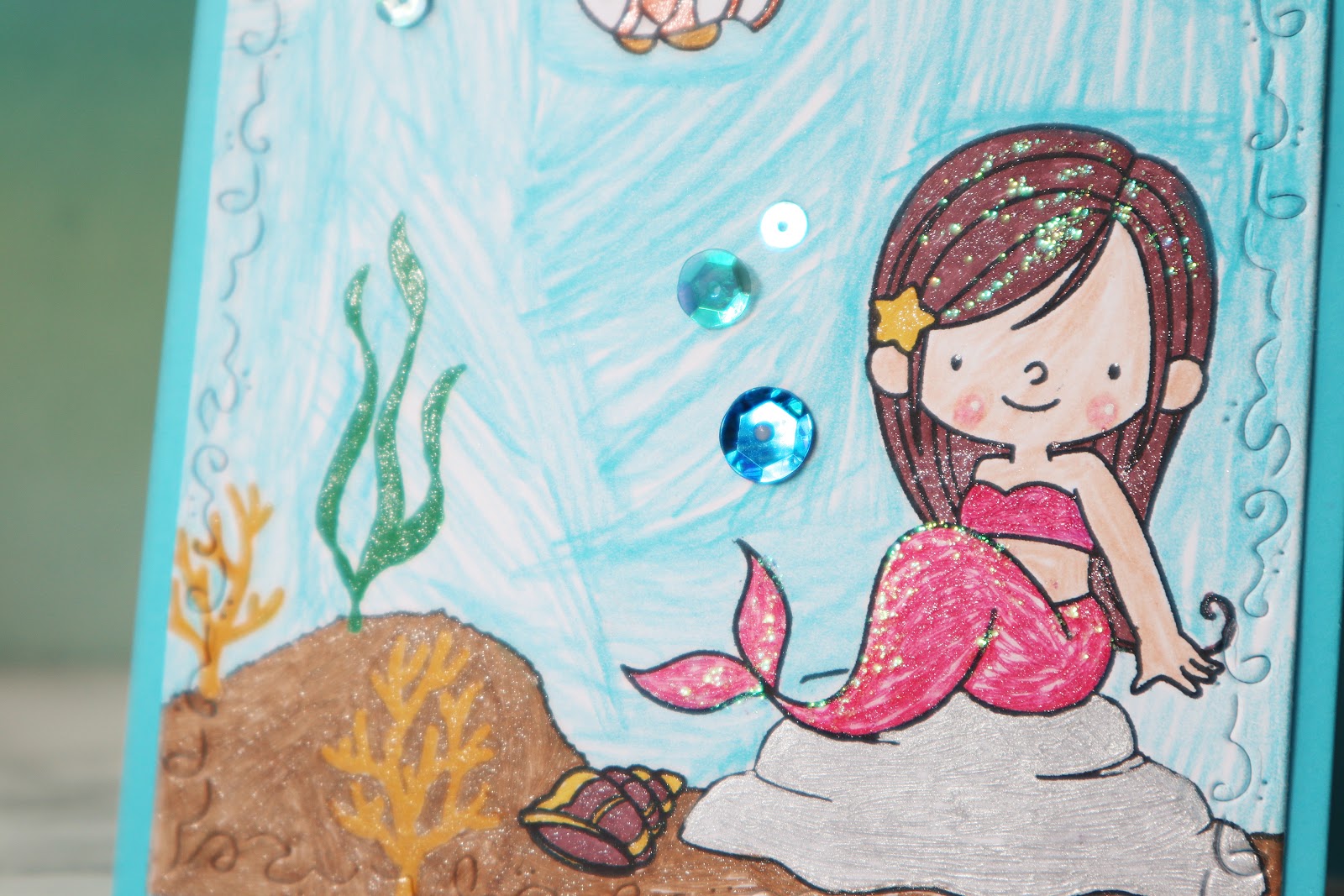 She chose one of her favorite stamps, Mermazing by MFT. She did stamping, masking and coloring all by herself to create the one layer underwater scene. As the theme of the challenge is “Anything Goes with Sparkle”, she used glitter gel pen along with colored pencils to color the image and lots of Crystal Stickles went over the mermaid and sea critters! She even traced the sentiment with a blue glitter gel pen to add sparkle 🙂 !!!