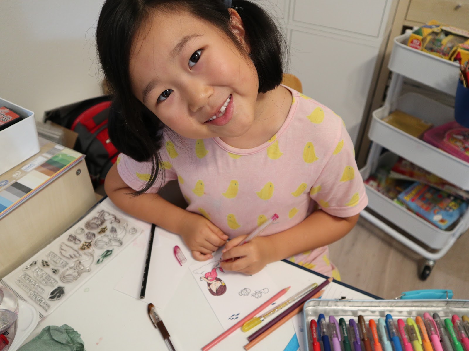 Today I want to share a cute mermaid card which my little girl Yerin (7yo) has made for Simon Says Stamp Kids Summer Vacation Challenge. She loves giving me helping hands when I make cards and enjoys making her own cards in my craft room.