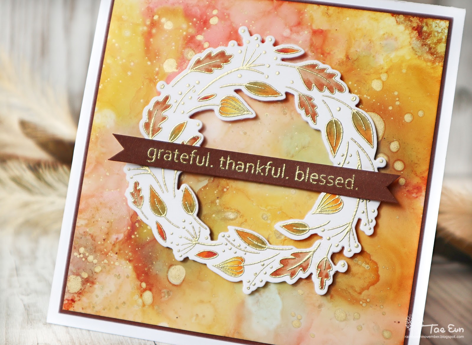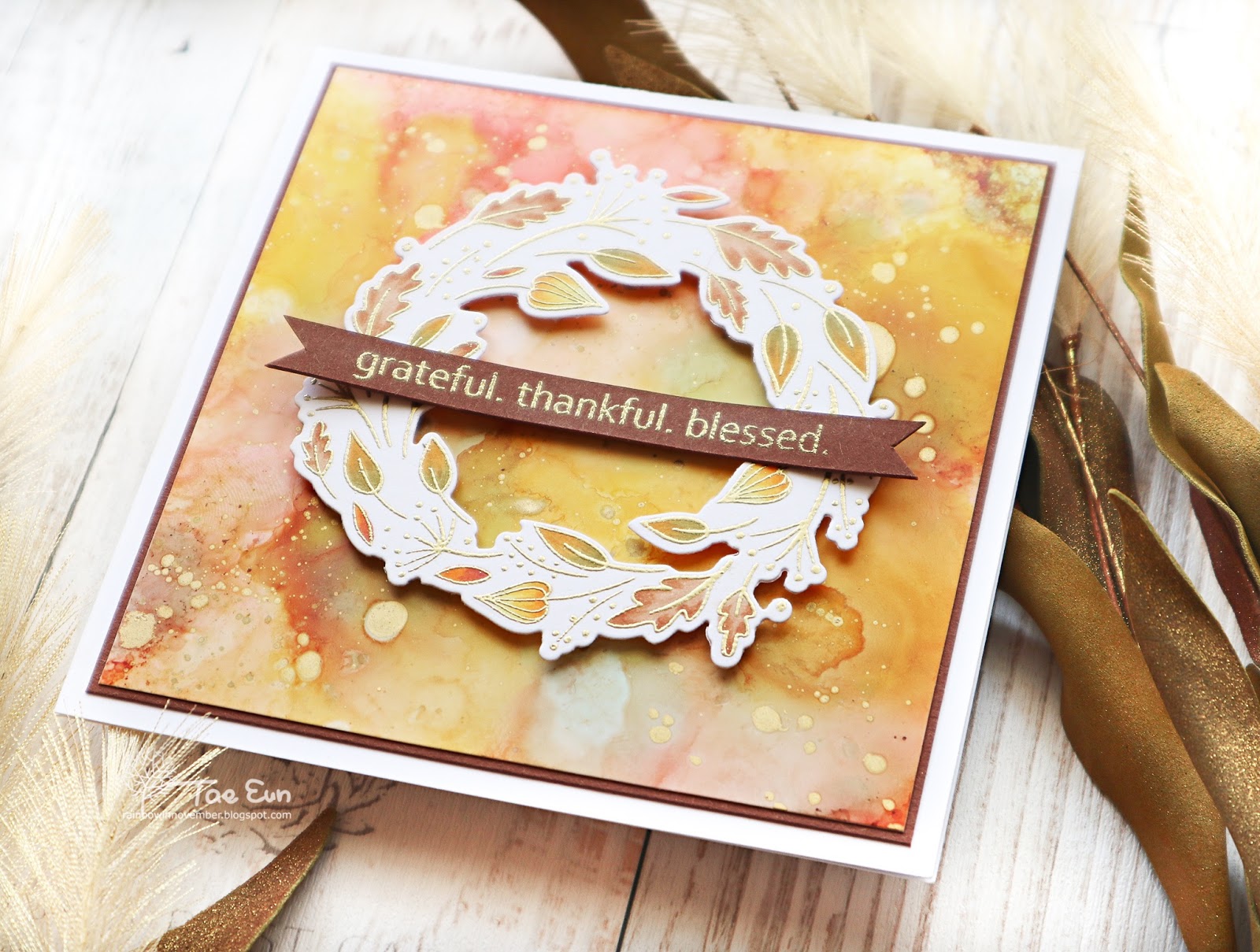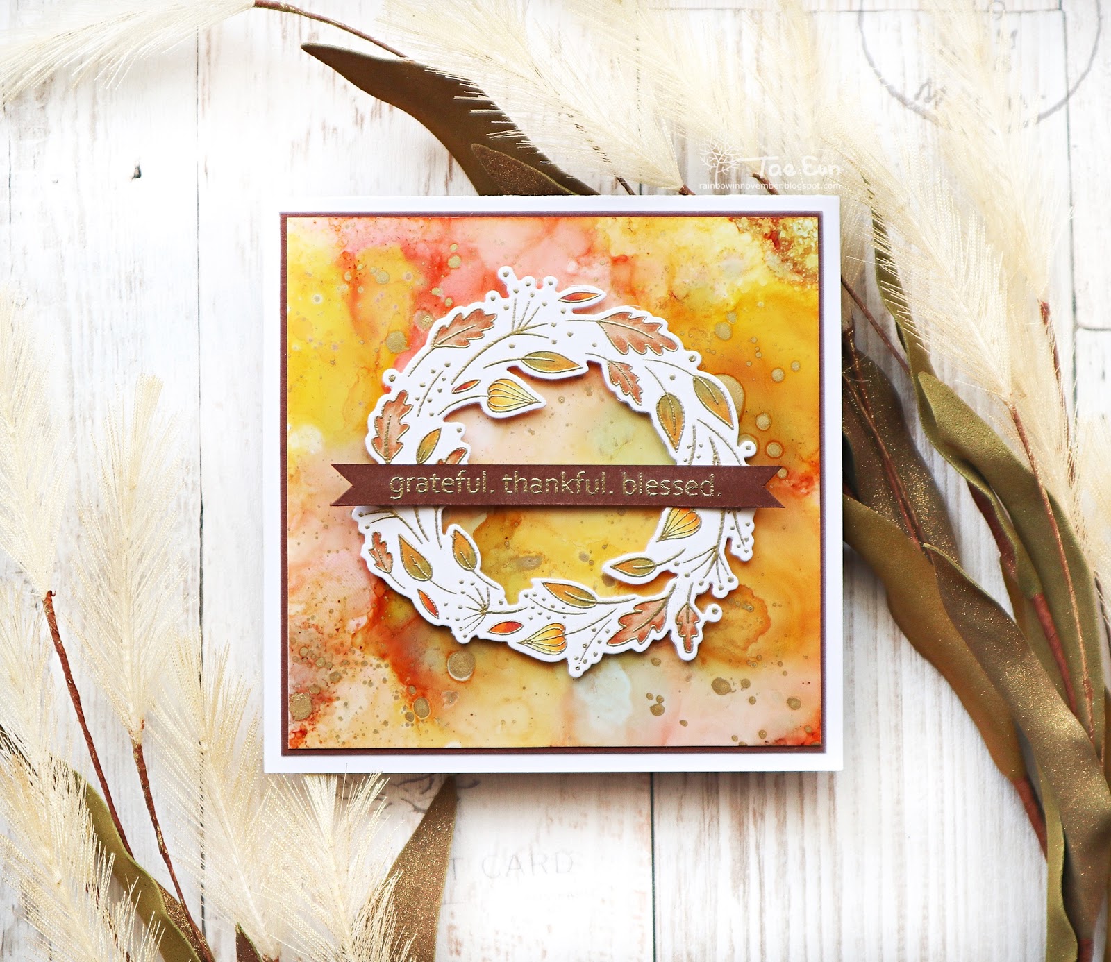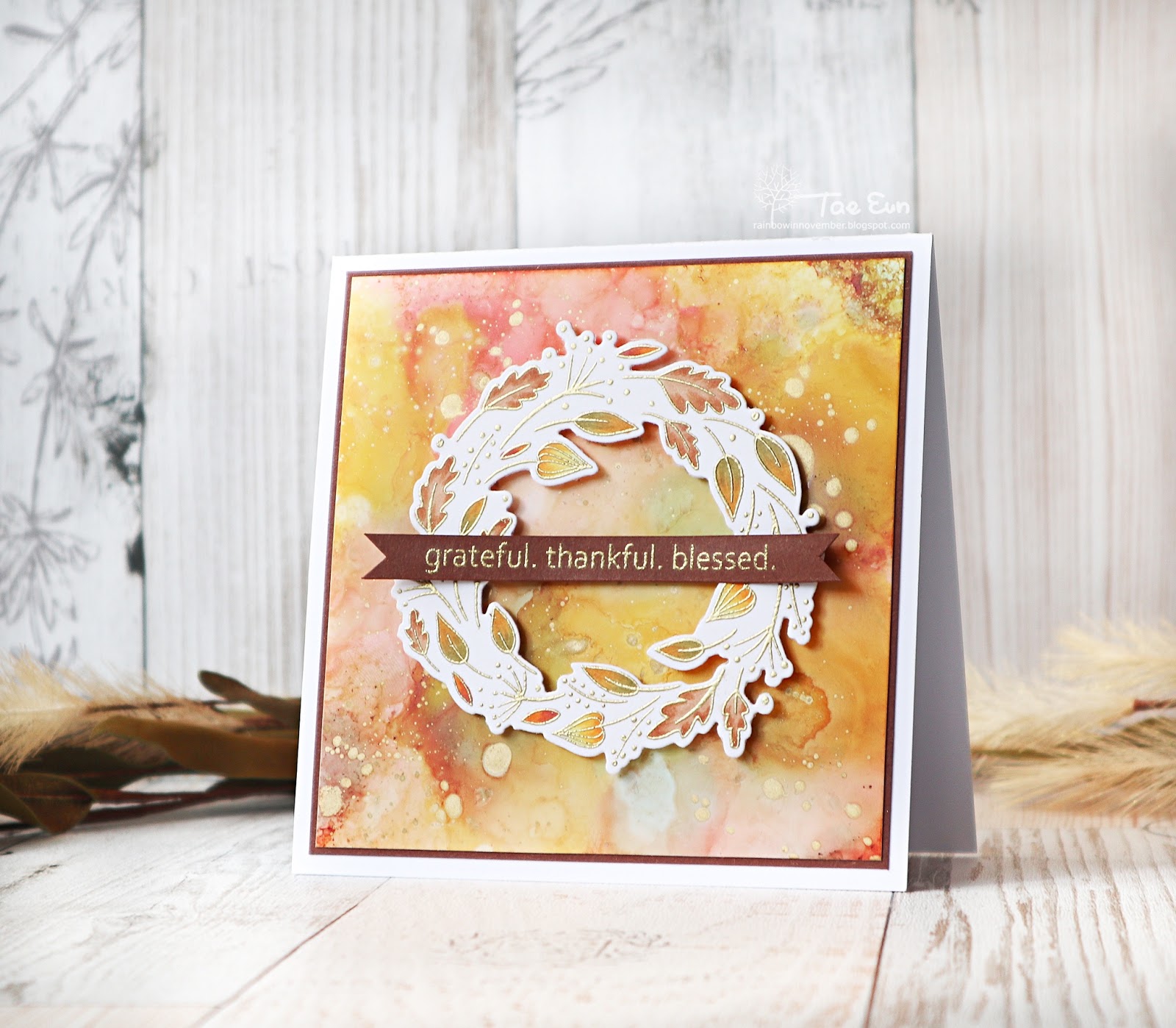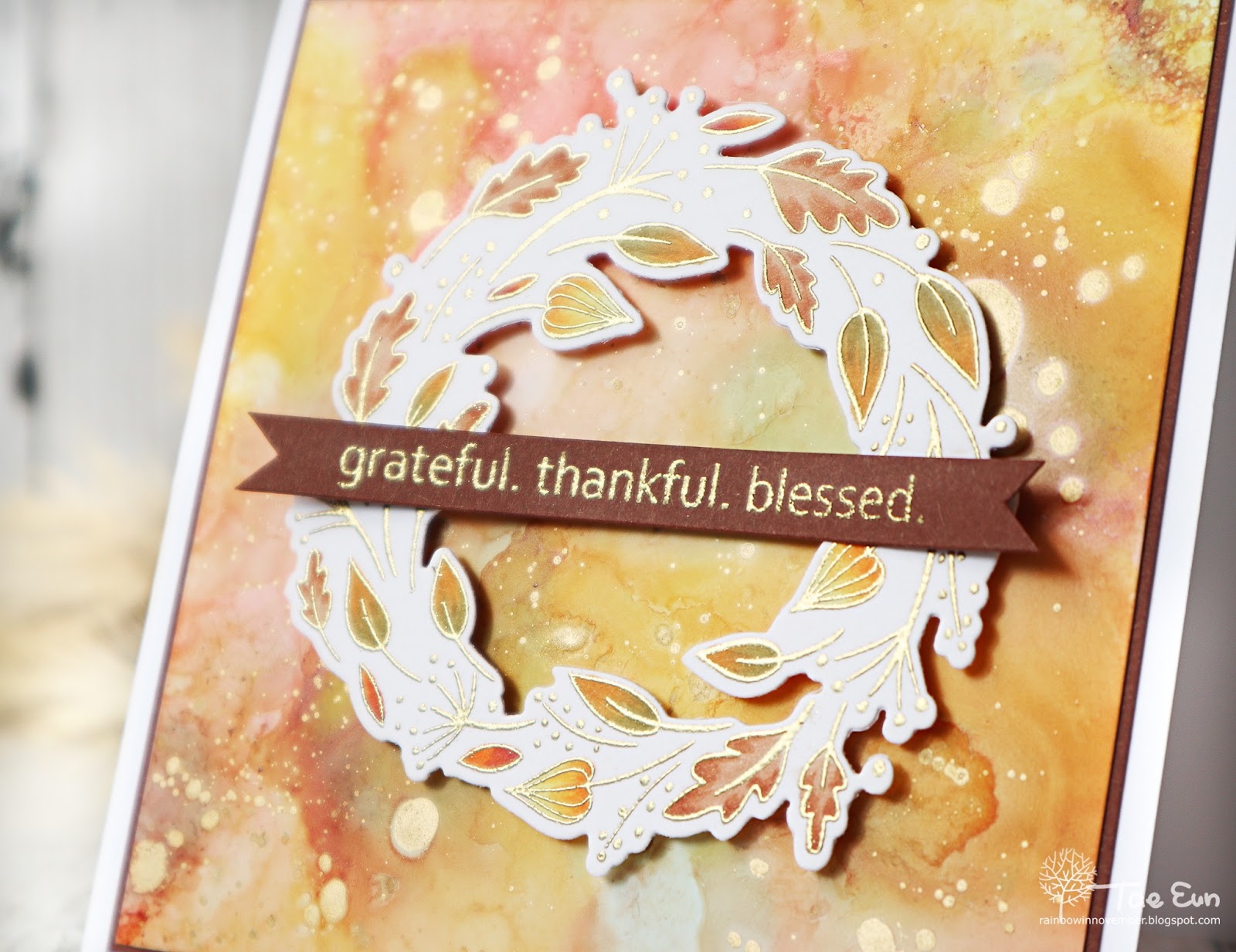 I cut the background Yupo panel in a square, matted it with a dark brown square panel and added them on a white cardbase. The wreath was foam mounted on it. The sentiment was gold heat embossed on a strip of the same dark brown cardstock I used for the background, and added onto the card.