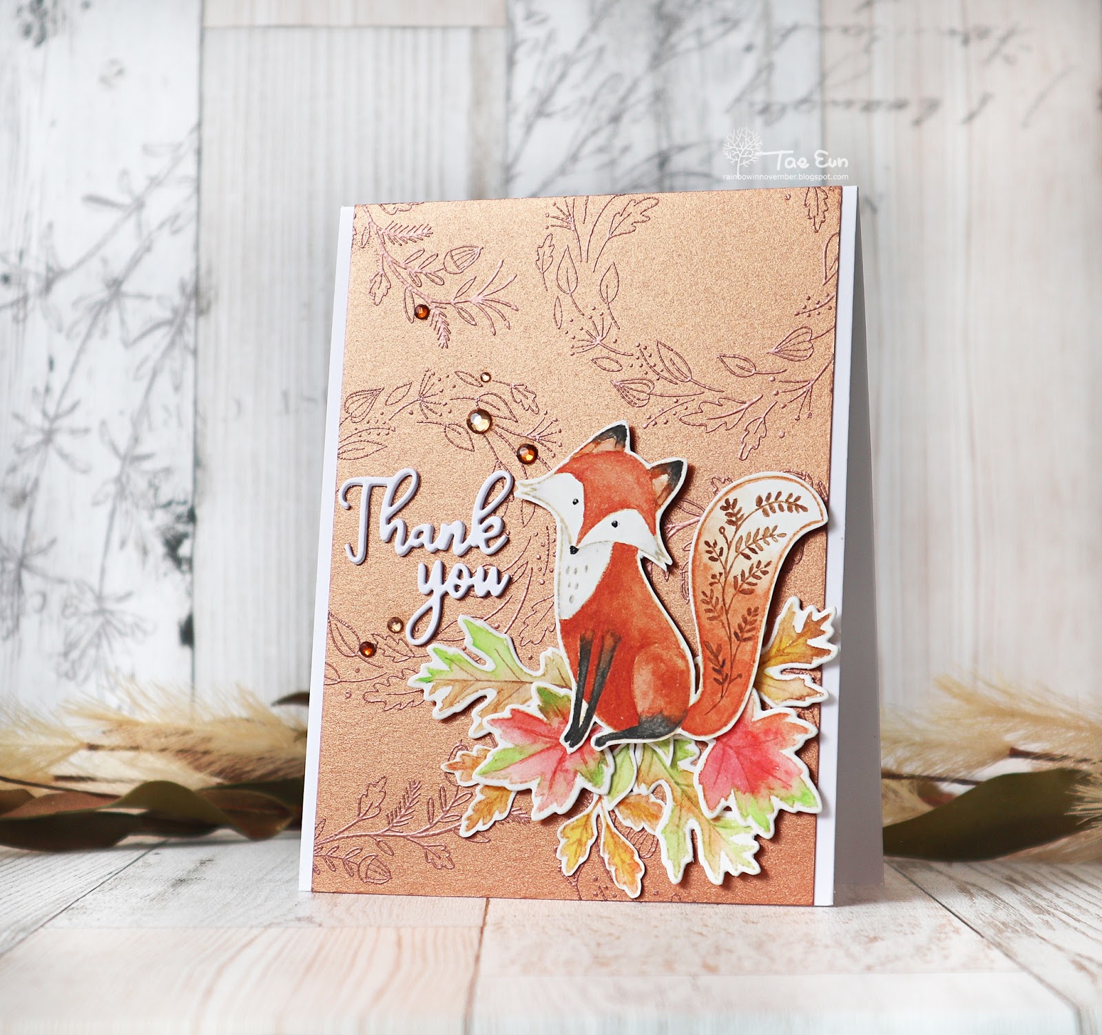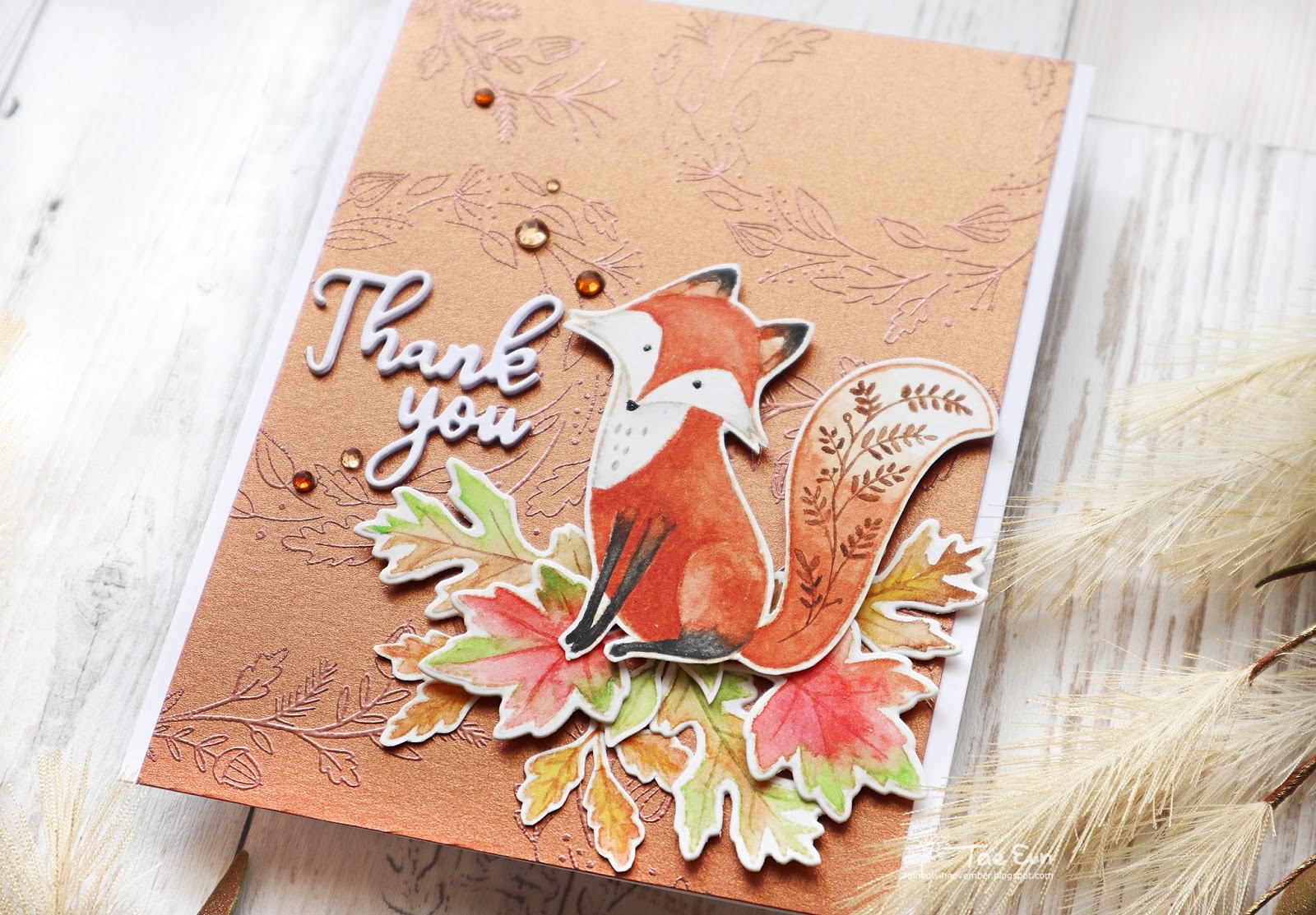 I mounted the slightly narrowed background panel on a white cardbase and arranged the leaves to put the fox on them. The die for the sentiment is from Blushing Cut Out (51-536). I cut the sentiment three times from some white cardstock and added it onto the card. I finished off the card by adding some gold and bronze rhinestones.