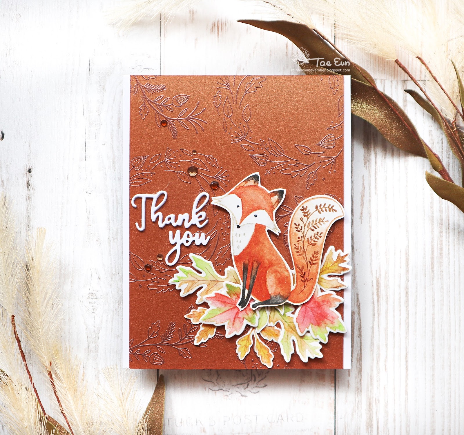 This is my first card. I did some no line coloring on the beautiful fox and leaves from Acorn and Animals (30-599) and Autumn Bliss (30-600) and placed them on a shiny copper base.