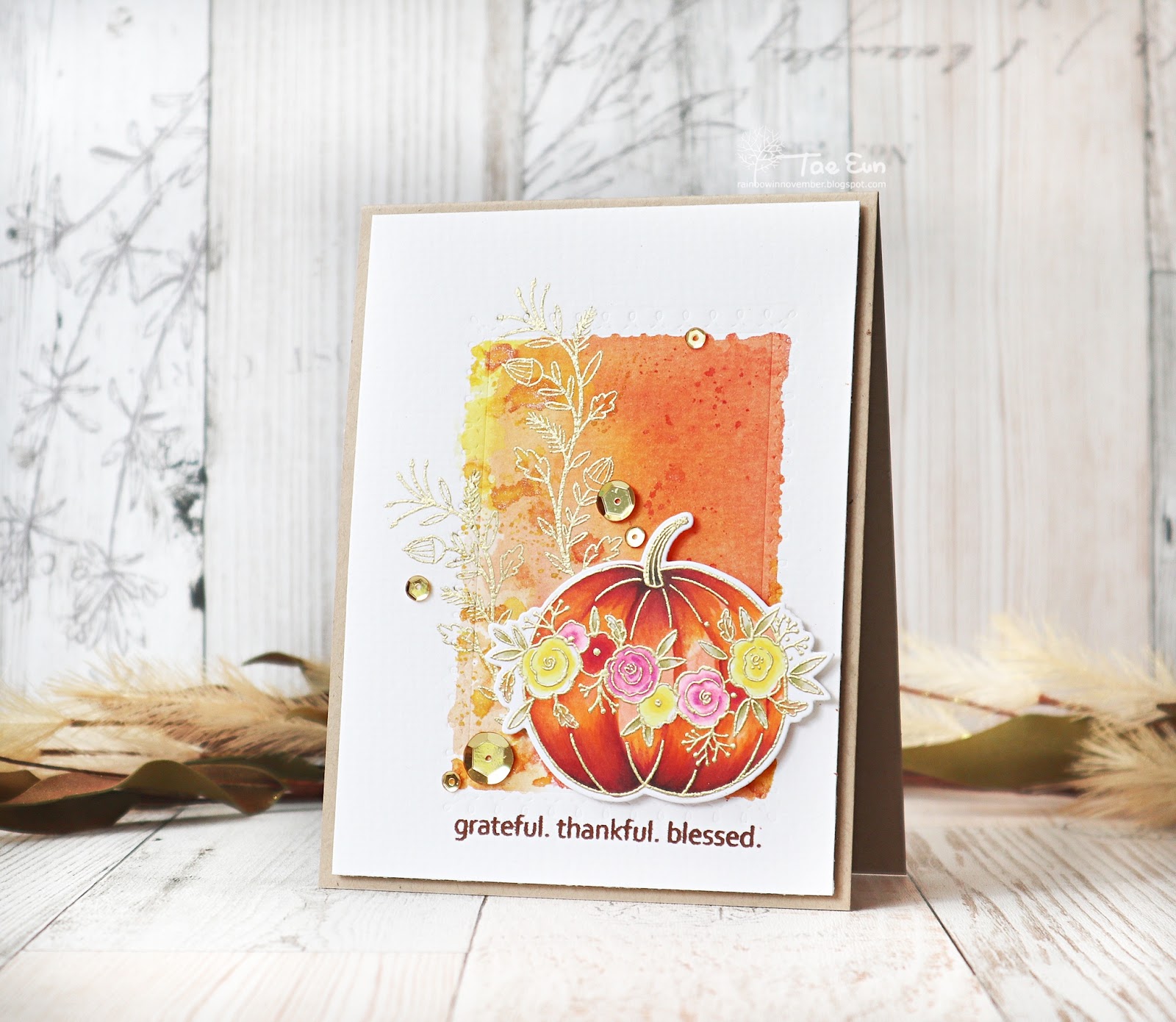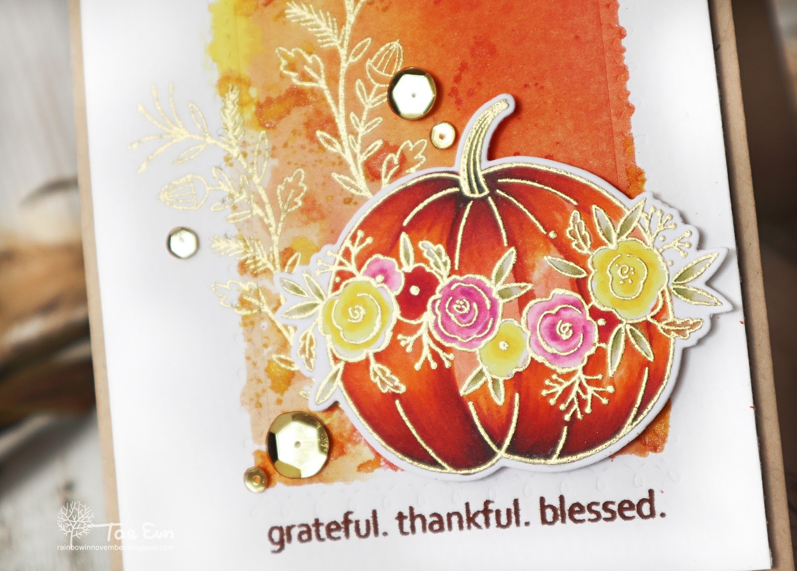 I stamped the pumpkin on a solar white paper in light brown ink and colored it using Copic markers. After the coloring was done I gold heat embossed the image again with the help of MISTI tool and cut it using the coordinating die.
