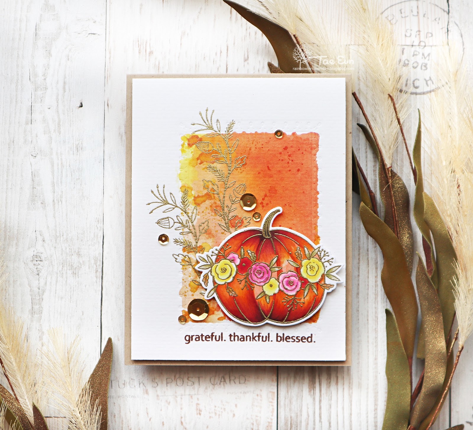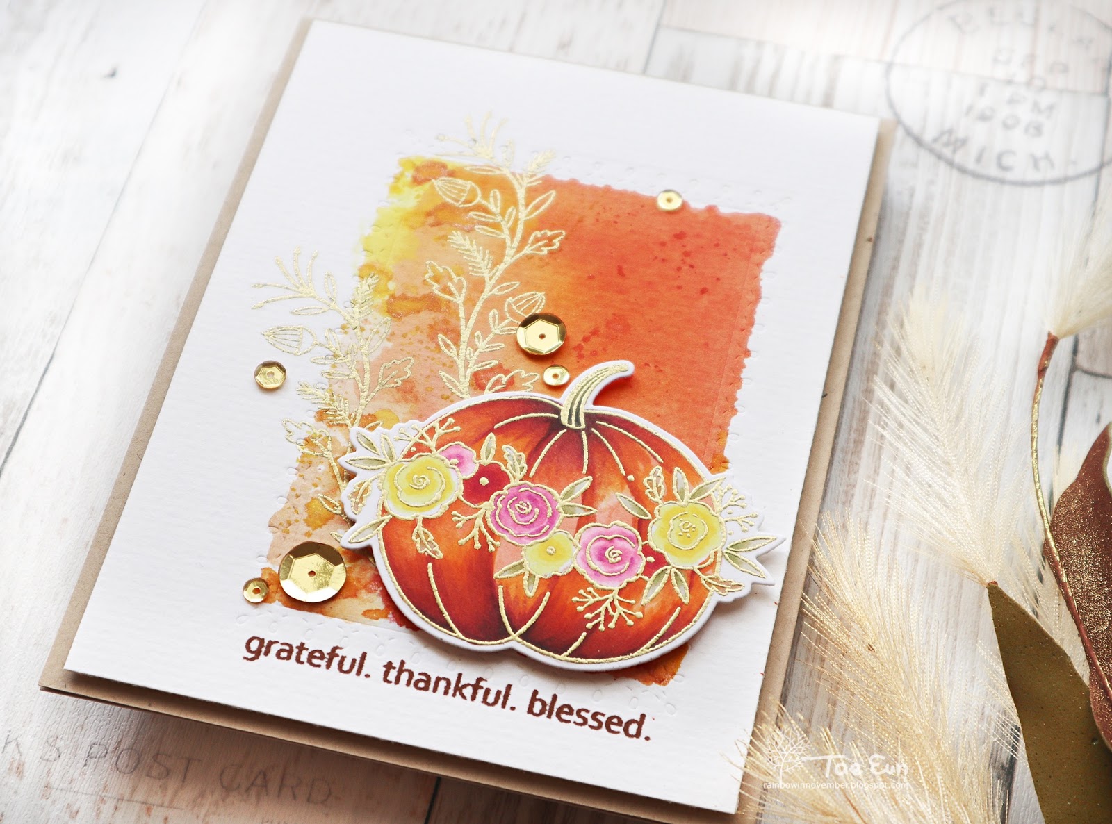 I foam mounted the background panel on a kraft cardbase and added the pumpkin on it using some foam adhesives. Some Medallion Gold sequins by The Ton were my finishing touch.