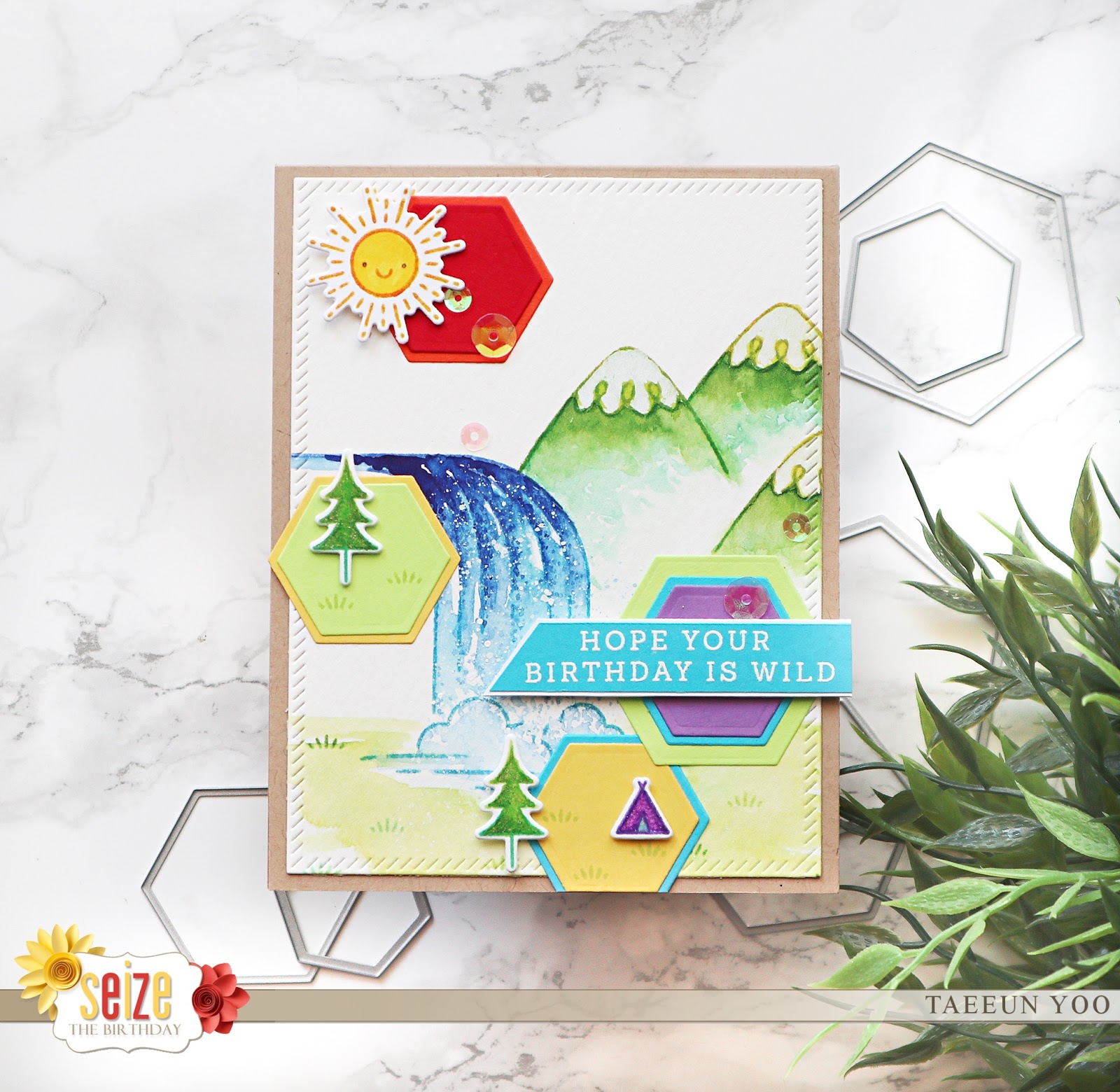 I cut the colored panel using Essentials: Diagonal Stitched Rectangles die and mounted it flat on a kraft cardbase. I cut several hexagons using the hexagon dies from Basic Label Frames die set from cardstocks in rainbow colors. I stacked the hexagons and added them onto the card.