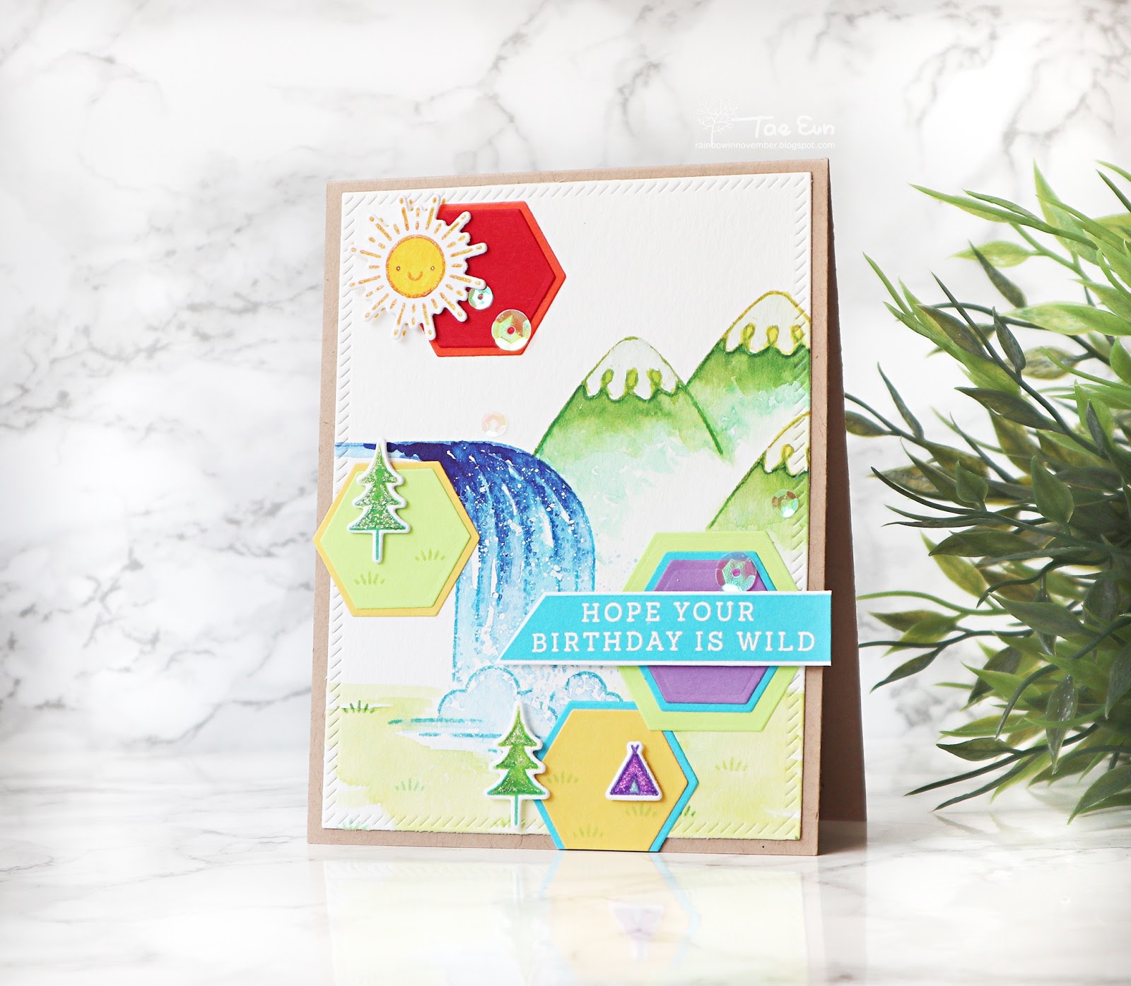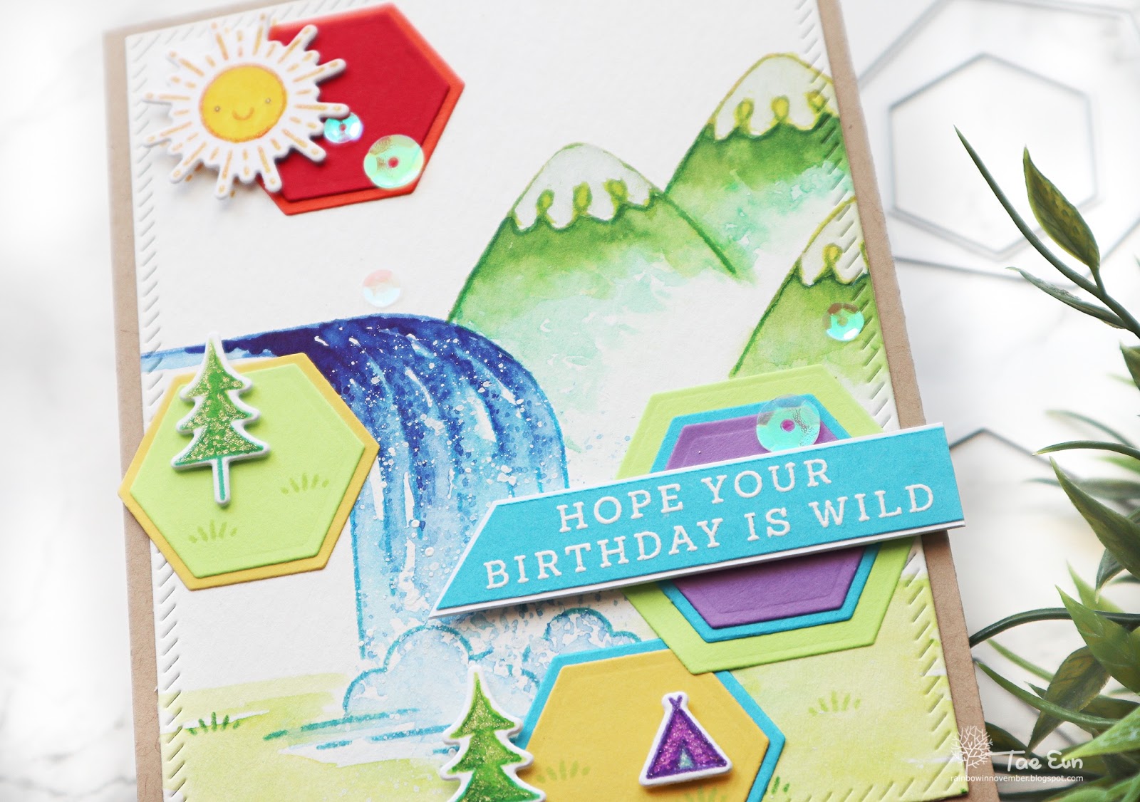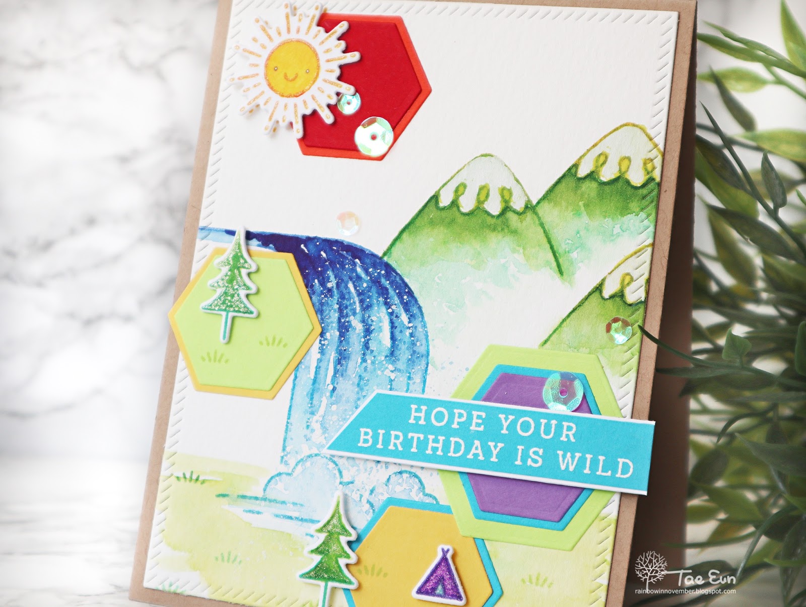 I started off by stamping the waterfall and mountains in blue and green DIs respectively on a Canson watercolor paper panel. I also stamped the sun, a tent and trees on a separate watercolor paper.