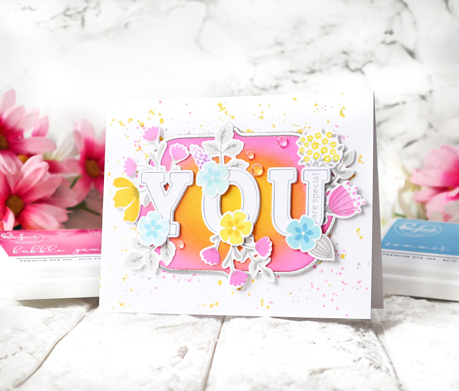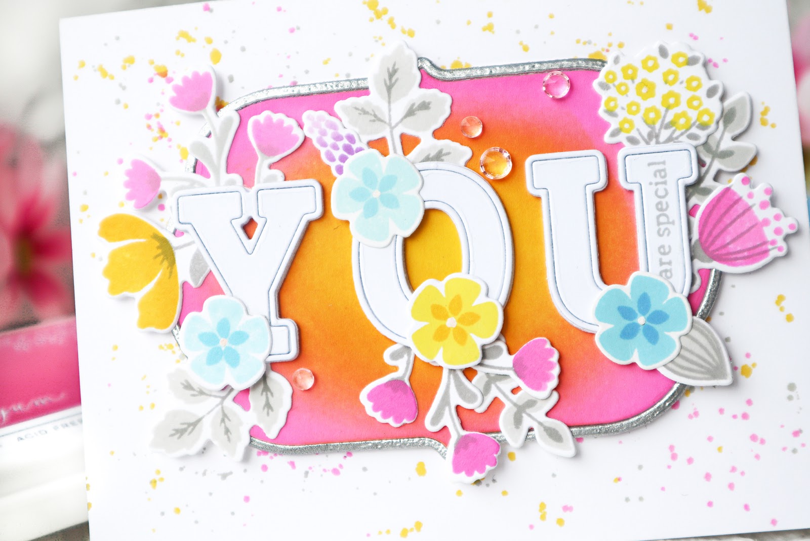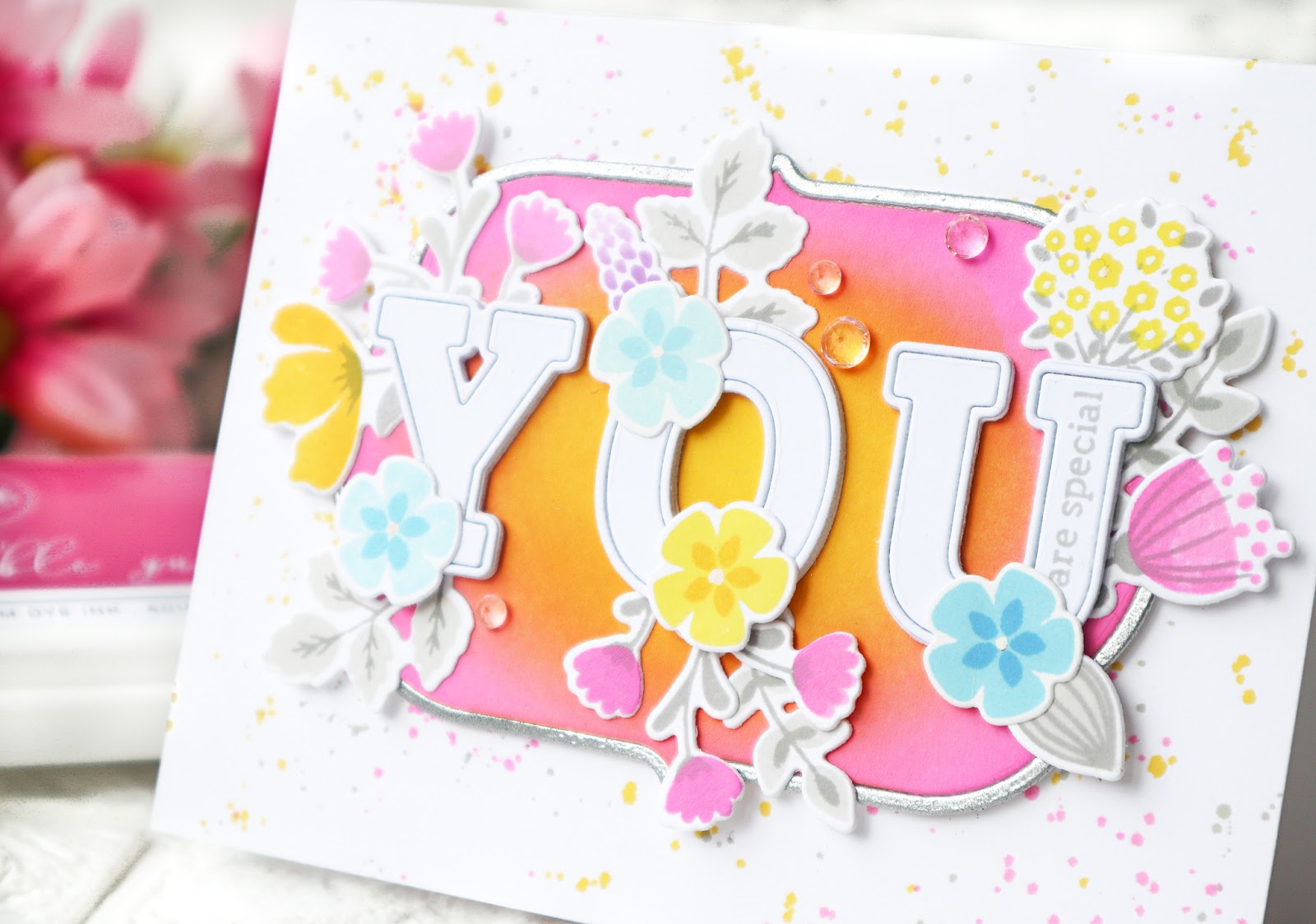 I foam mounted the ink blended piece with the silver frame on the cardbase. The letters were cut using Adore Alpha die set four times from white cardstock and stacked all together. I arranged the little florals around the letters and glued them as shown in the picture.