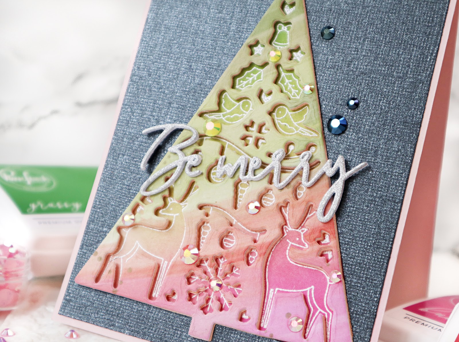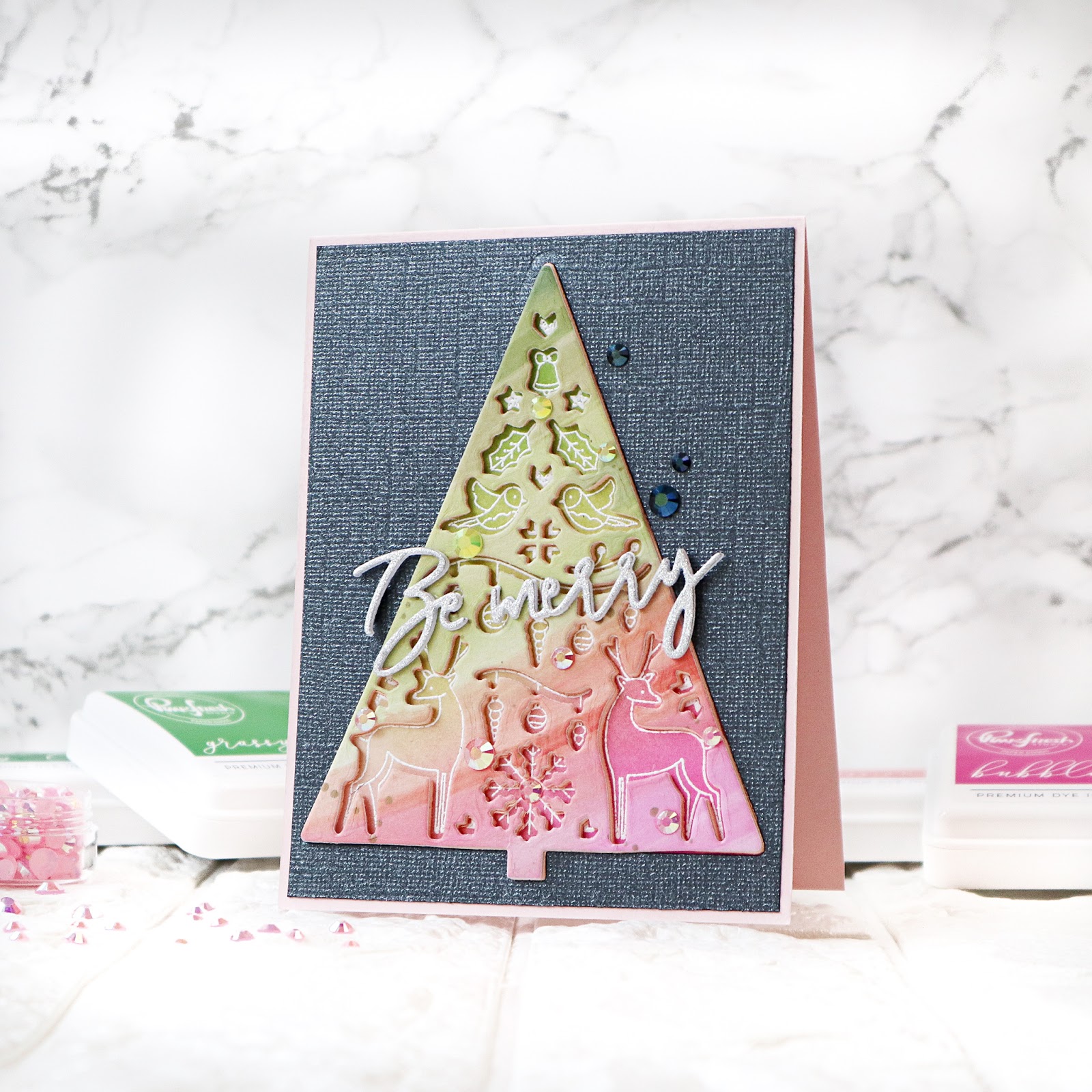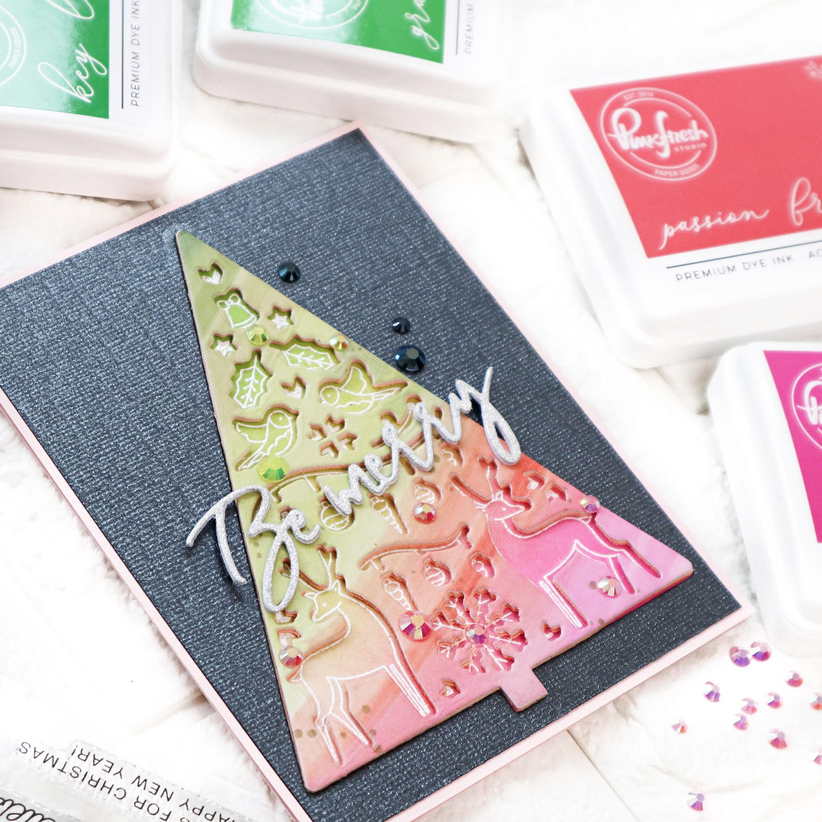I adhered the die cut Merry Days tree from pink foam and Rainbow with Splatters washi on the cardbase aligning with the white heat embossed image and added the negative black panel to the card. I die cut the words from silver glitter and white cardstock using Classic Holiday Words die , stacked them together and adhered it on the card. I finished off the card by adding some pink, yellow and night blue jewels.