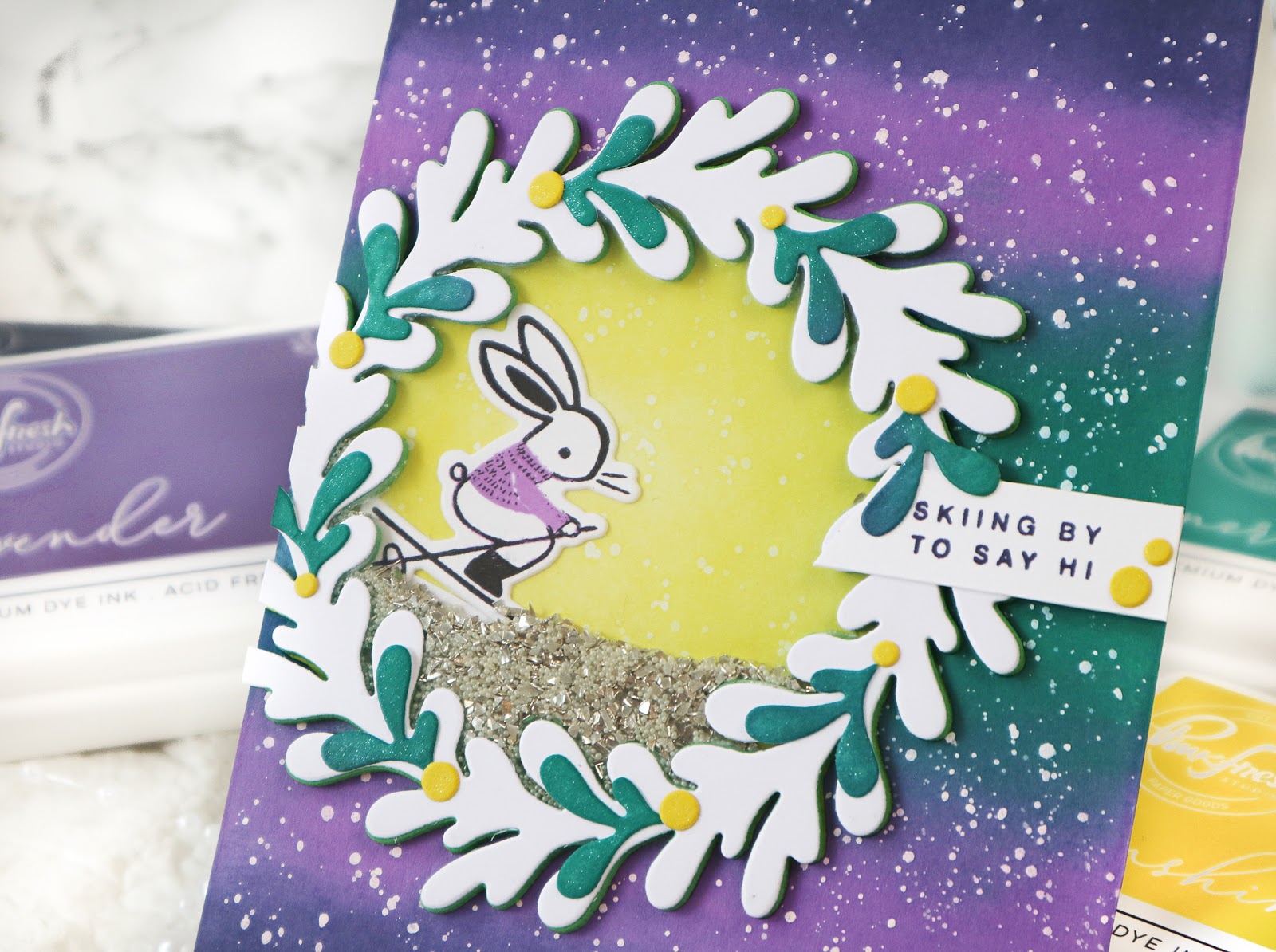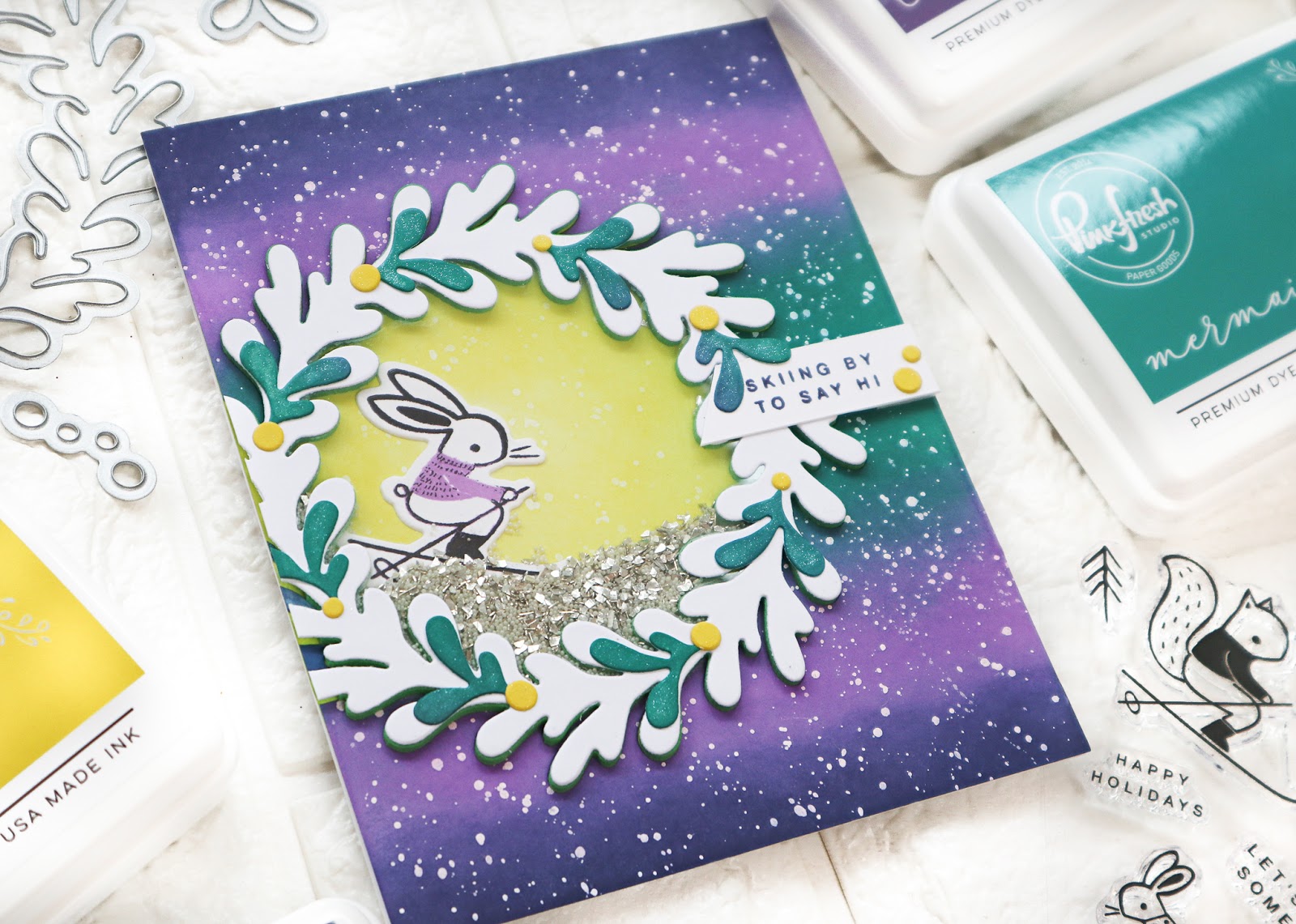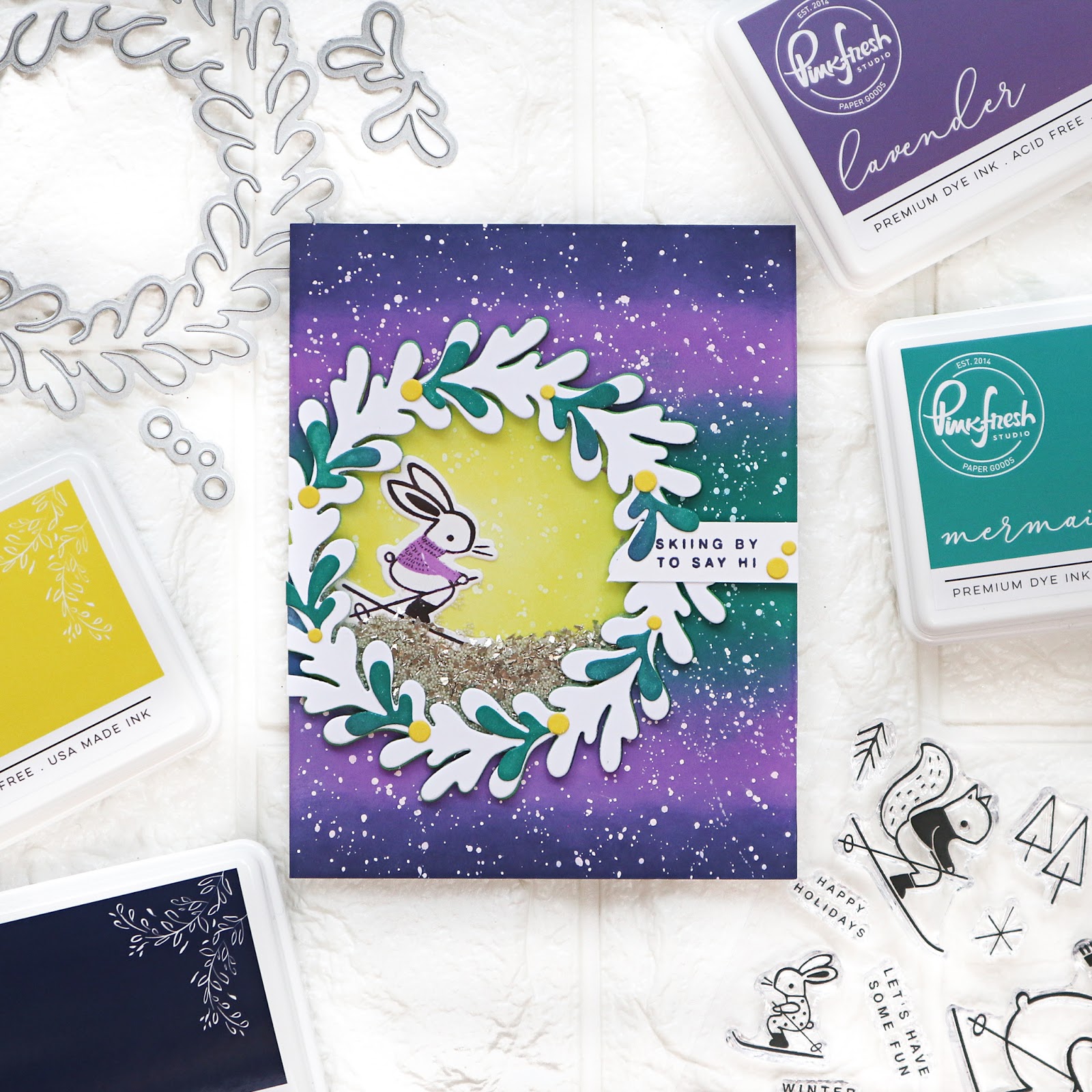For the first card I used Layered Wreath die and Skiing by stamp set from the recent Holiday Release. I tried a new-to-me color combination; purple, teal and yellow.