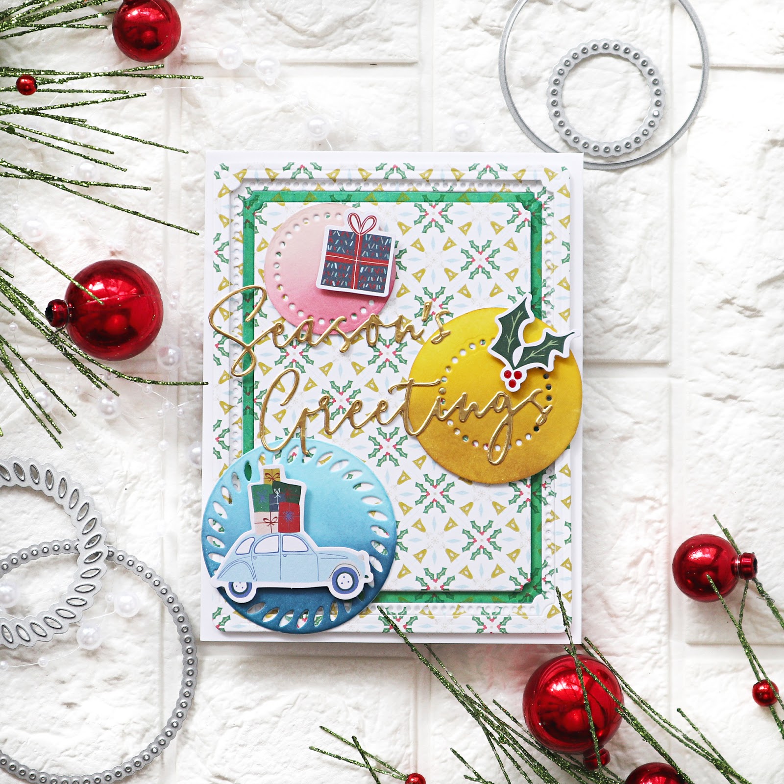 The gift, the holly berry and the car with stacked gifts are from the Globe Elements of Home for the Holidays collection. I adhered the circles on the card and added the cute holiday elements on the circles using foam adhesives.