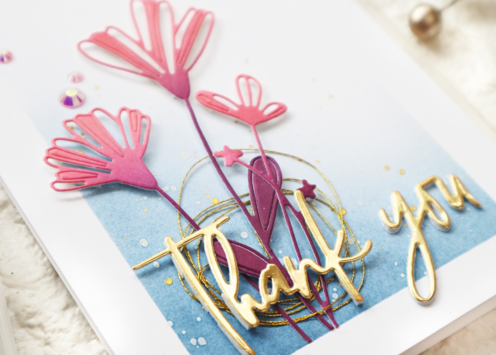 I cut the words “thank you” using Classic Words die set from a gold foil cardstock and from some white cardstock. I glued them together for more dimension.
