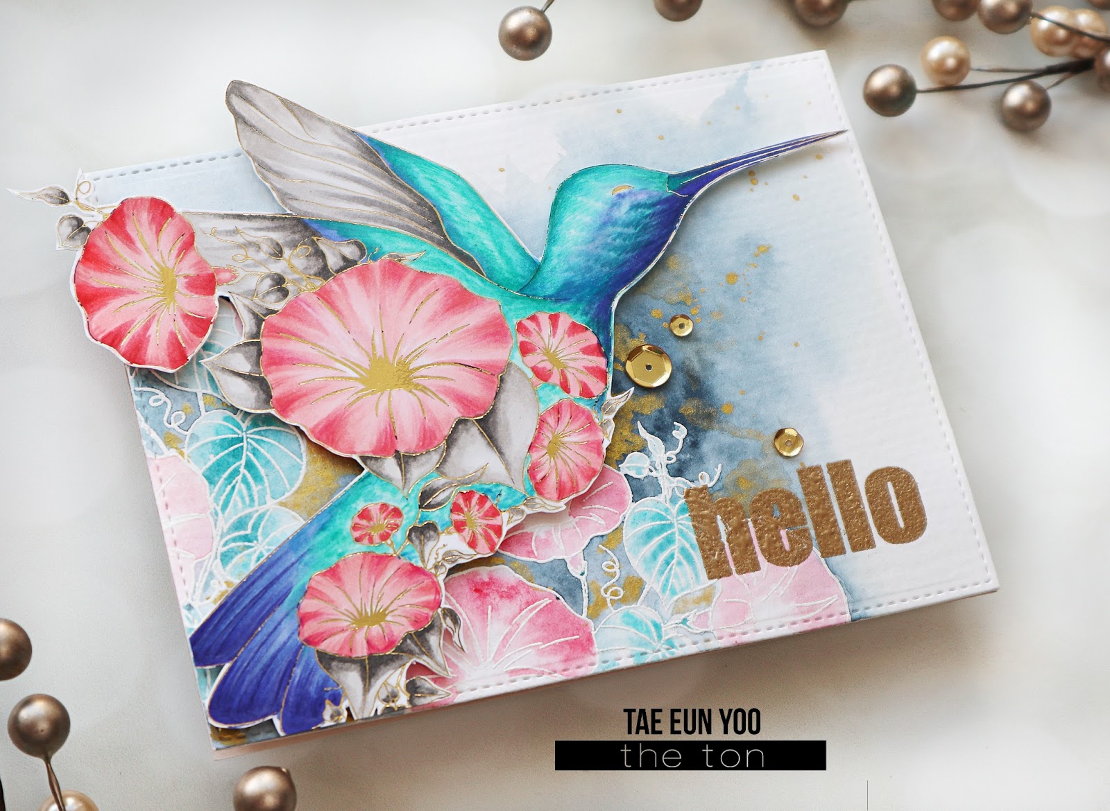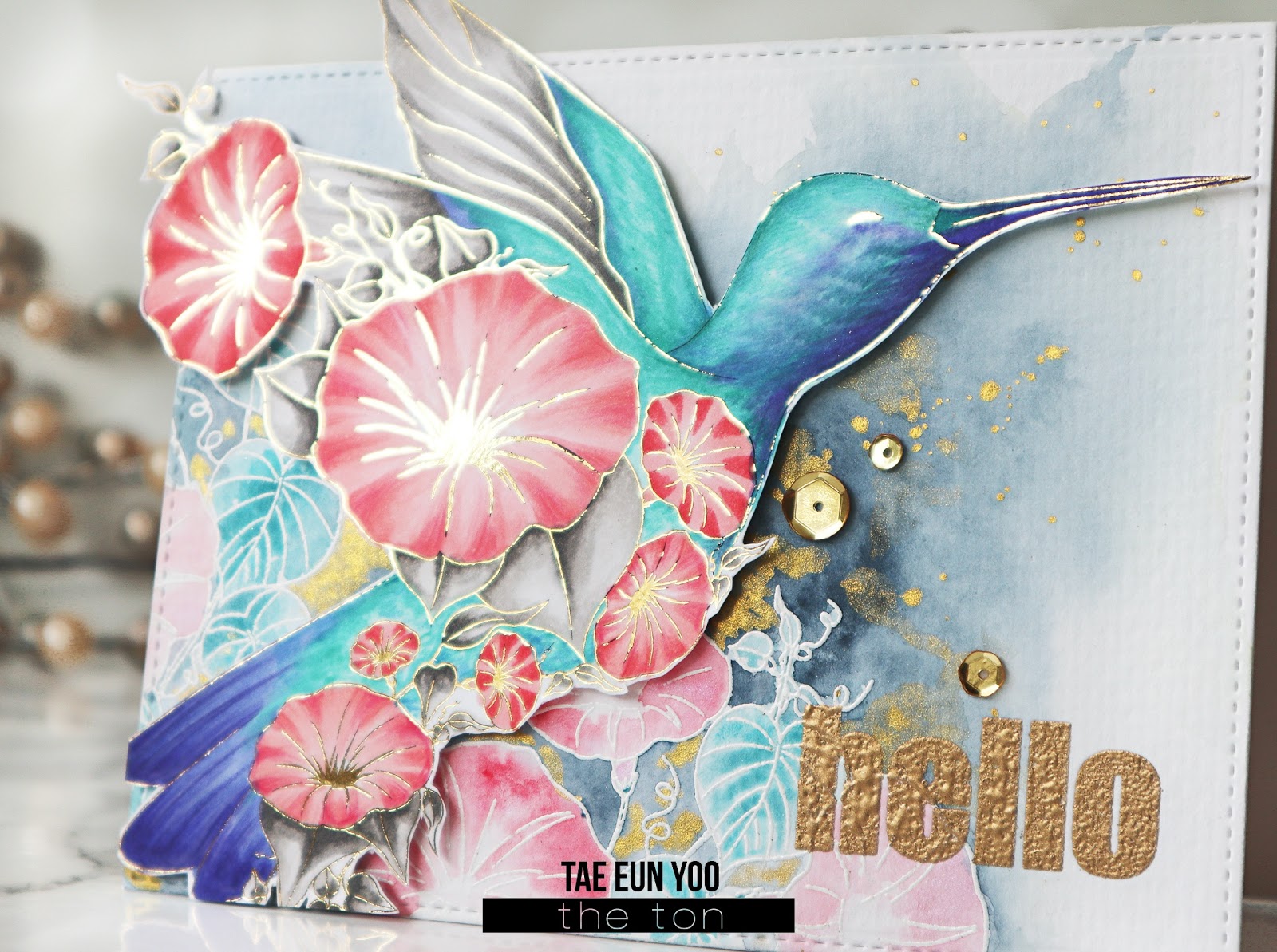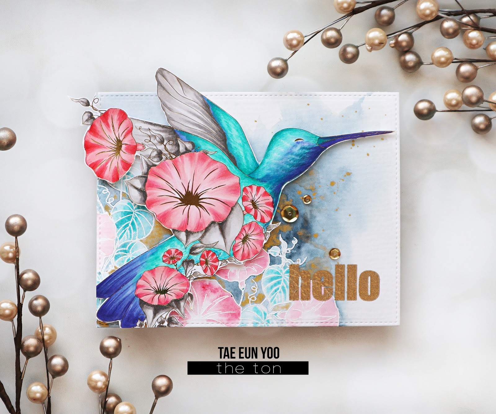 I printed the Transformation Hummingbird on a Neenah solar white paper and colored it using Copic markers. I chose teal, navy and gray to color the hummingbird and coral color for the morning glory flowers. I added details to the image using Polychromos colored pencils. After the coloring was completed I foiled the image in gold and fussy cut.