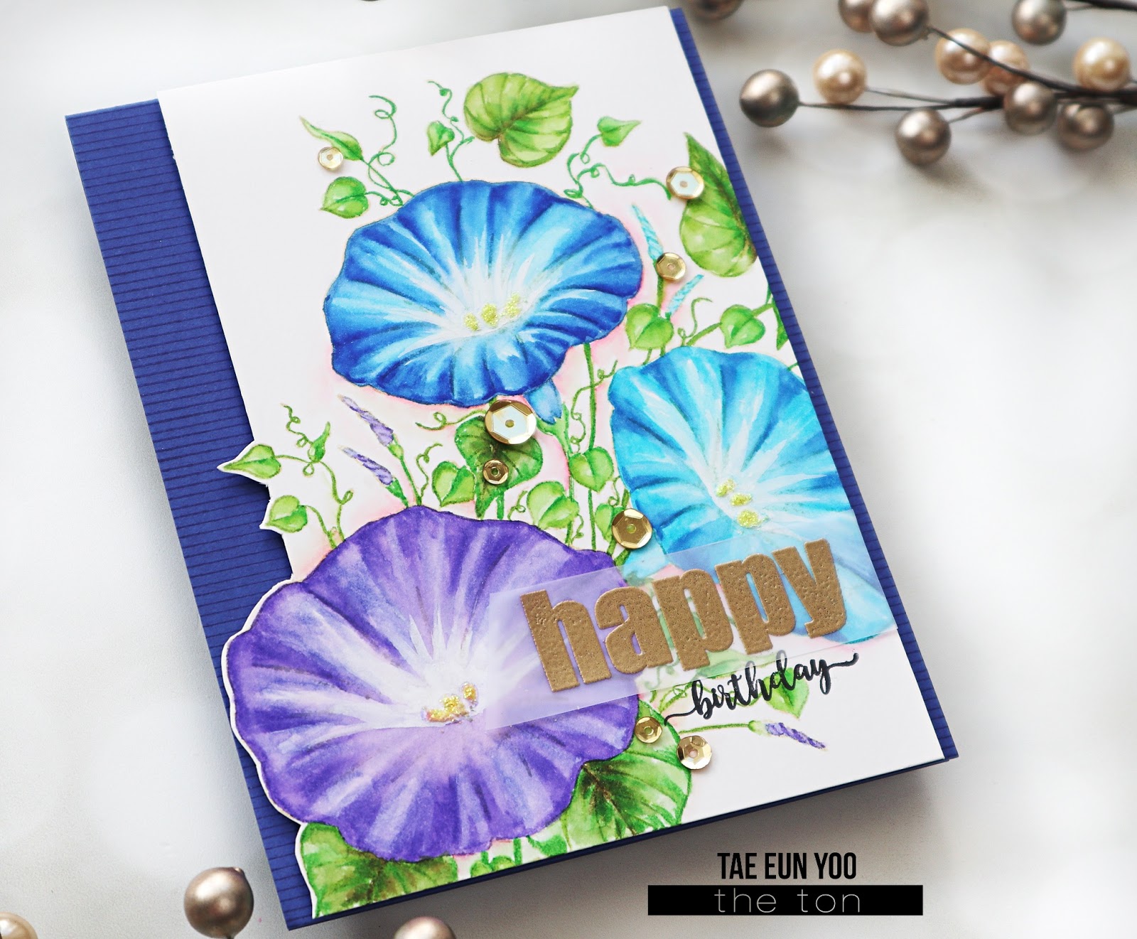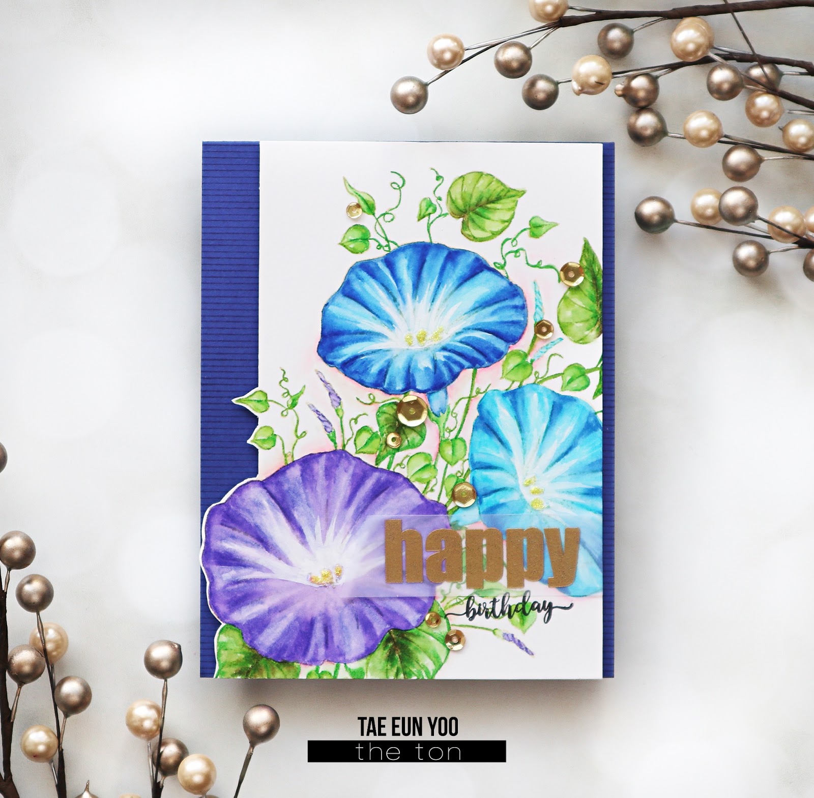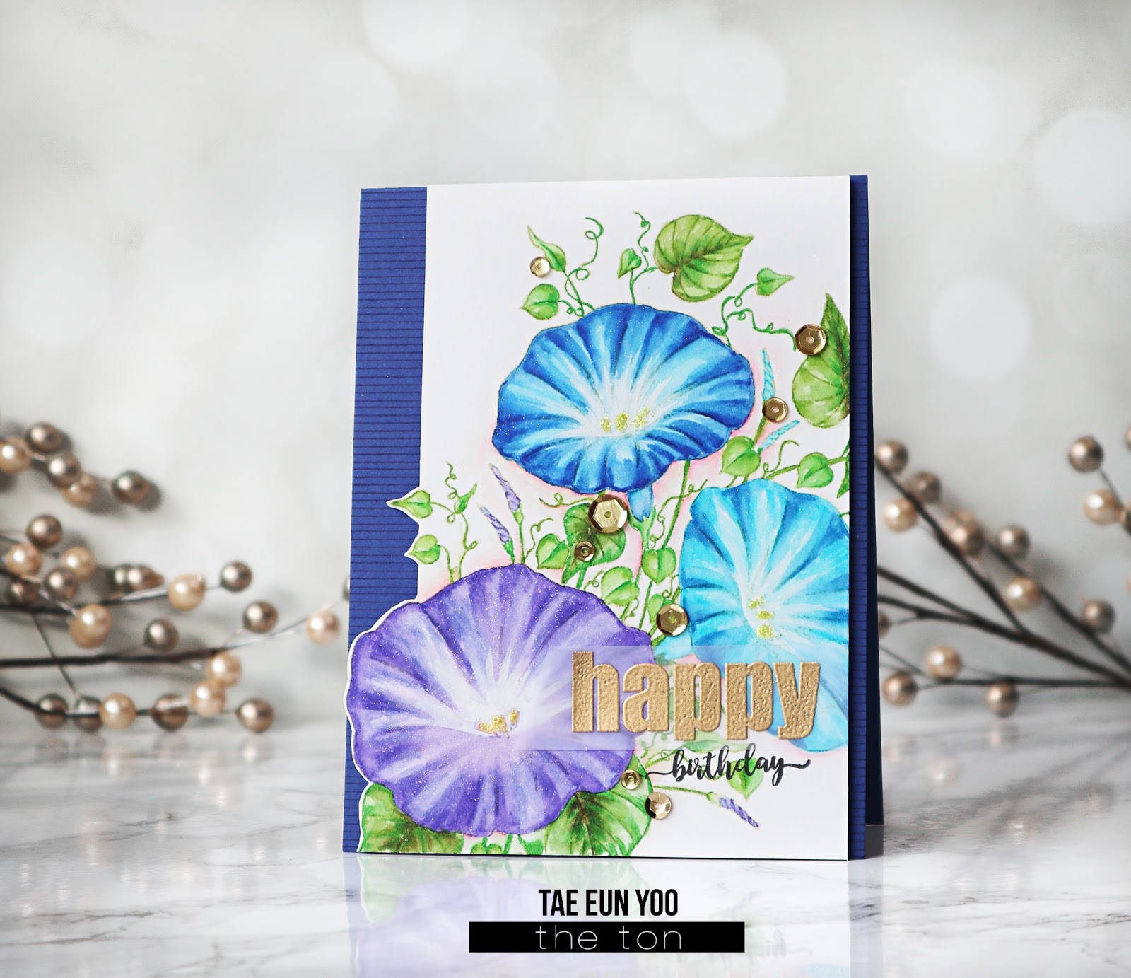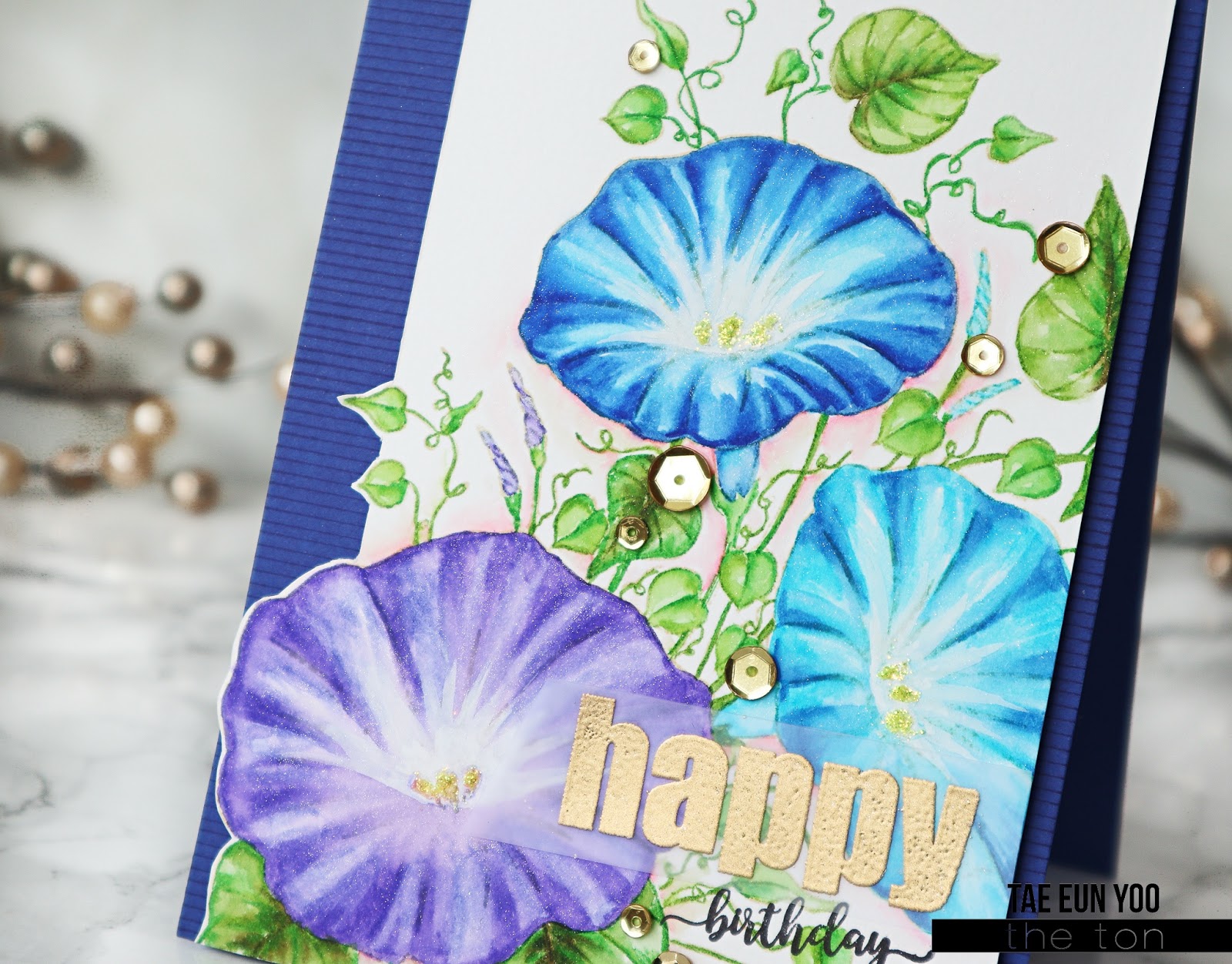 I stamped the Coming Up Morning Glories image in a light colored ink on a watercolor paper panel and colored it using Zig brush markers. I blended the colors with a clear glitter pen to add shimmer and sparkle! I colored the center of the flowers with a opaque white ink and added a little bit of pink to the background.