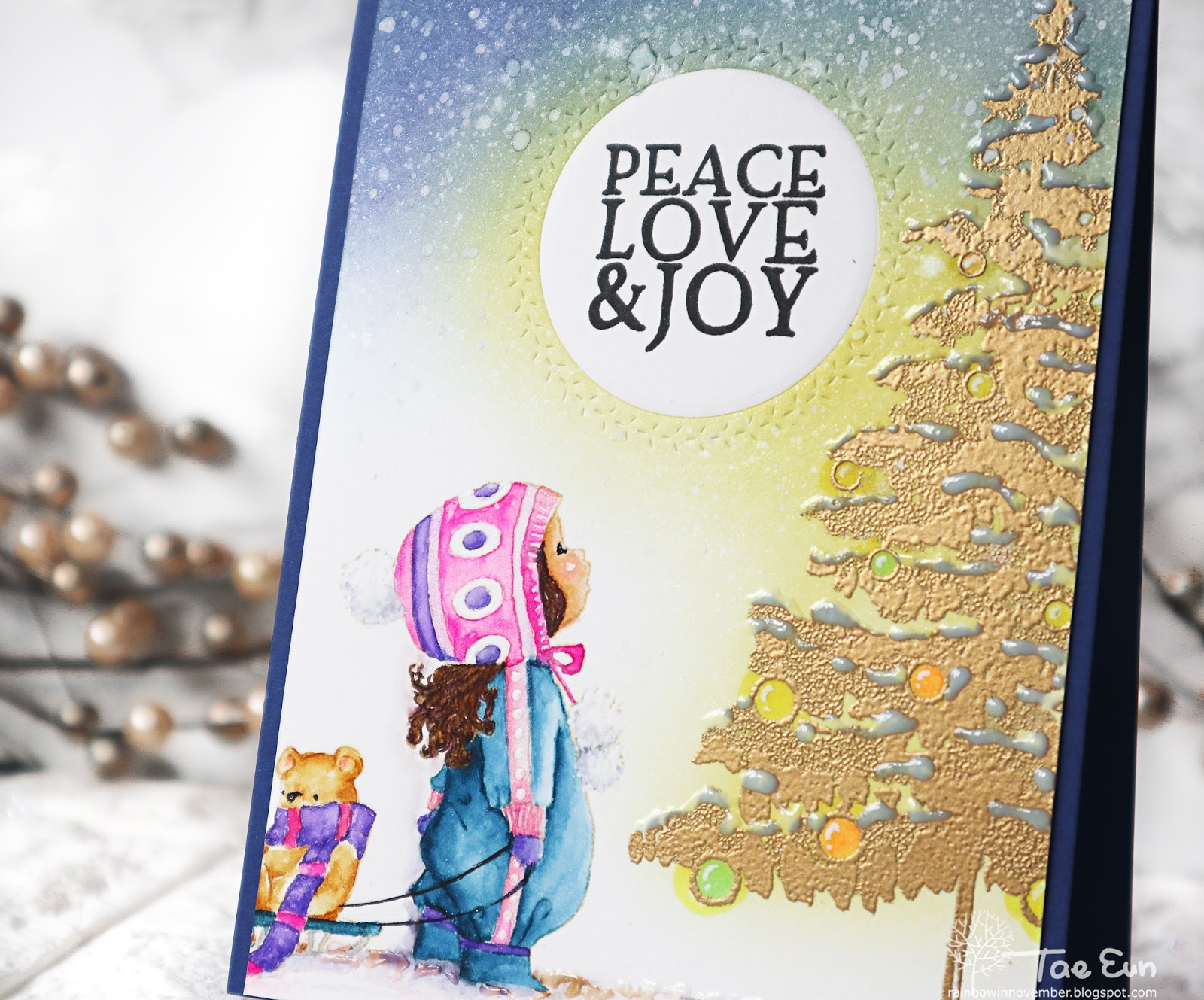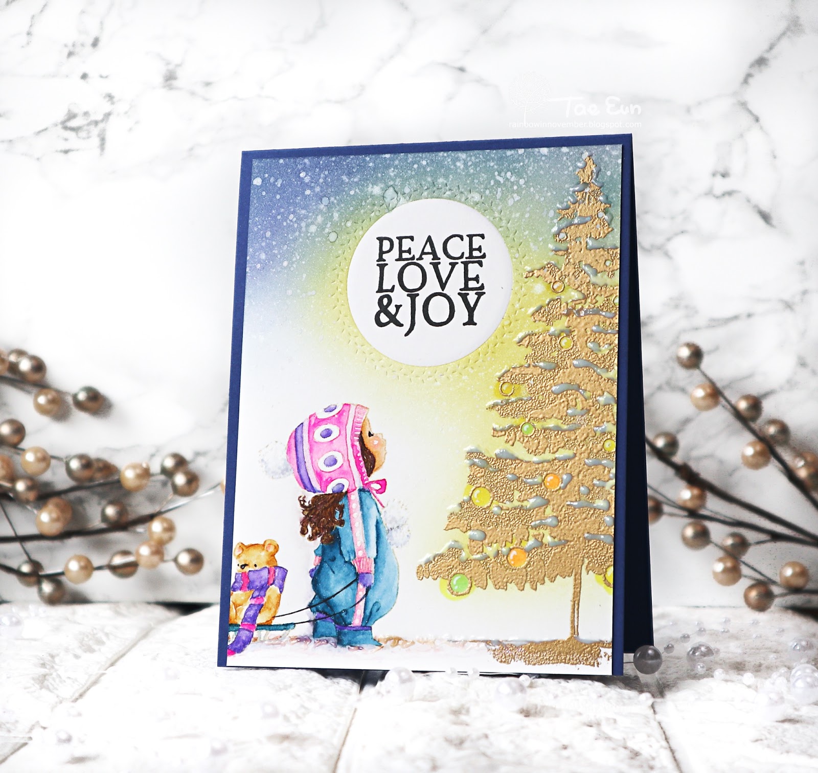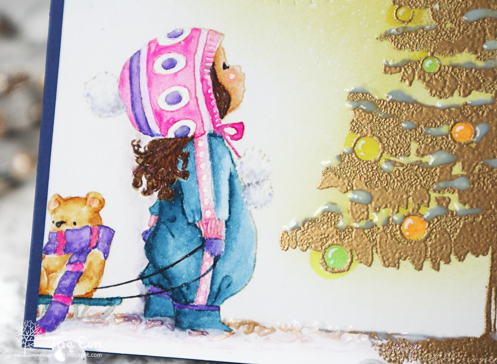 I narrowed down the panel slightly and added it to a navy cardbase. To add some snow, I applied white pico embellisher on the Christmas tree and on the ground.