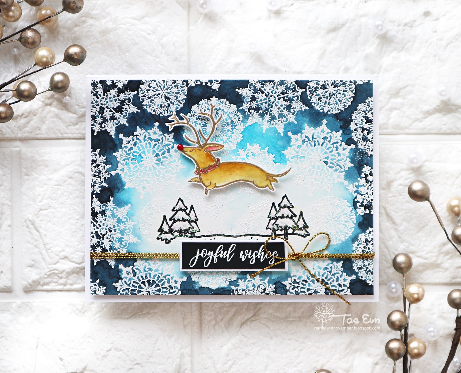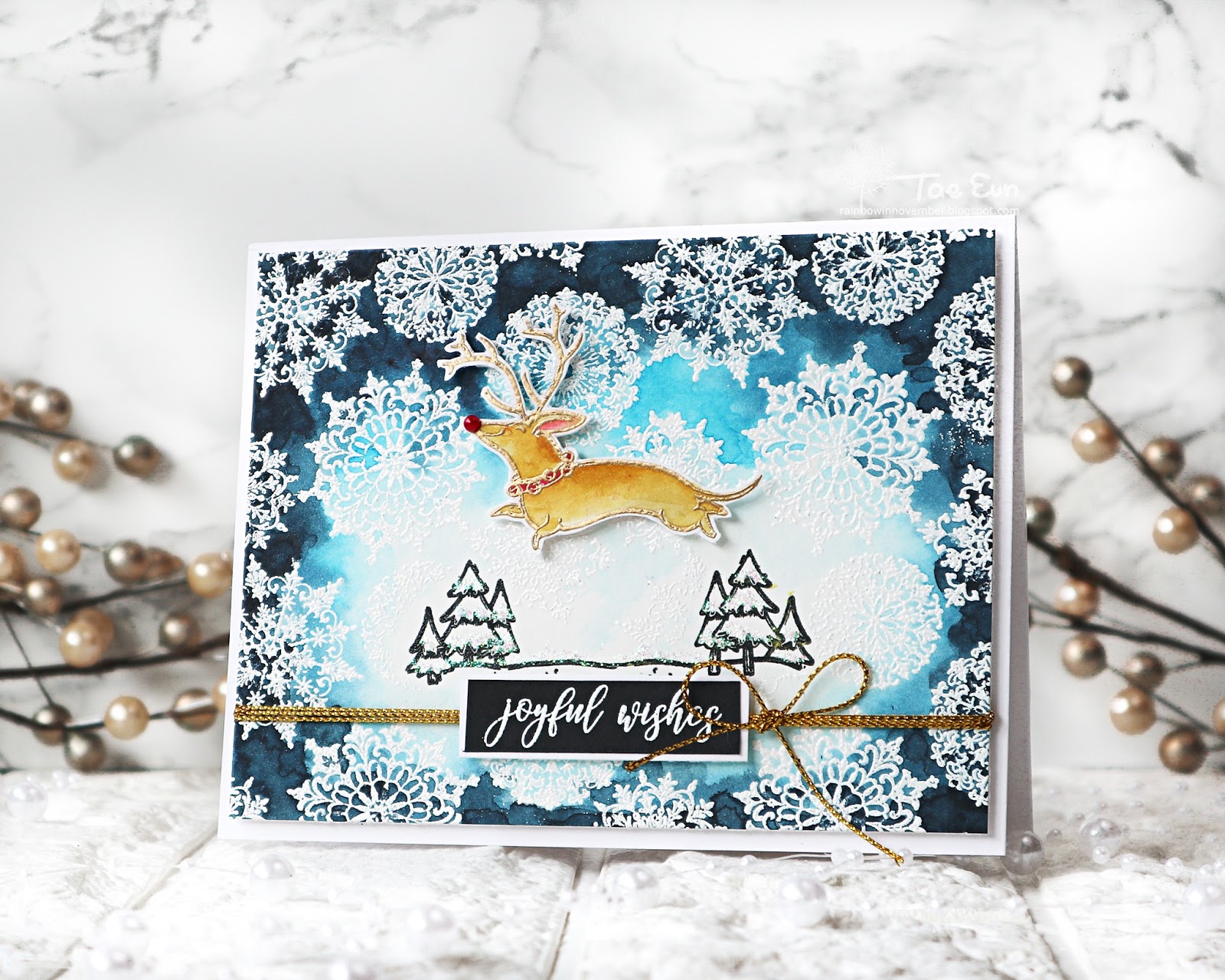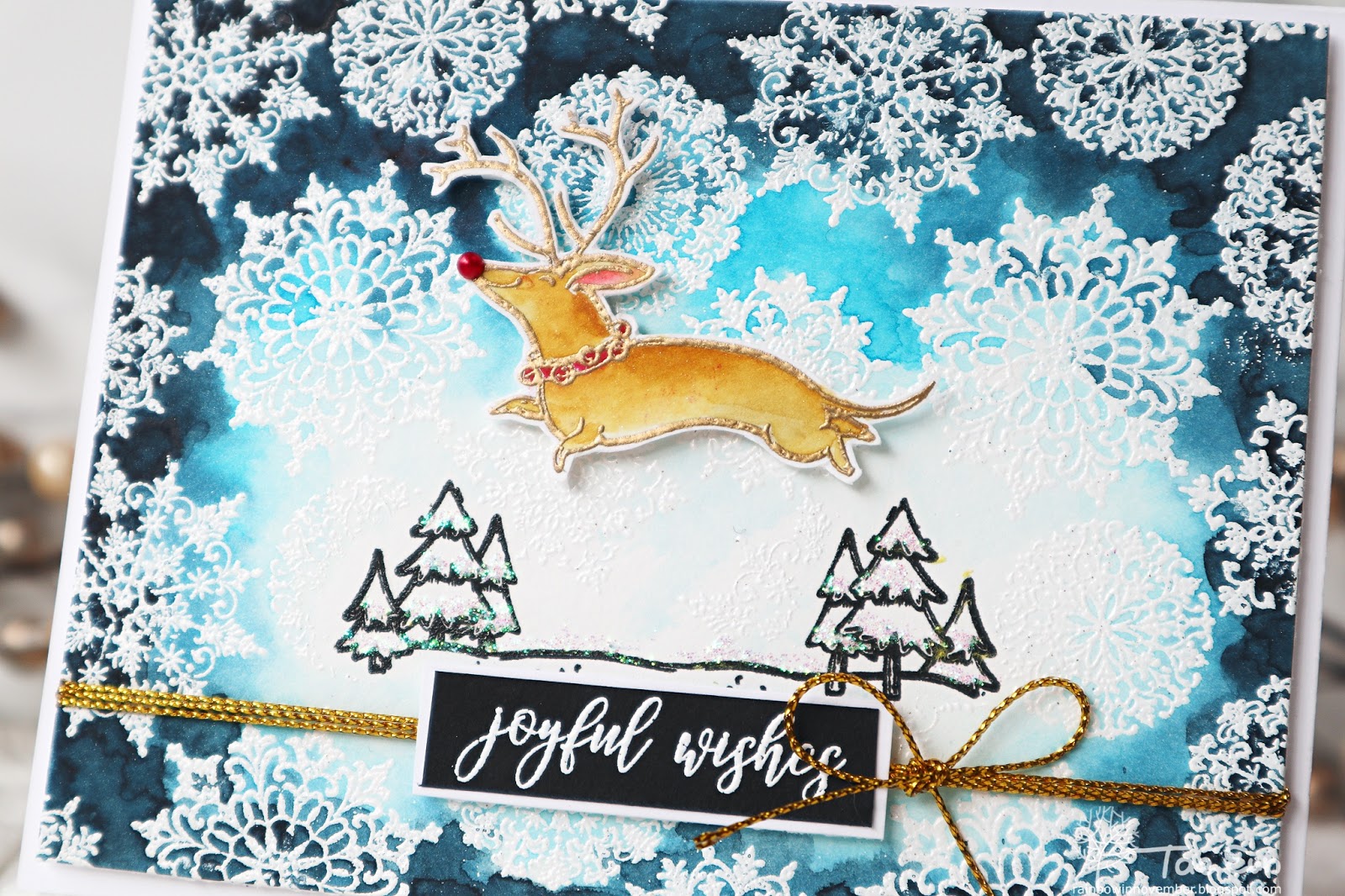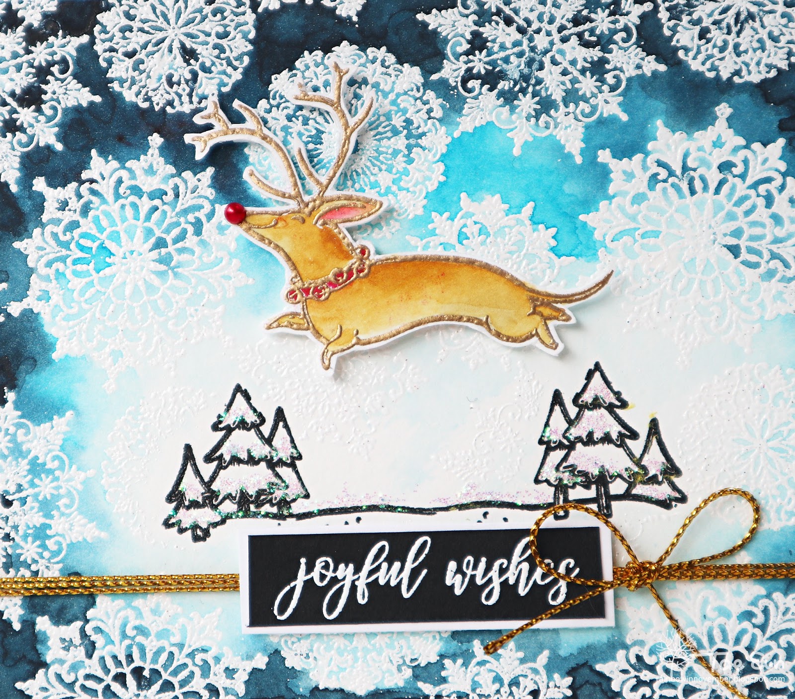 I started off by creating the background panel. First I stamped the image with the trees on a hill, which is included in Delightful Dachshund (30-645) stamp set, on a watercolor paper panel in a black pigment ink. I then masked the trees to white heat emboss the Snowflake Pattern (40-706) cling stamp on the panel. I colored the background panel in blue shades making it bright towards the center of the panel. I used cerulean blue Color Burst for the light blue in the center and added Payne’s gray to the border area several times until I was happy with the saturation.