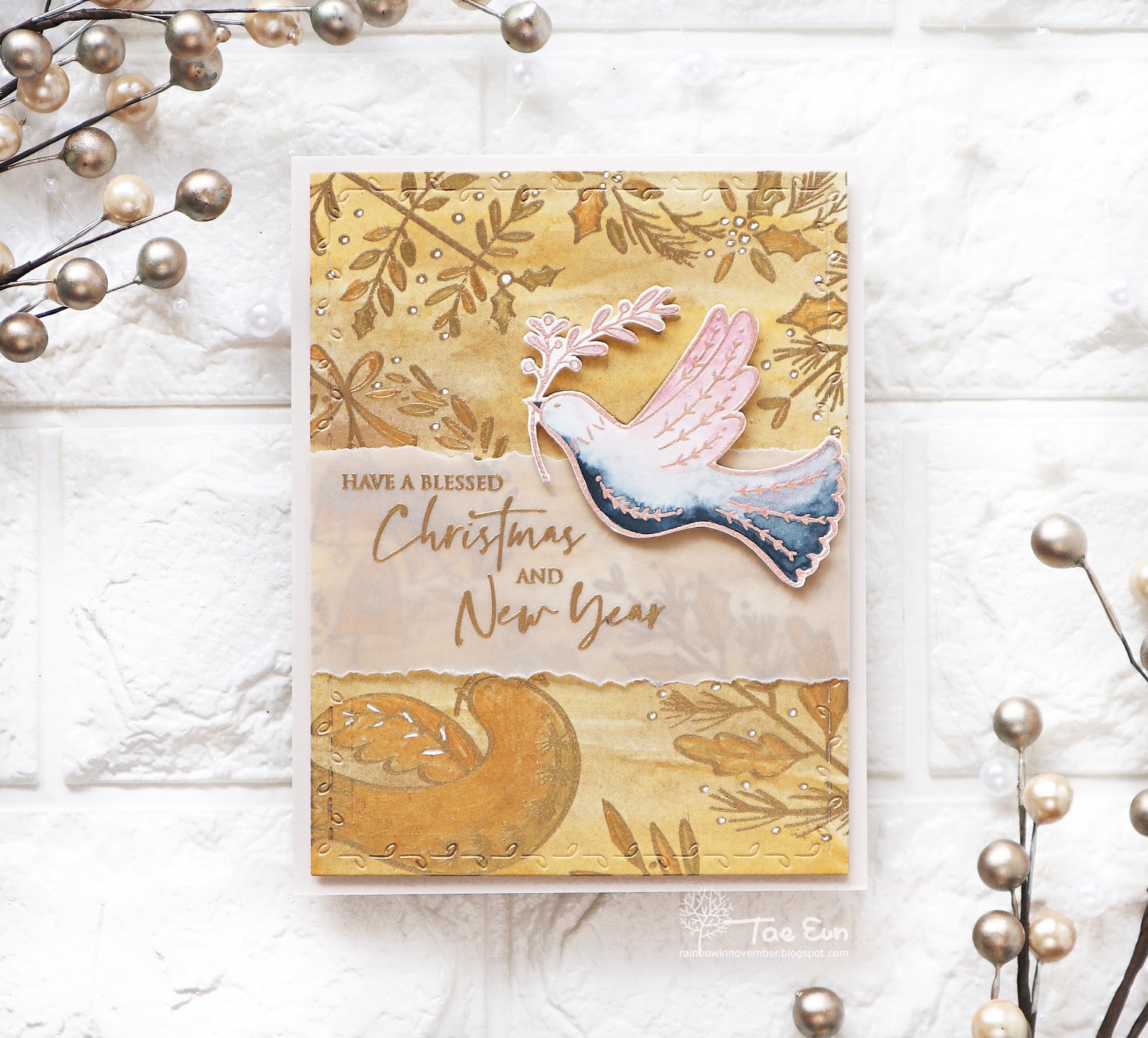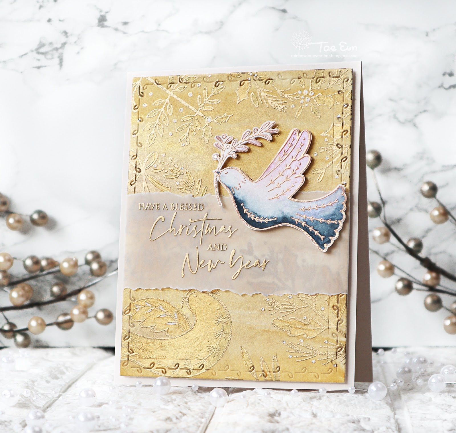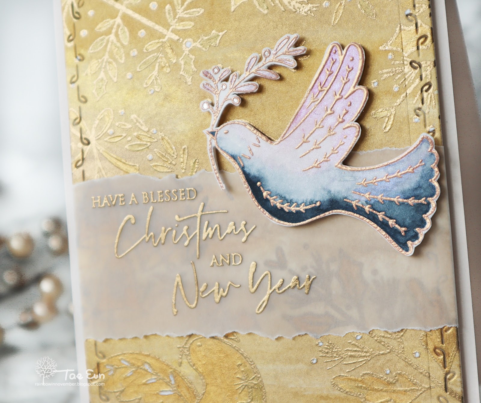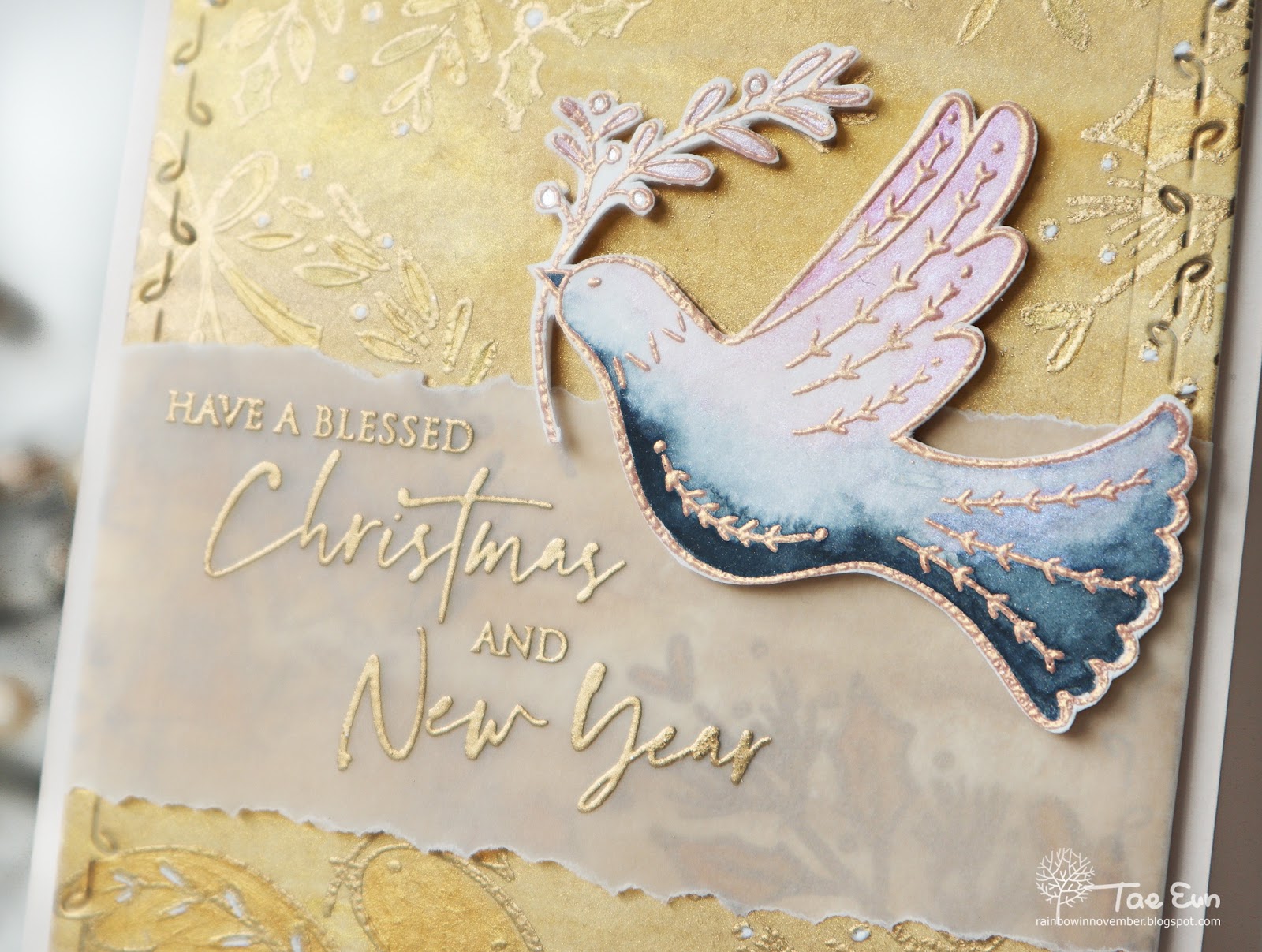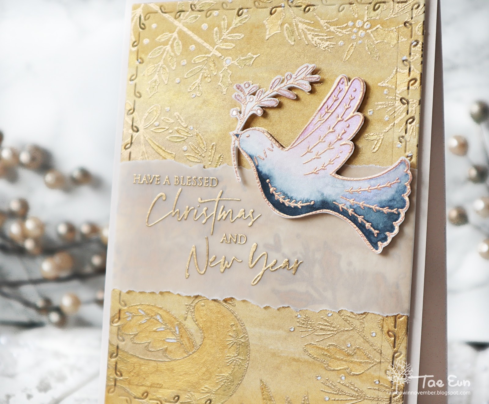 I gold heat embossed the sentiment from Holy Season (30-648) stamp set on a torn strip of vellum and added it to the background panel. I foam mounted the background panel on a cream cardbase and added the dove as shown in the picture using some foam adhesives.