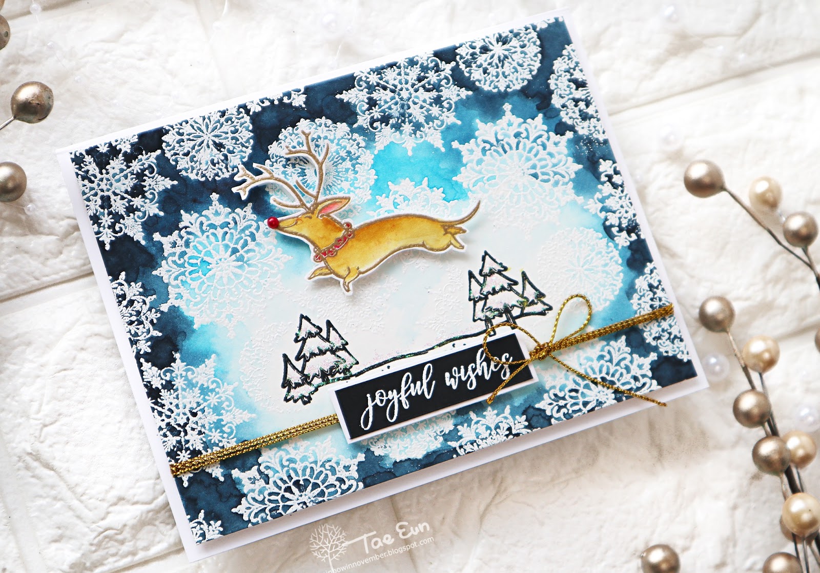 My first card is featuring Snowflake Pattern (40-706) cling background stamp and the cute Delightful Dachshund (30-645) stamp set with which I fell in love at first sight :)!