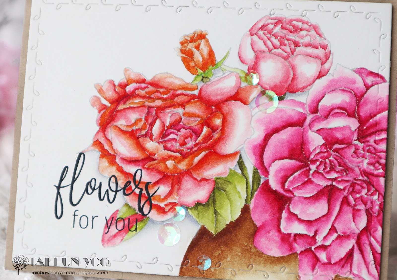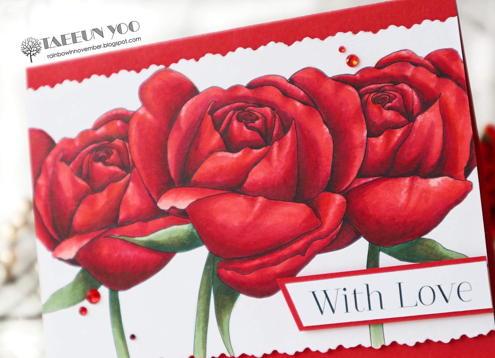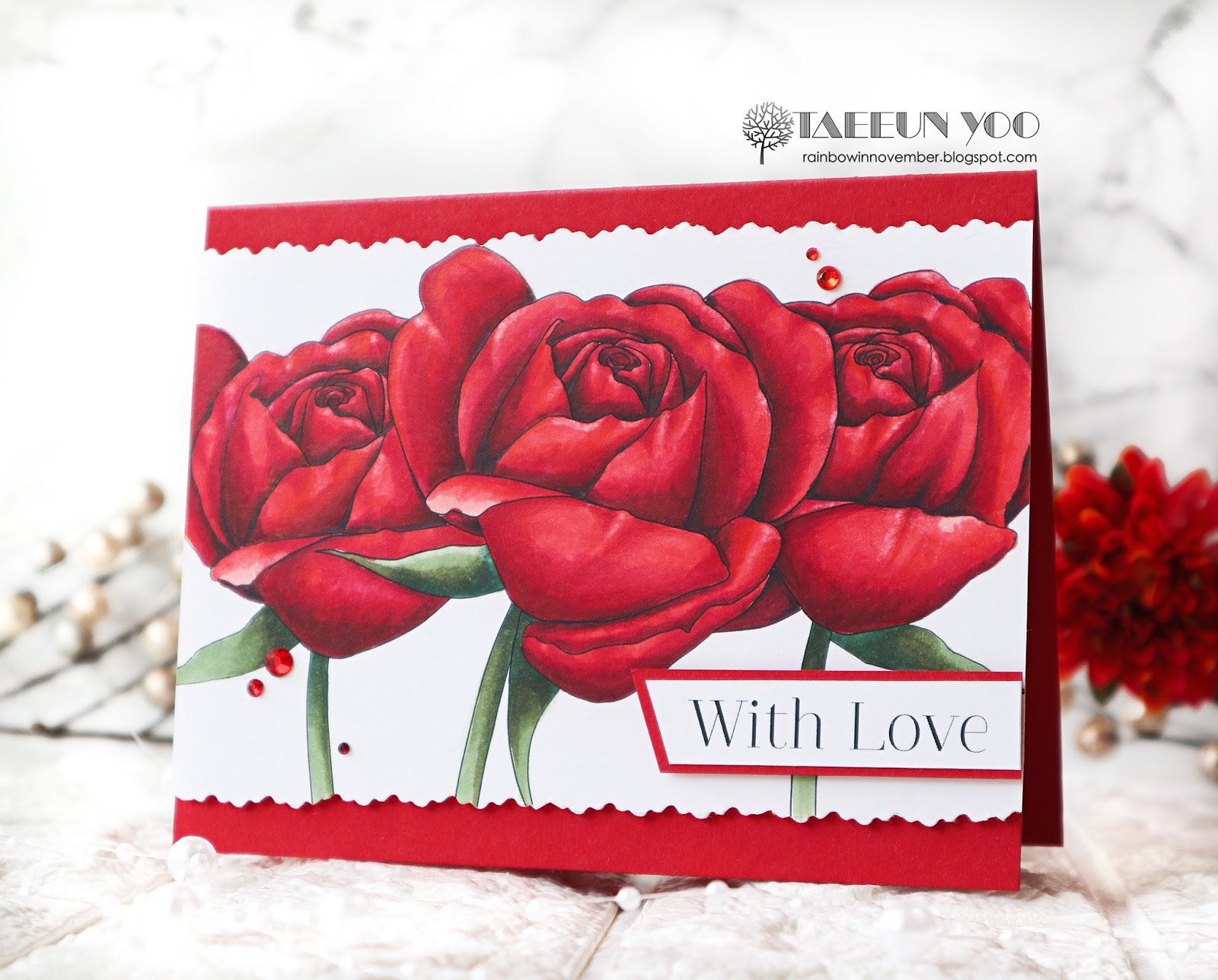 I printed out the image on a Neenah solar white panel and drew some petals on the roses of both sides using a Copic multiliner to make the image a bit longer. I then colored the roses using Copic markers. After the coloring was completed, I cut the panel using a pair of deckle scissors and foam mounted it on a red cardbase.
