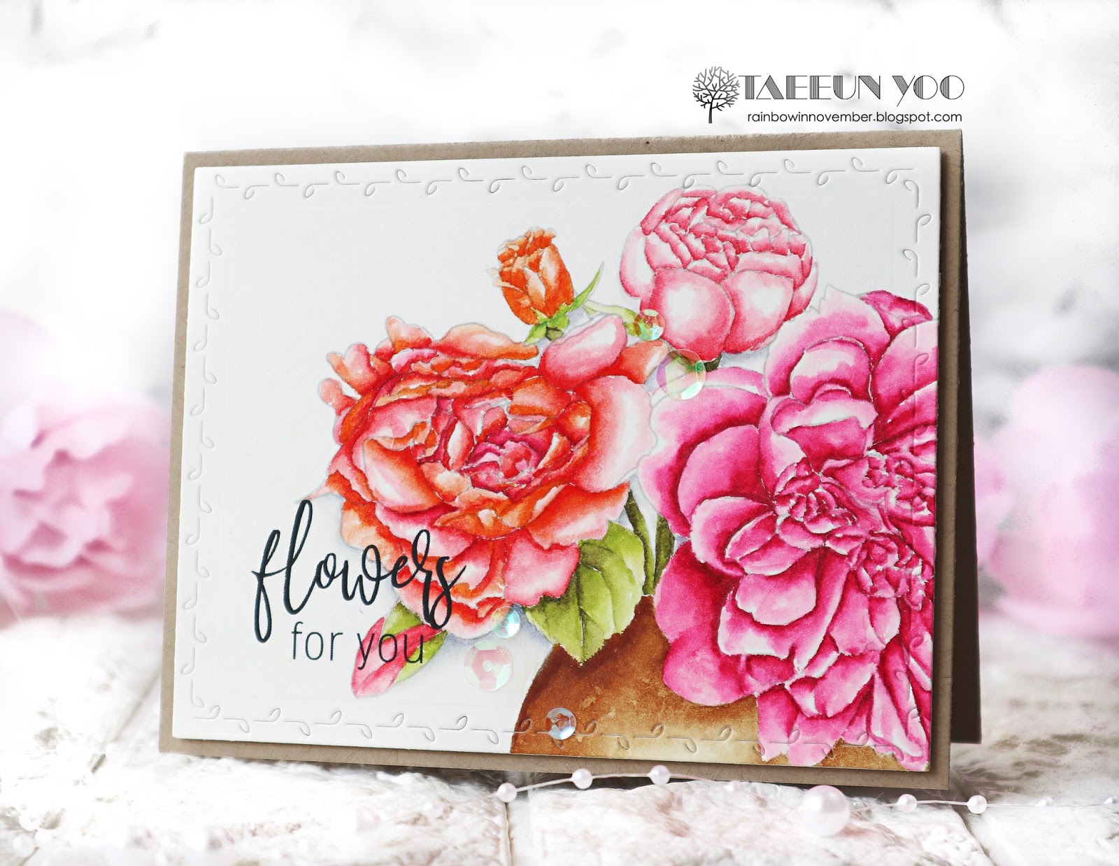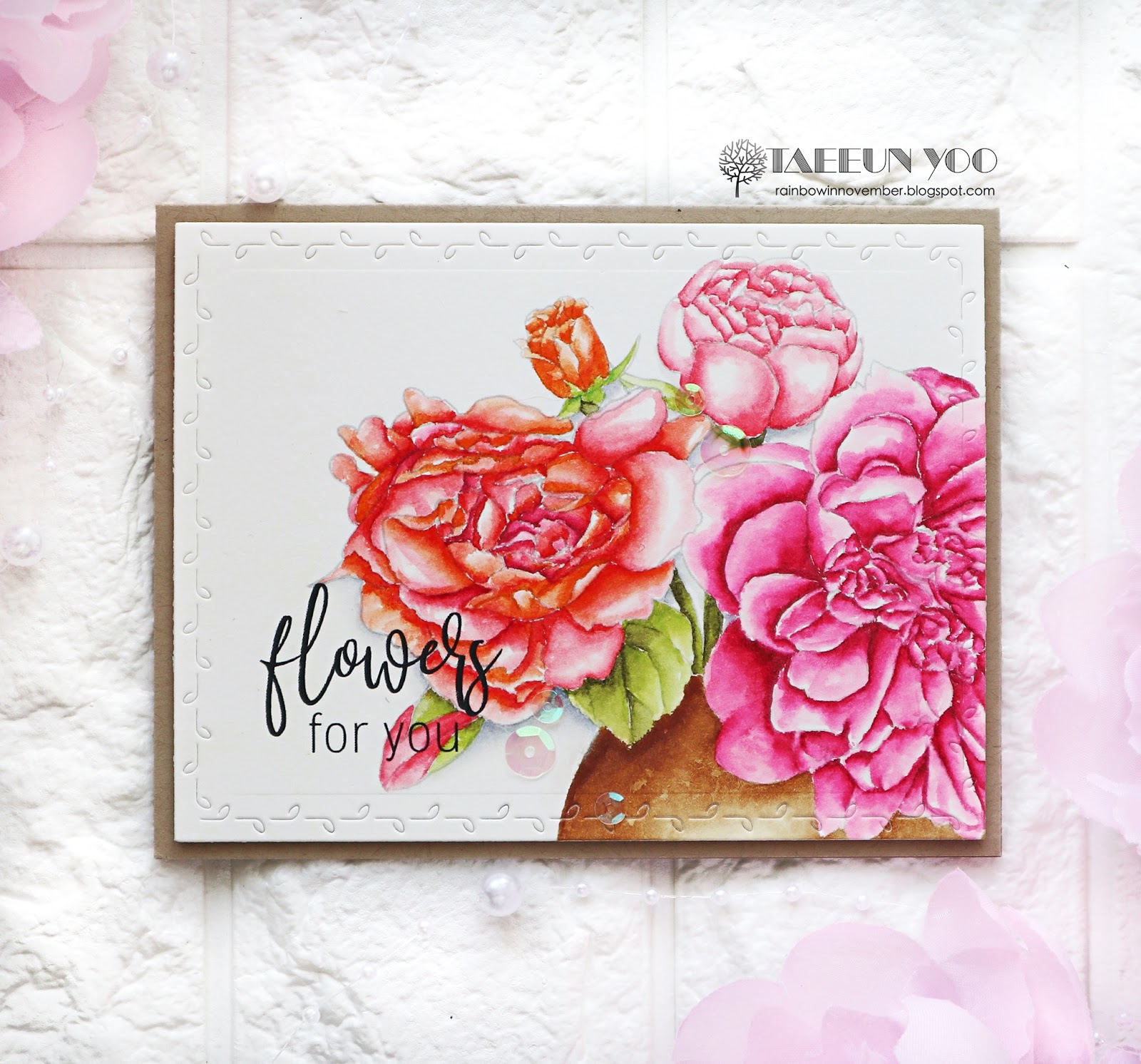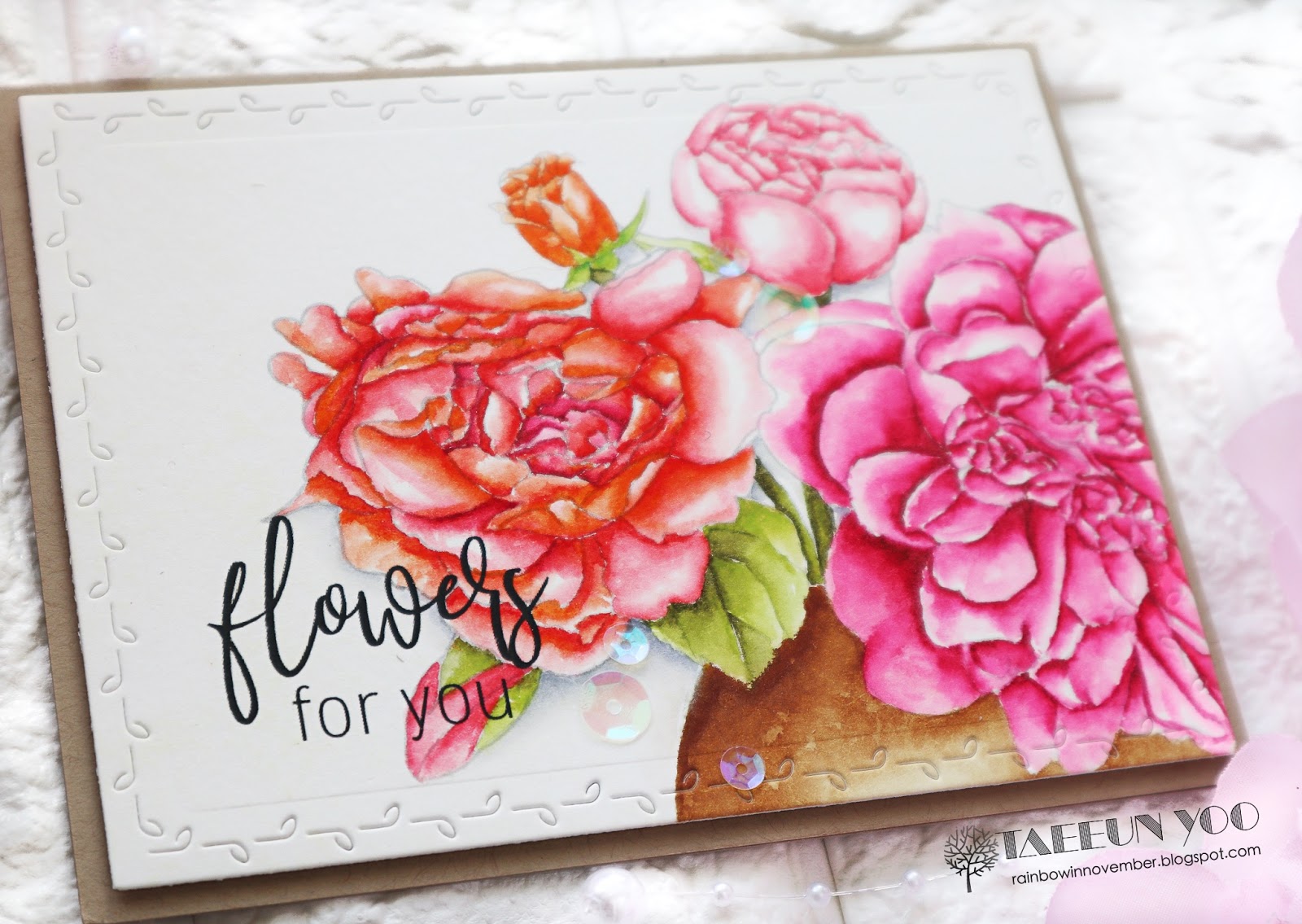 I printed out the image on a Neenah solar white panel and drew some petals on the roses of both sides using a Copic multiliner to make the image a bit longer. I then colored the roses using Copic markers. After the coloring was completed, I cut the panel using a pair of deckle scissors and foam mounted it on a red cardbase.