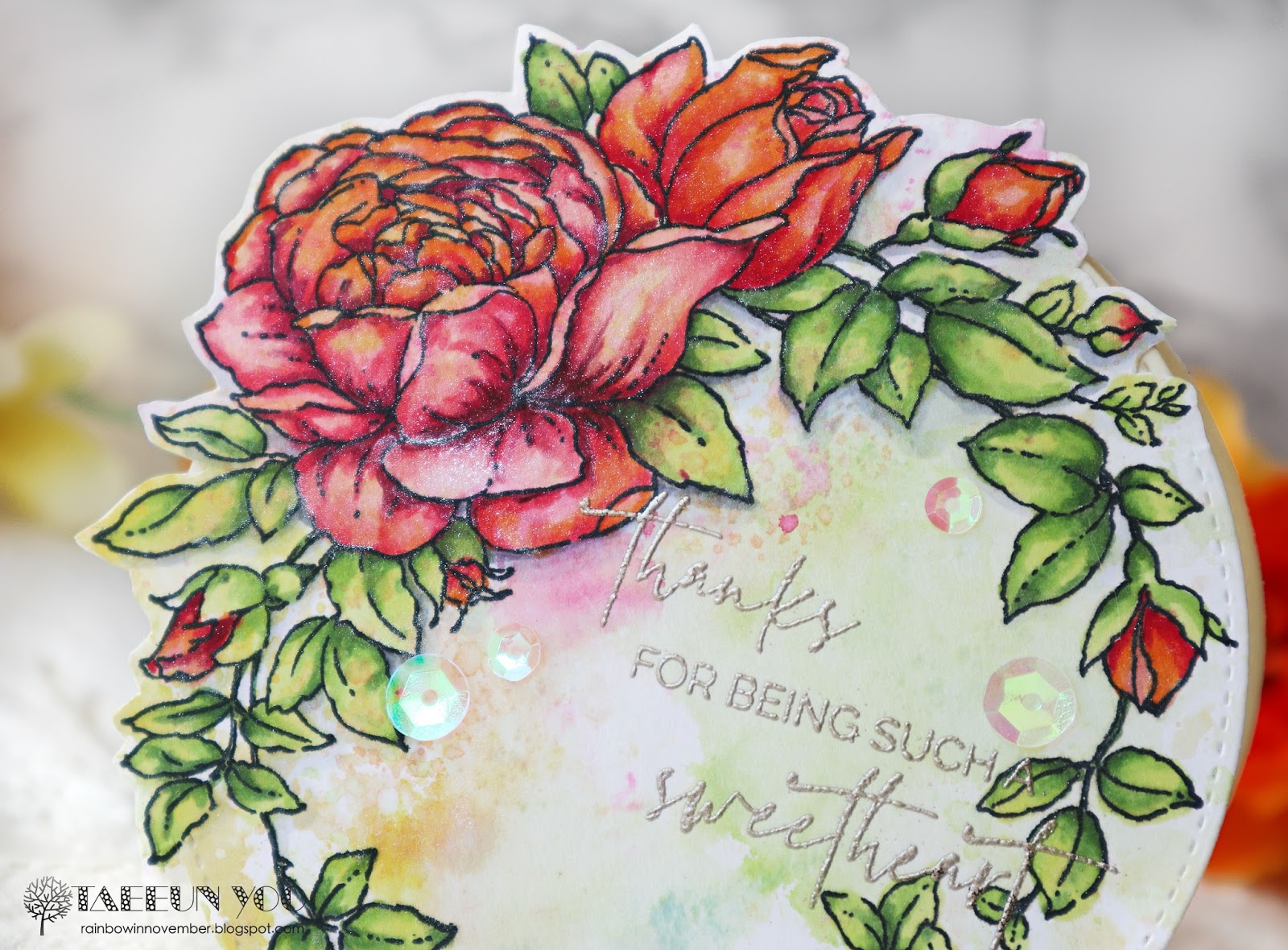 The sentiment is from Hug me (30-668) mini sentiment set which I heat embossed in Liquid Platinum directly on the colored panel. I partially cut the image using a Double Stitched circle die (The Ton) and fussy cut the part where the roses are. I traced the shape of the panel on a extra piece of white cardstock and cut it to mat the colored panel. I made a circle cardbase using the same circle die I used for the partial die cutting and adhered the colored panel on it.