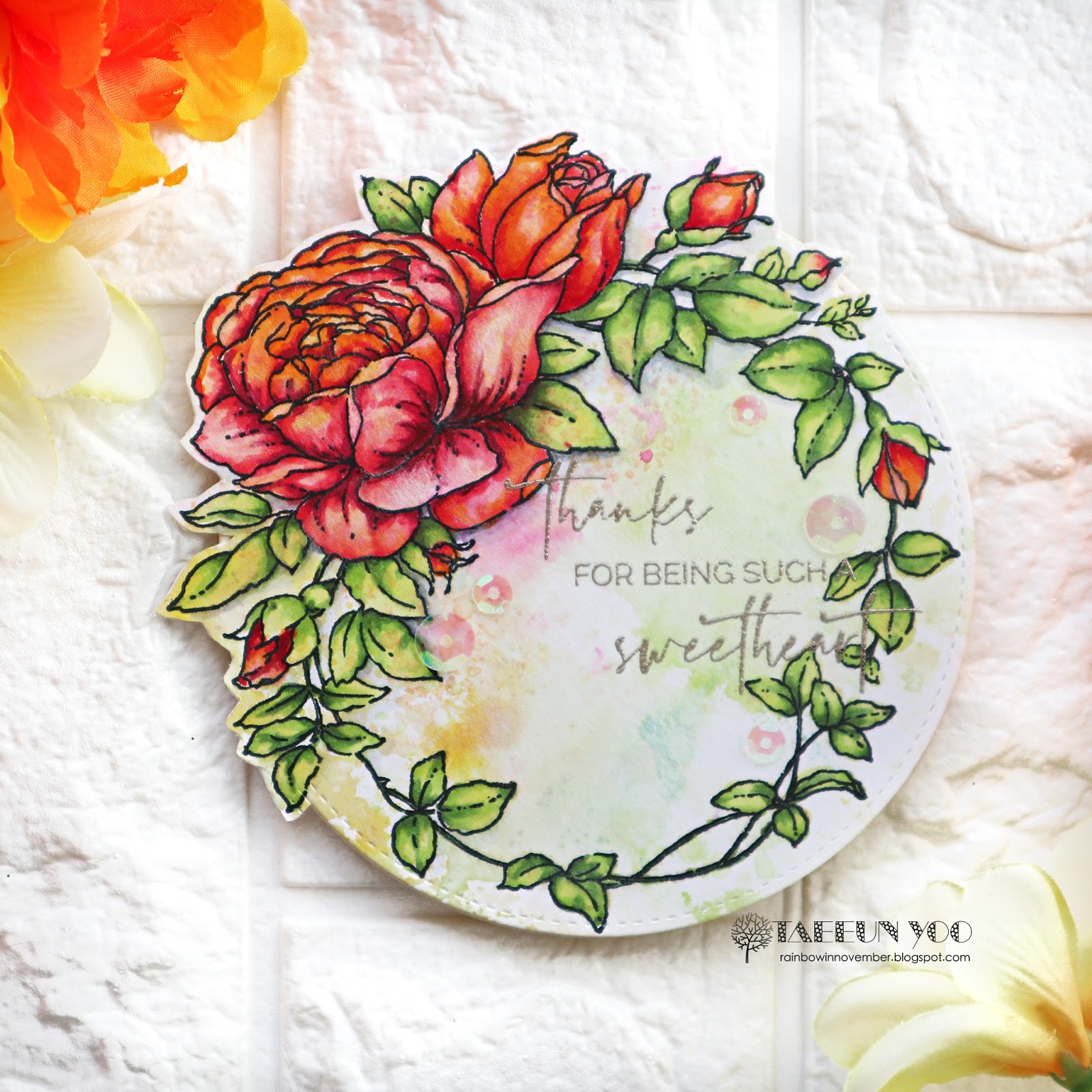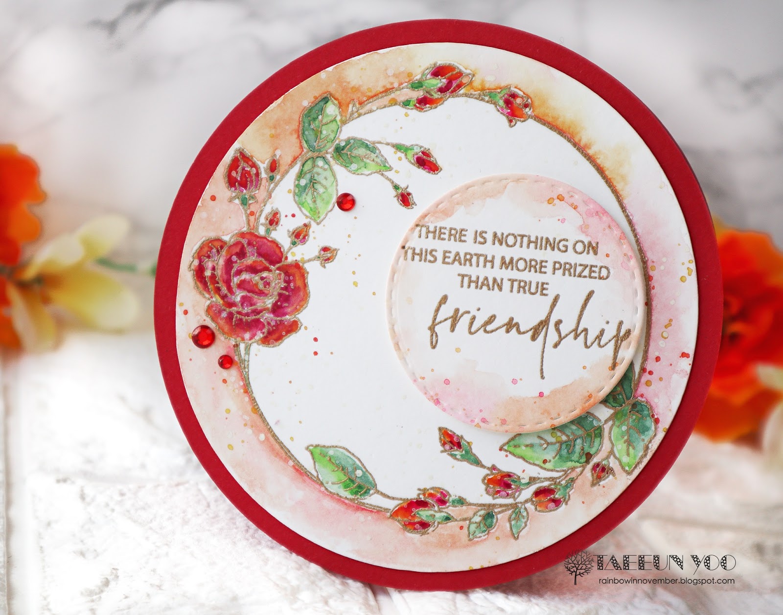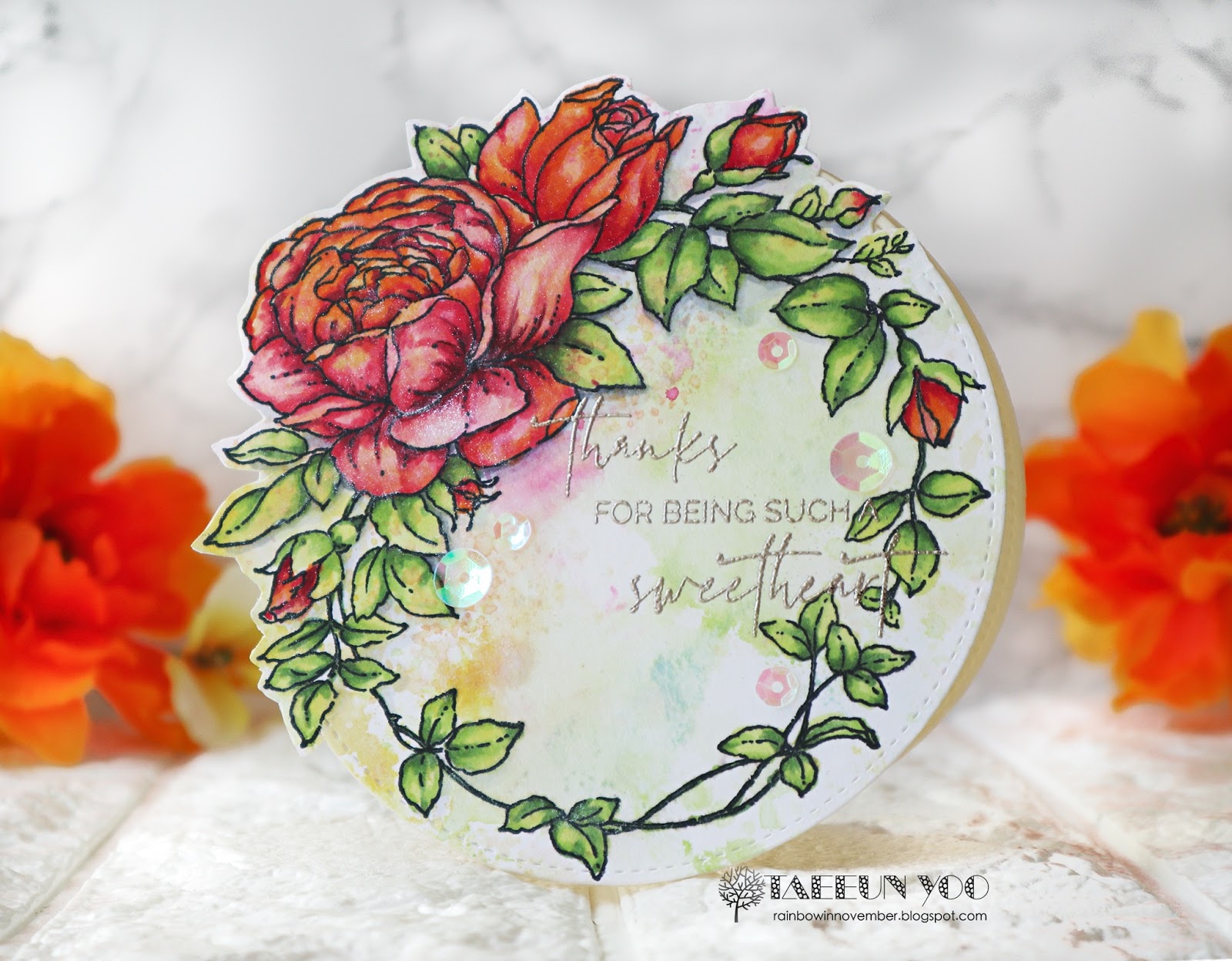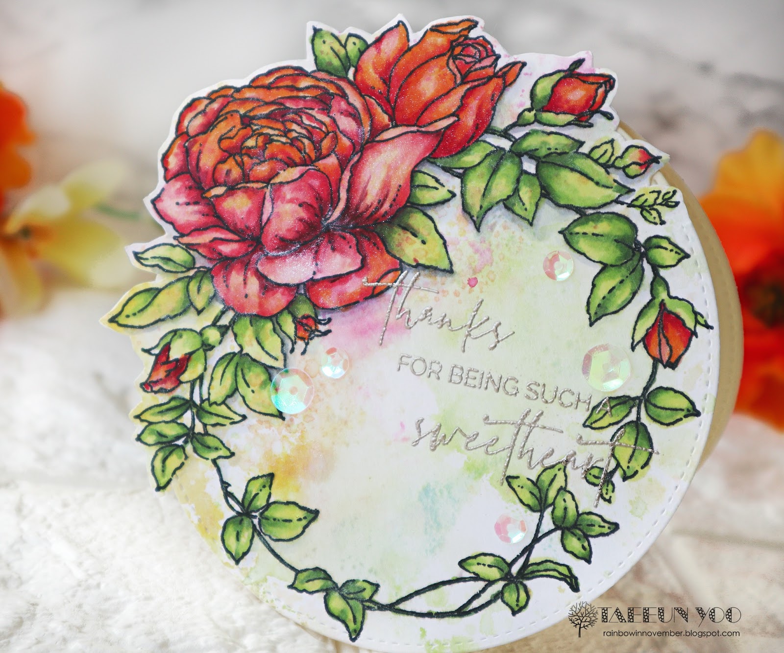 Next circle card is showcasing Rose Romance cling stamp set (40-719). This stamp set includes two stamps ; one simple rose wreath that I used for my card and a small heart with a string.