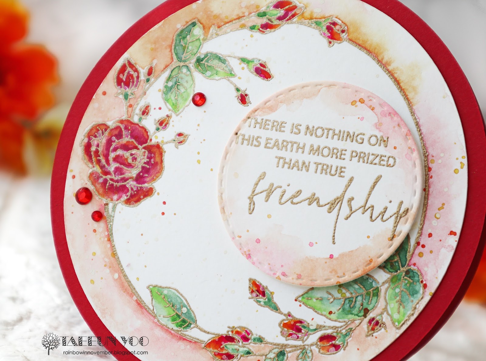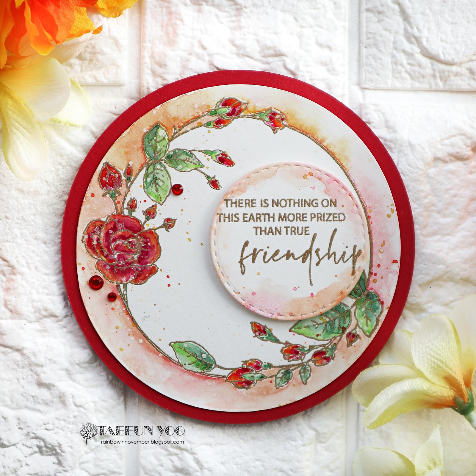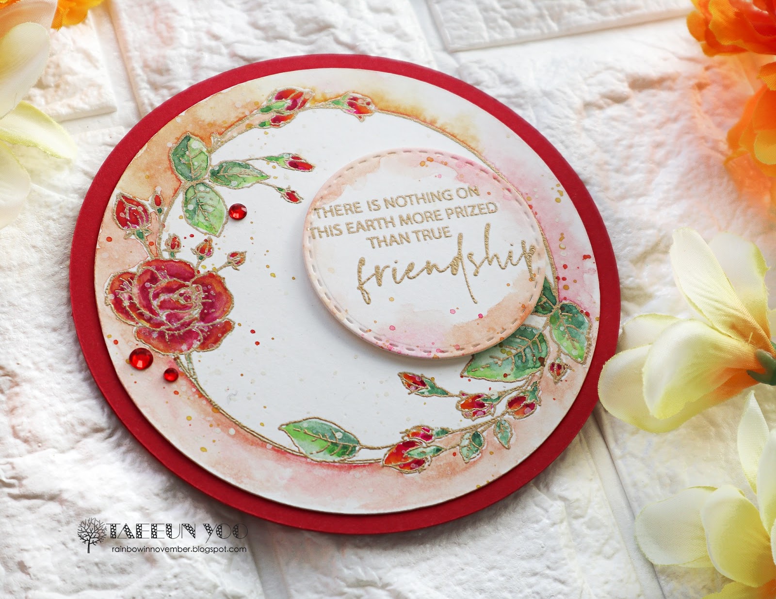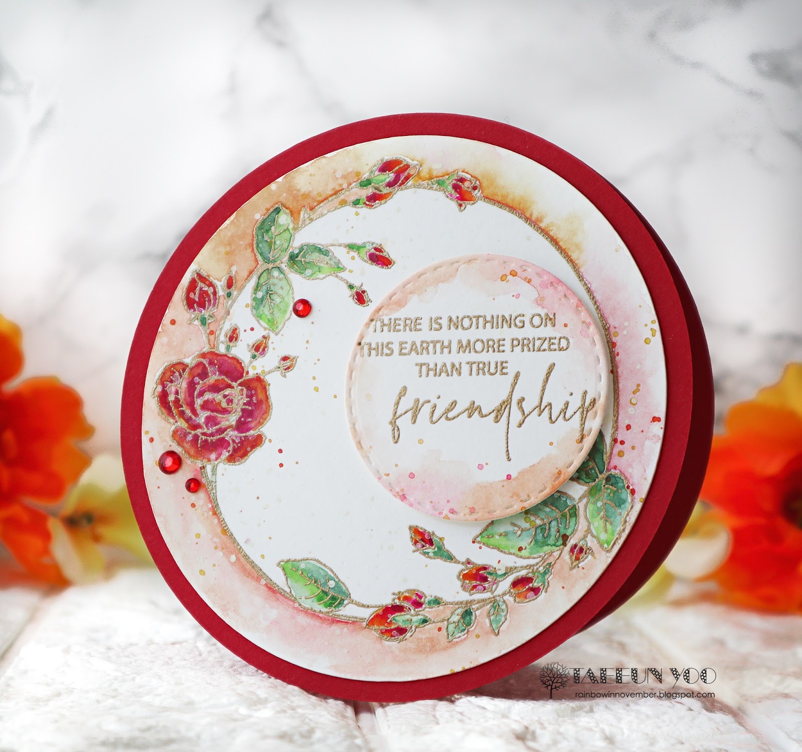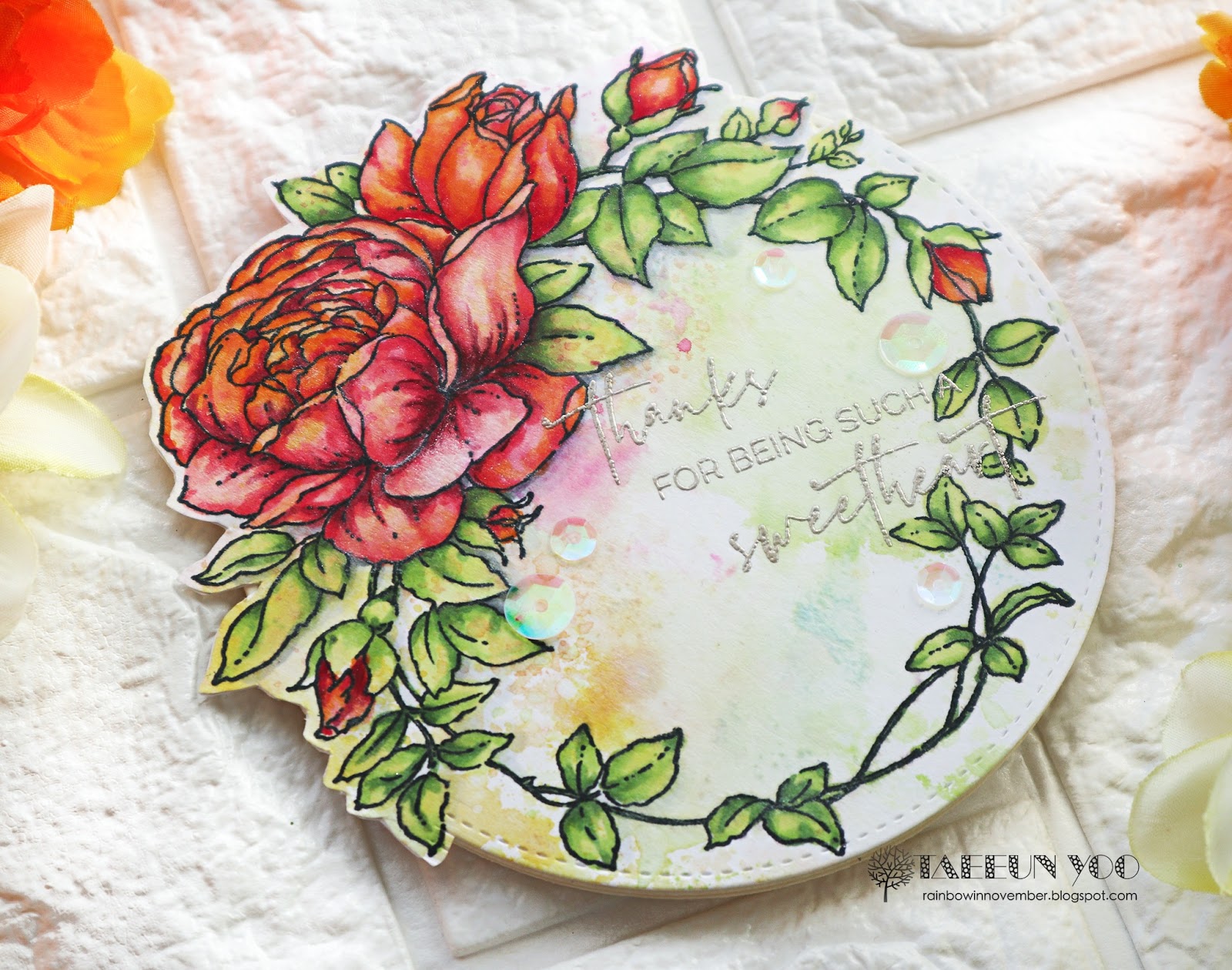 Next circle card is showcasing Rose Romance cling stamp set (40-719). This stamp set includes two stamps ; one simple rose wreath that I used for my card and a small heart with a string.