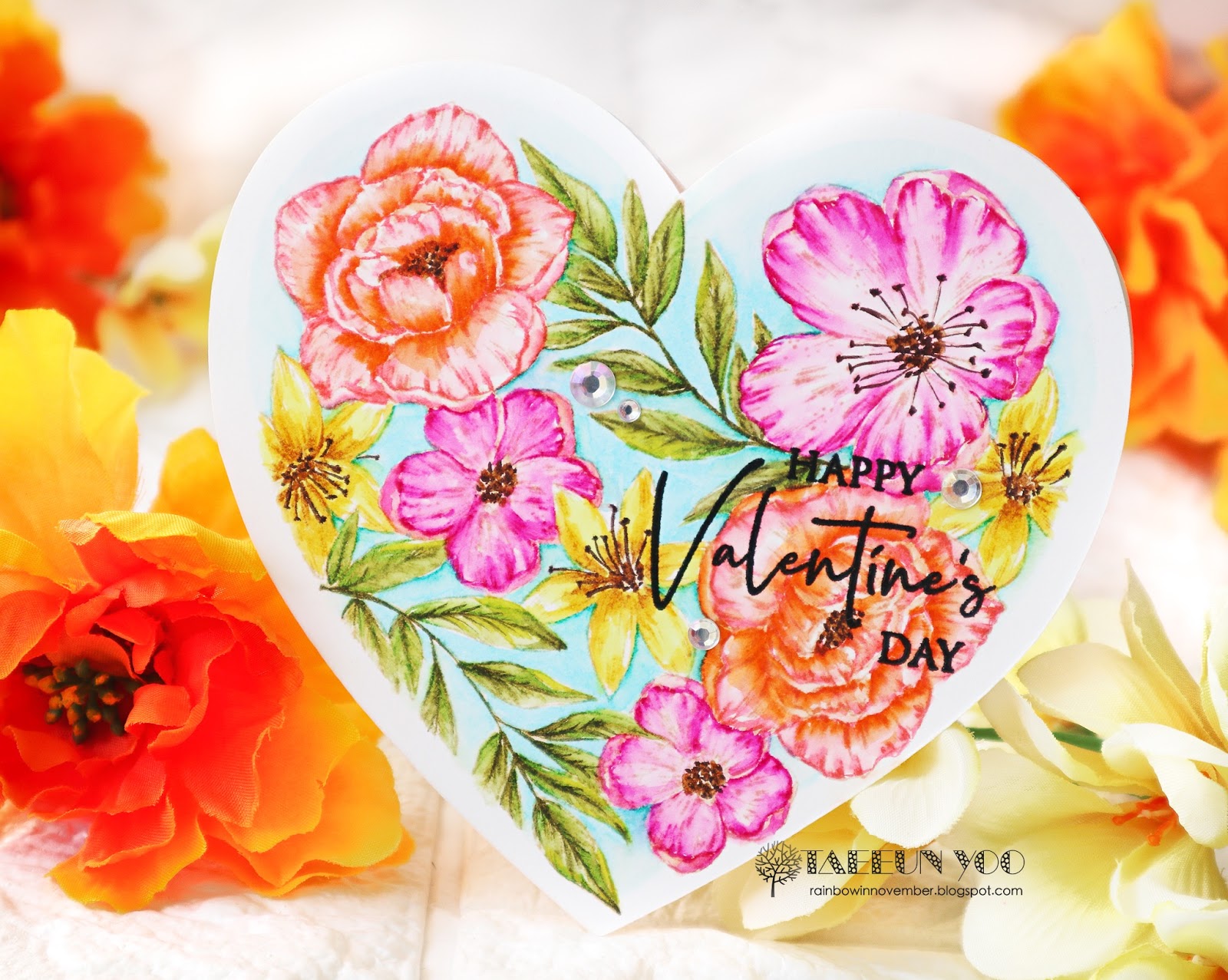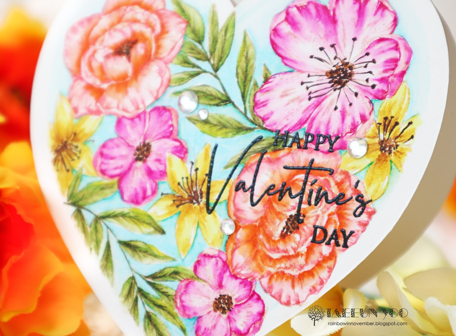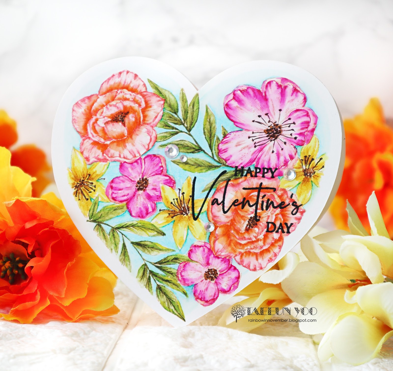 My second card is a heart shaped card and is featuring Passionate Blooms cling stamp (40-718). This floral arrangement is in a heart shape, so I followed the original shape to make the card.