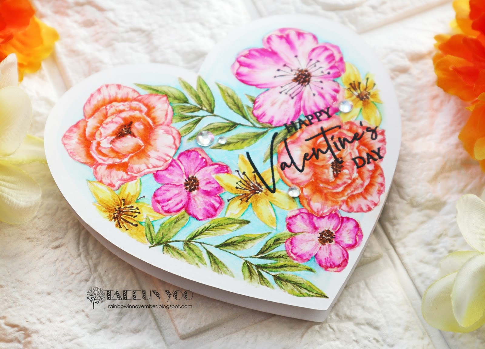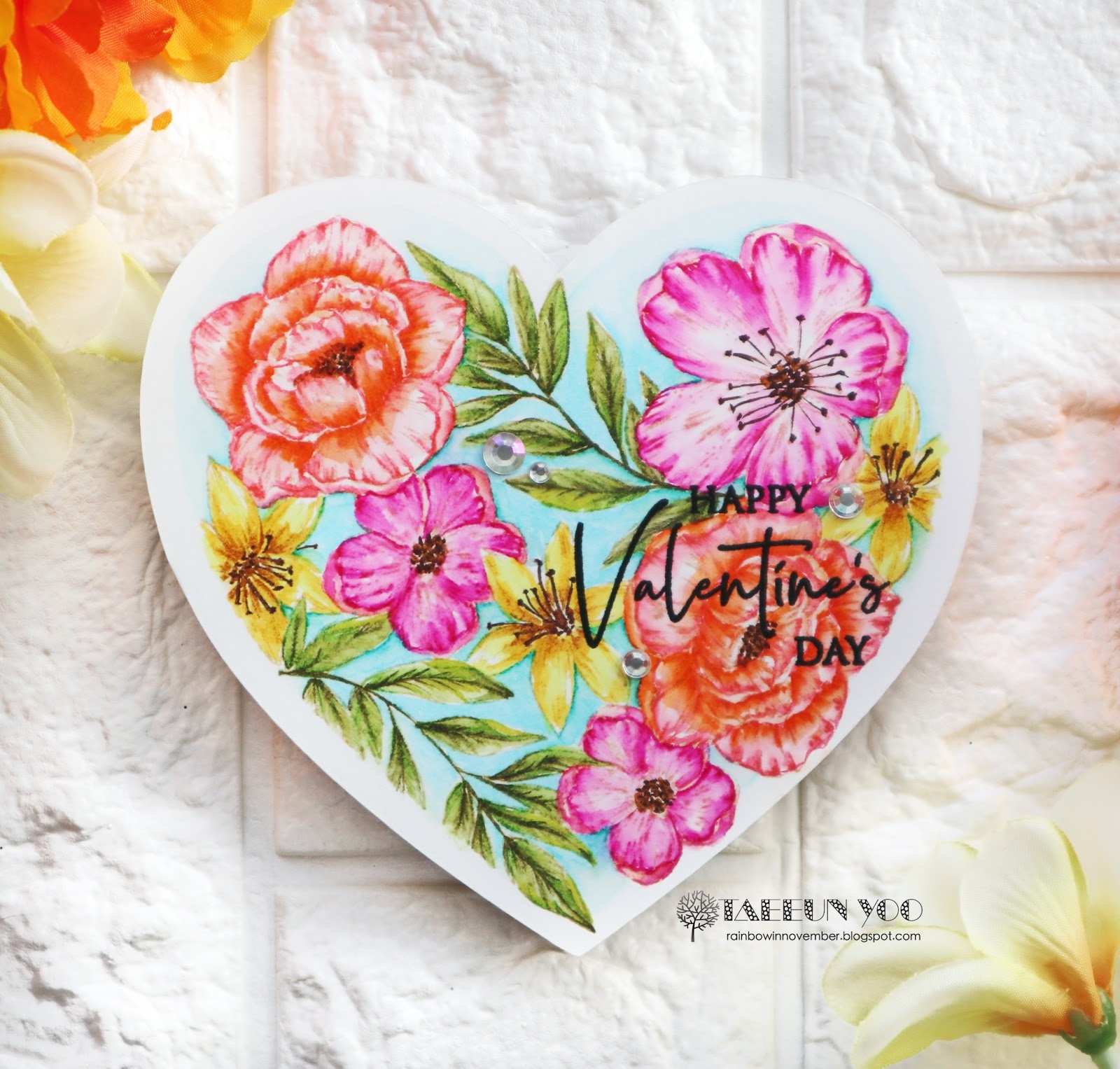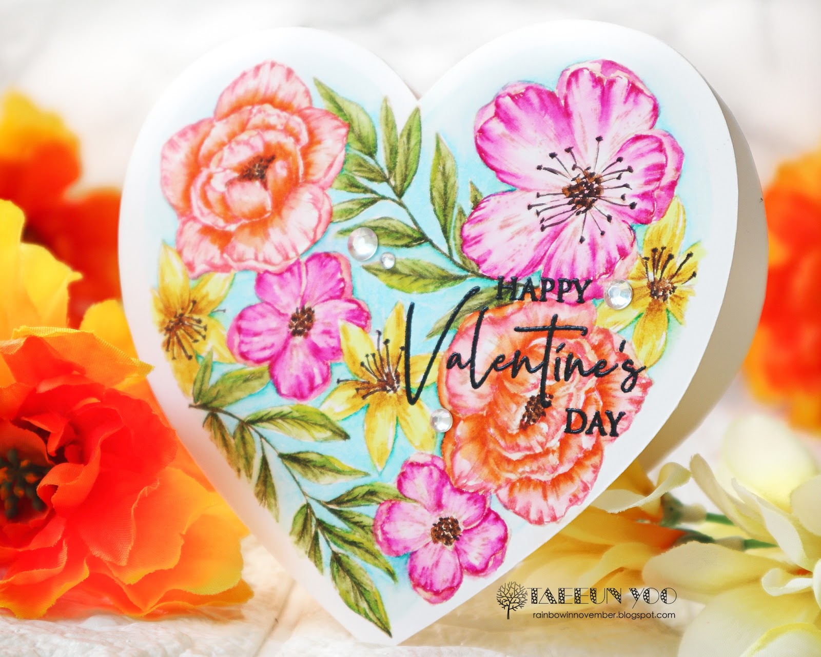 My second card is a heart shaped card and is featuring Passionate Blooms cling stamp (40-718). This floral arrangement is in a heart shape, so I followed the original shape to make the card.