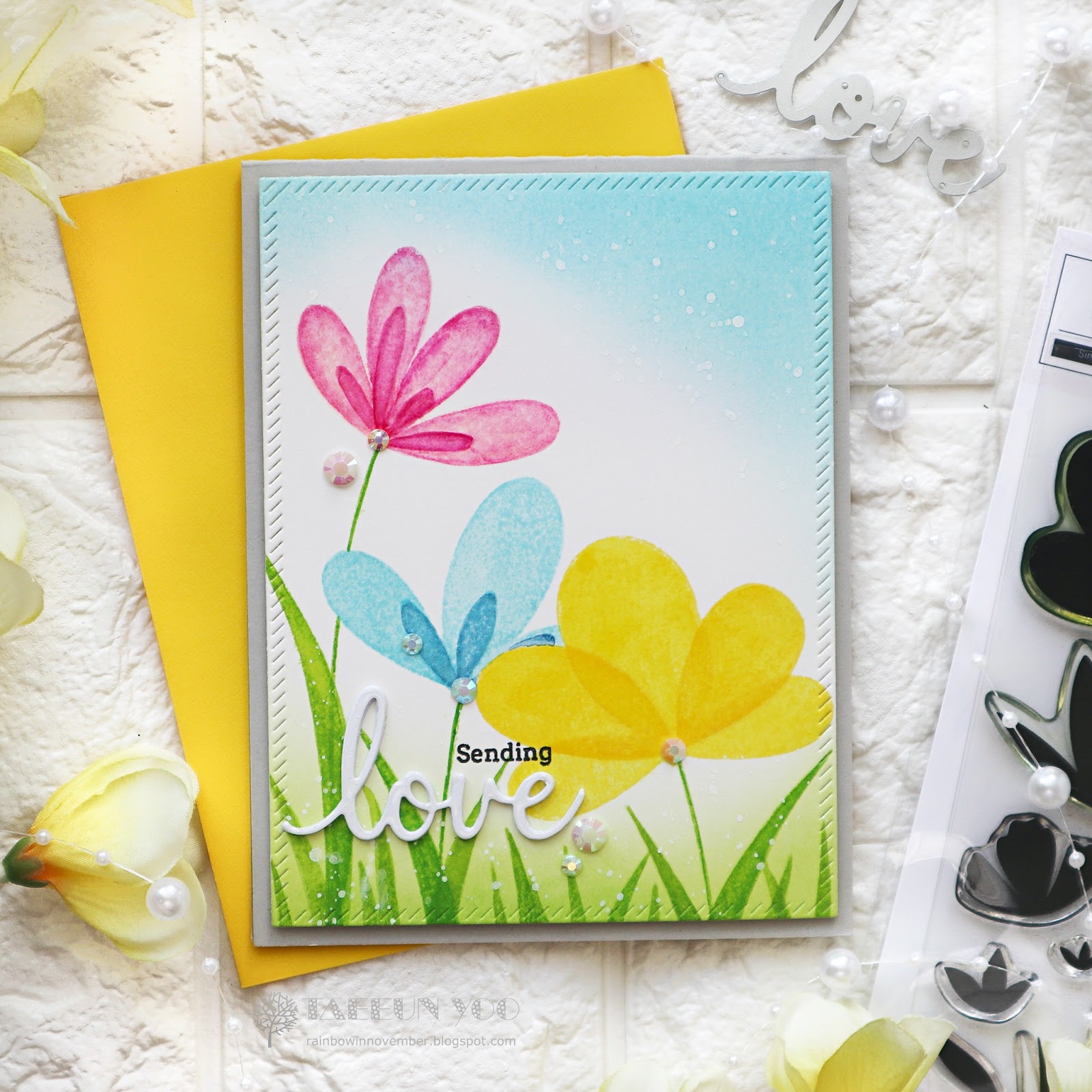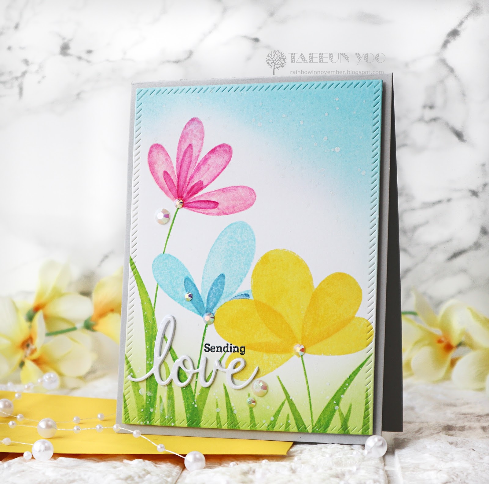 For today’s card I used Simple Blossoms stamp set and Phrase Builder: Sending die set from our January Release. The flowers from Simple Blossoms stamp set reminded me of watercolored flowers which look transparent. So I tried to show the look of airy flowers.