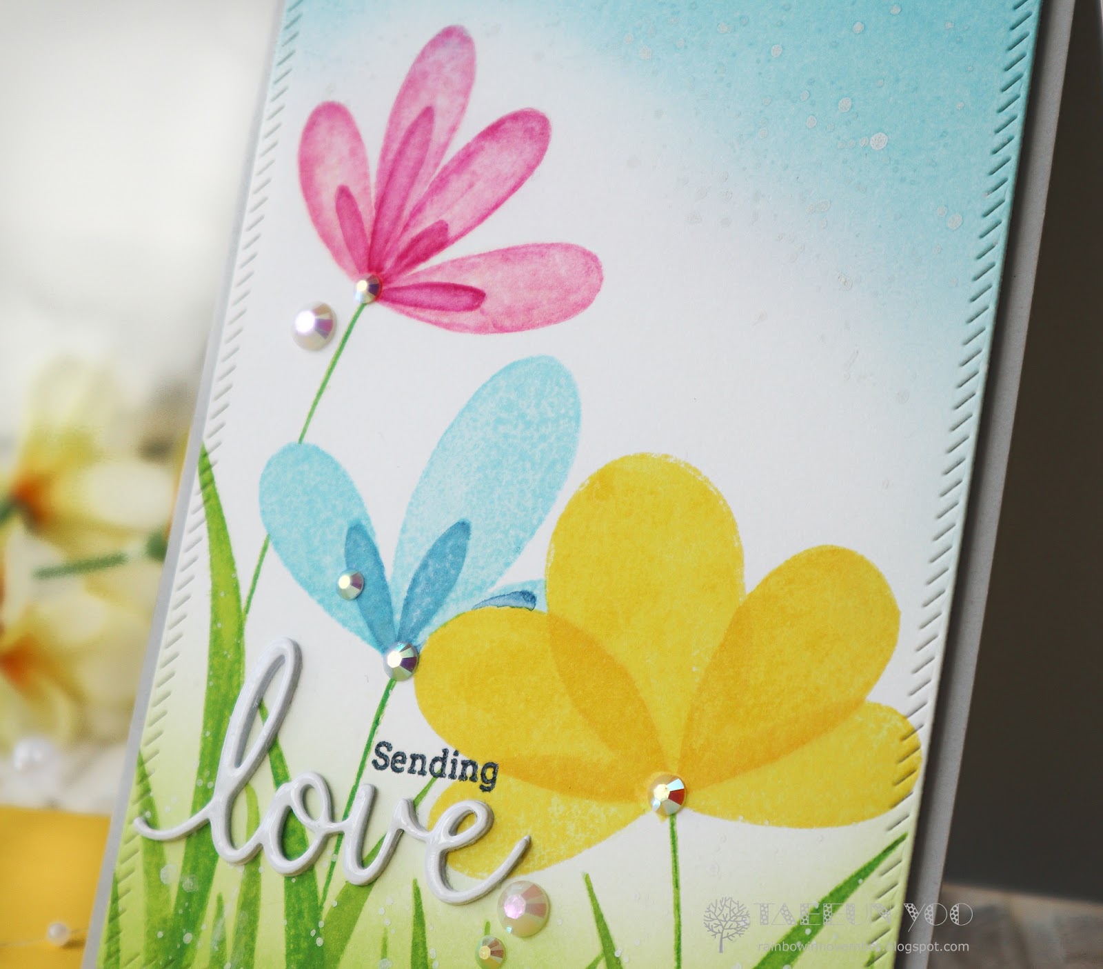 After the panel was dry I ink blended the top in  Sky Blue and Summer Shower and the bottom of the panel in Grassy Knoll and Key Lime and then splattered white opaque ink on the background. I cut the panel using Diagonal Stitched Rectangles die and foam mounted it on a gray cardbase. I cut “love” three times from some heavyweight white cardstock using a die from Phrase Builder: Sending die set , stacked them together and adhered it on the card after stamping “sending” from Folk Hummingbird stamp set in a black ink. To give the card some shine I covered the die cut sentiment with Glossy Accents and added some white Jewels to the card.