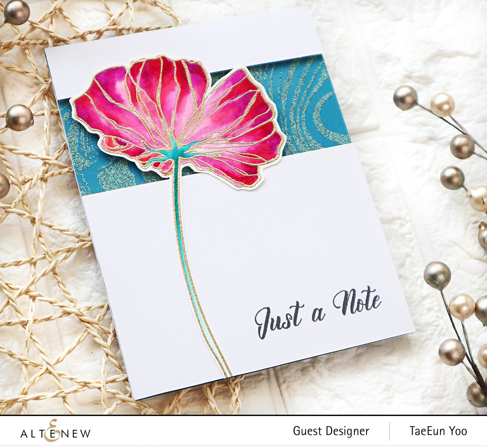 I gold heat embossed the large poppy from Wonderland stamp set and colored it in Purple Wine, Ruby Red, Rouge and Lagoon watercolor brush markers. I let it dry and fussy cut it.