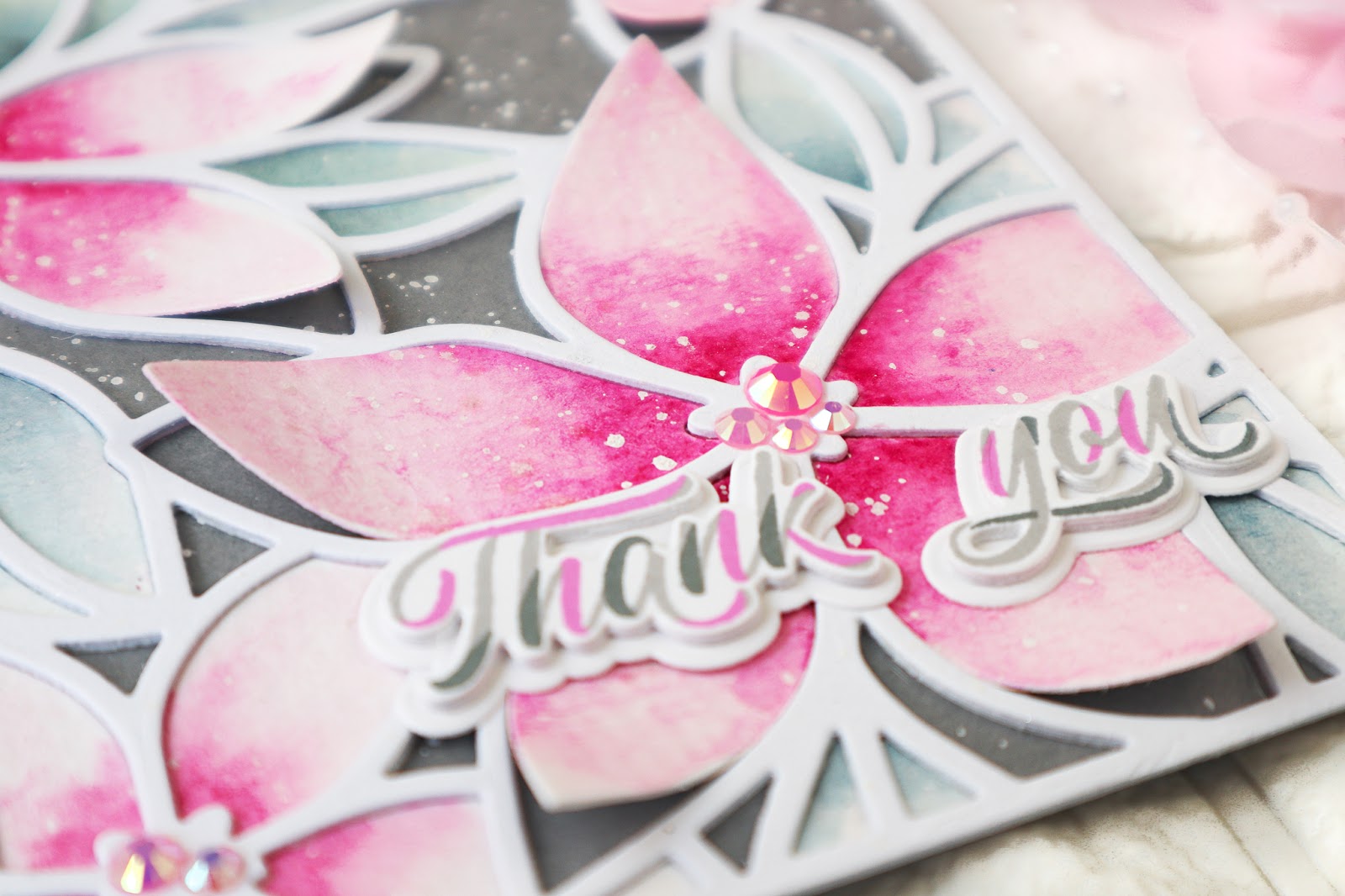 I cut the Ornate Floral once from a watercolor paper panel and two more times from heavyweight white cardstock. I left the die cut pieces cut from the watercolor paper still stuck together and colored it using Pinkfresh Studio Liquid Watercolors. For the flower I used Bubble Gum and the leaves were colored in Licorice and Sapphire.