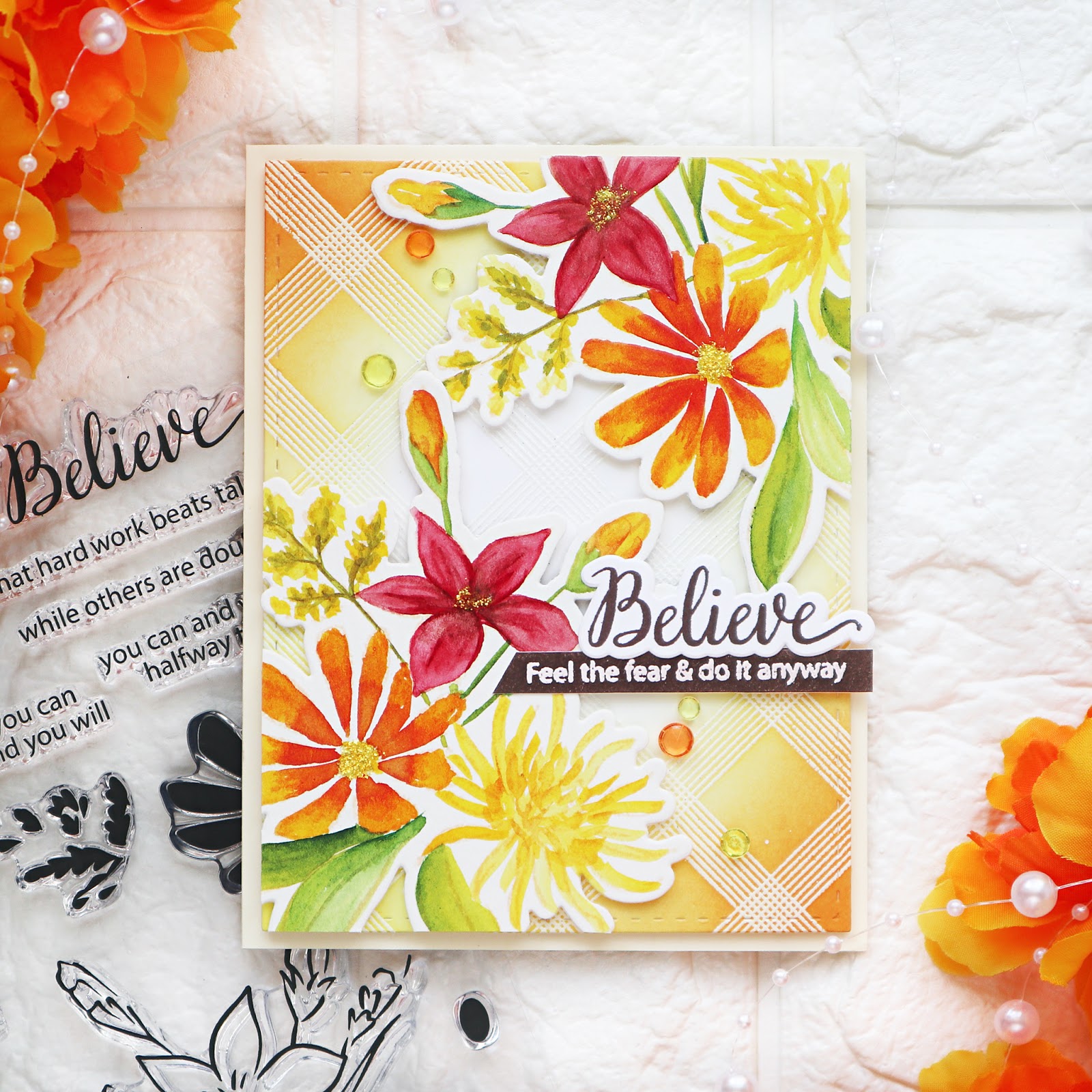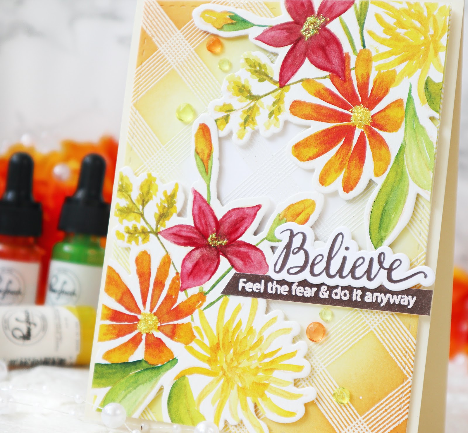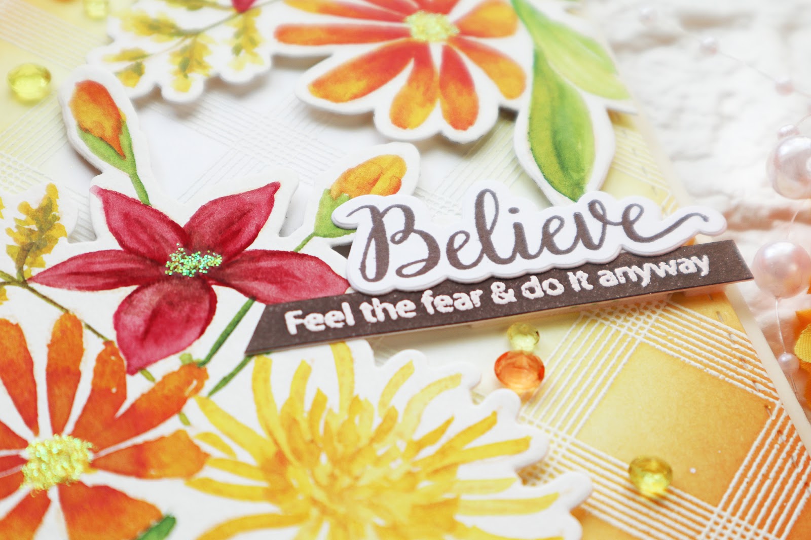 I stamped the Believe in Yourself image two times on a watercolour paper panel in Peach Fuzz to do no line watercoloring. I used Pinkfresh Studio Liquid watercolors. I keep the flowers in yellow, orange and red color scheme. After the coloring was done, I cut the images with the coordinating die and set them aside.