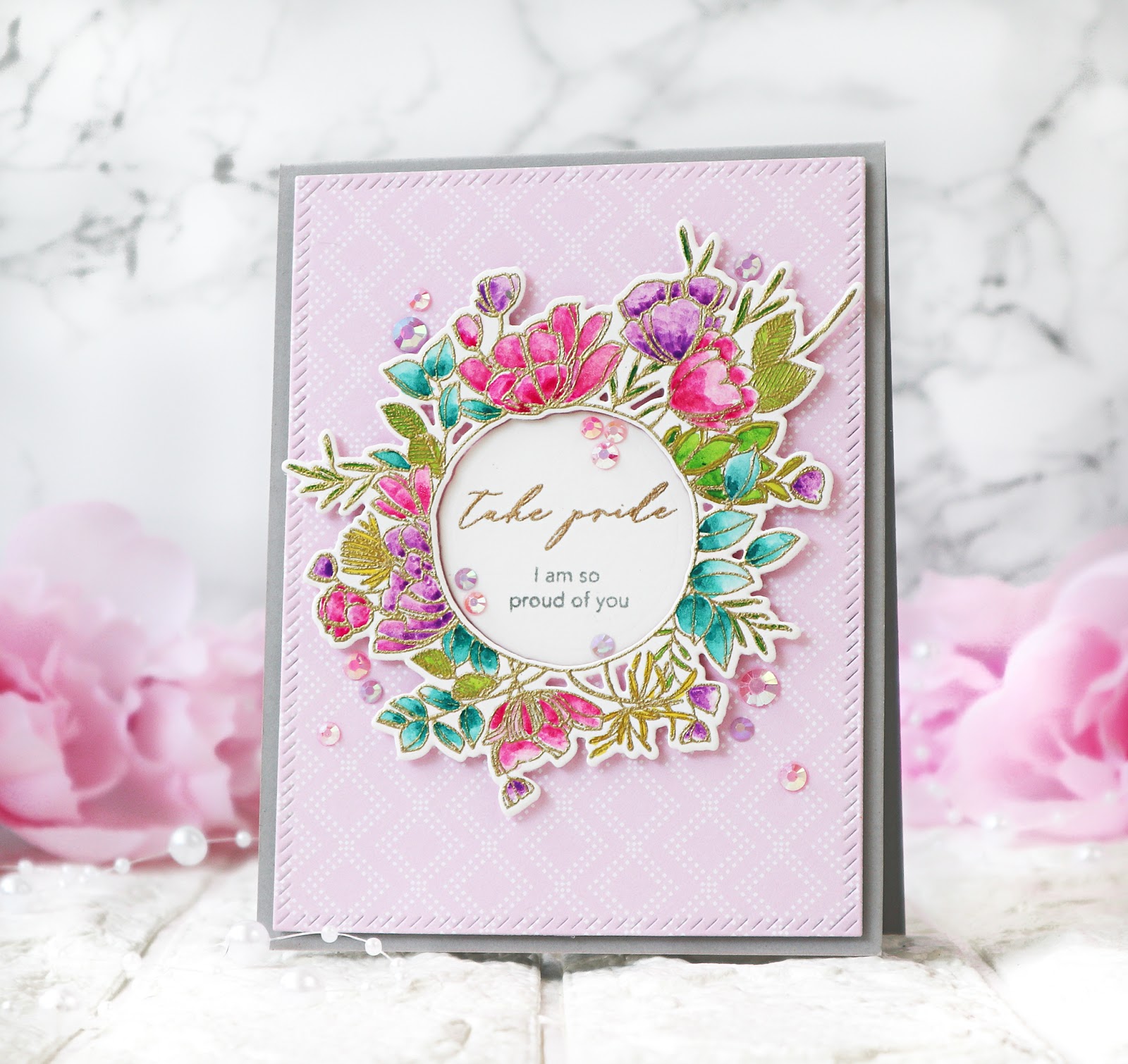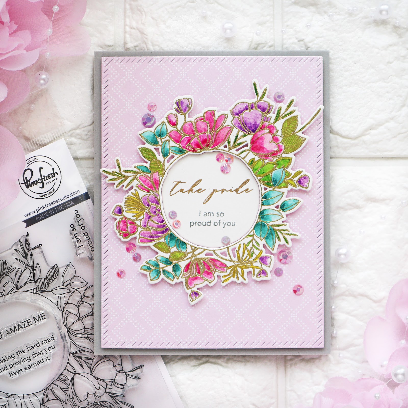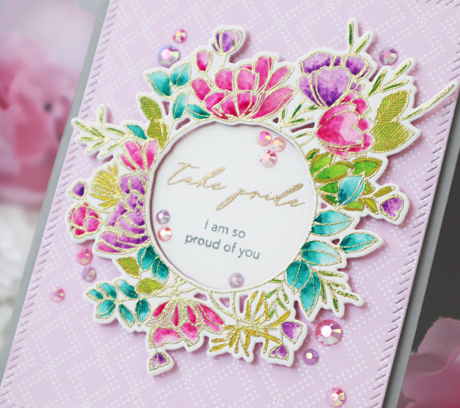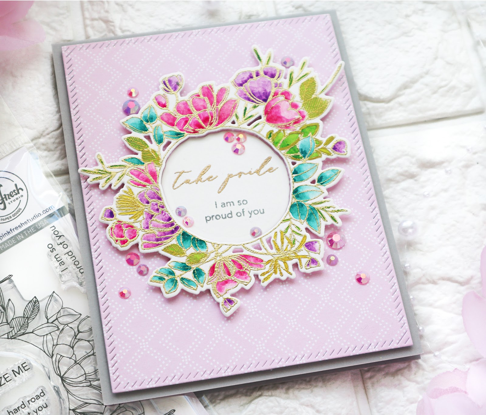 I gold heat embossed the Take Pride image on a watercolor paper, colored it using Pinkfresh Studio Liquid Watercolors and cut it with the coordinating die. I used the center circle to add the sentiment which I gold heat embossed. The small sentiment from the same set was stamped in Metropolis.