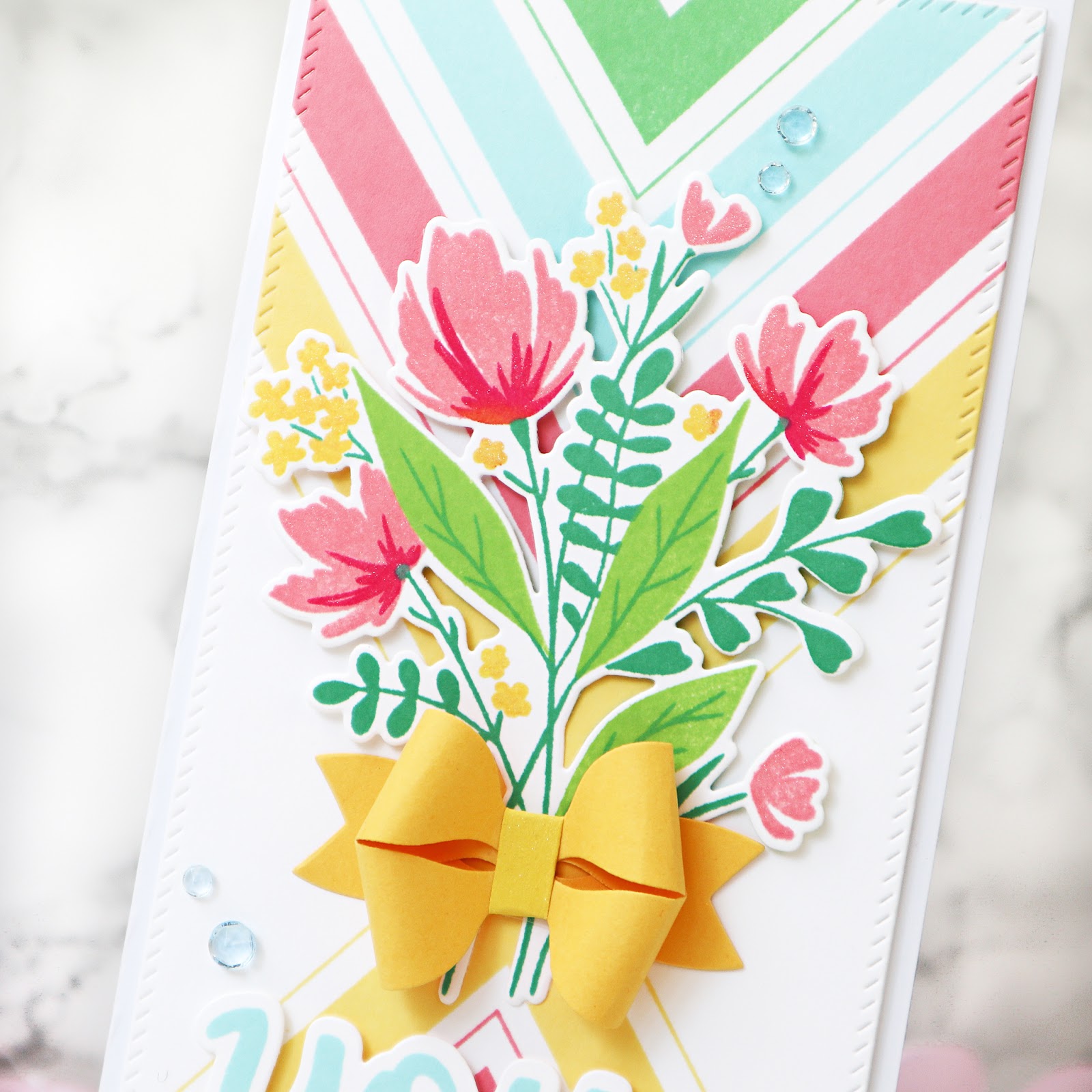 Modern Layered Floral image was stamped in Coral Reef, Raspberry Bliss, Sweet Mustard, Emerald City and Key Lime and cut using the coordinating die. I glued the lower part of the floral cluster on the background and adhered the upper part using some foam tapes. I cut a bow using Artistic Bow die from some yellow cardstock and added it to the bouquet.