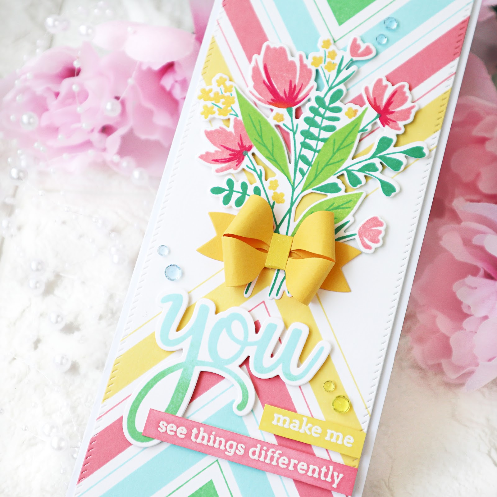 For the sentiment I used the same colors I used for the background. “you” from Simply Sentiments – You set was stamped in Ocean Breeze and Meadow in an ombre fashion. The small sentiments were white heat embossed on strips of white cardstock. I ink blended them in Lemon Whip and Coral Reef respectively. I added some light blue and yellow Crystals and the card was finished.