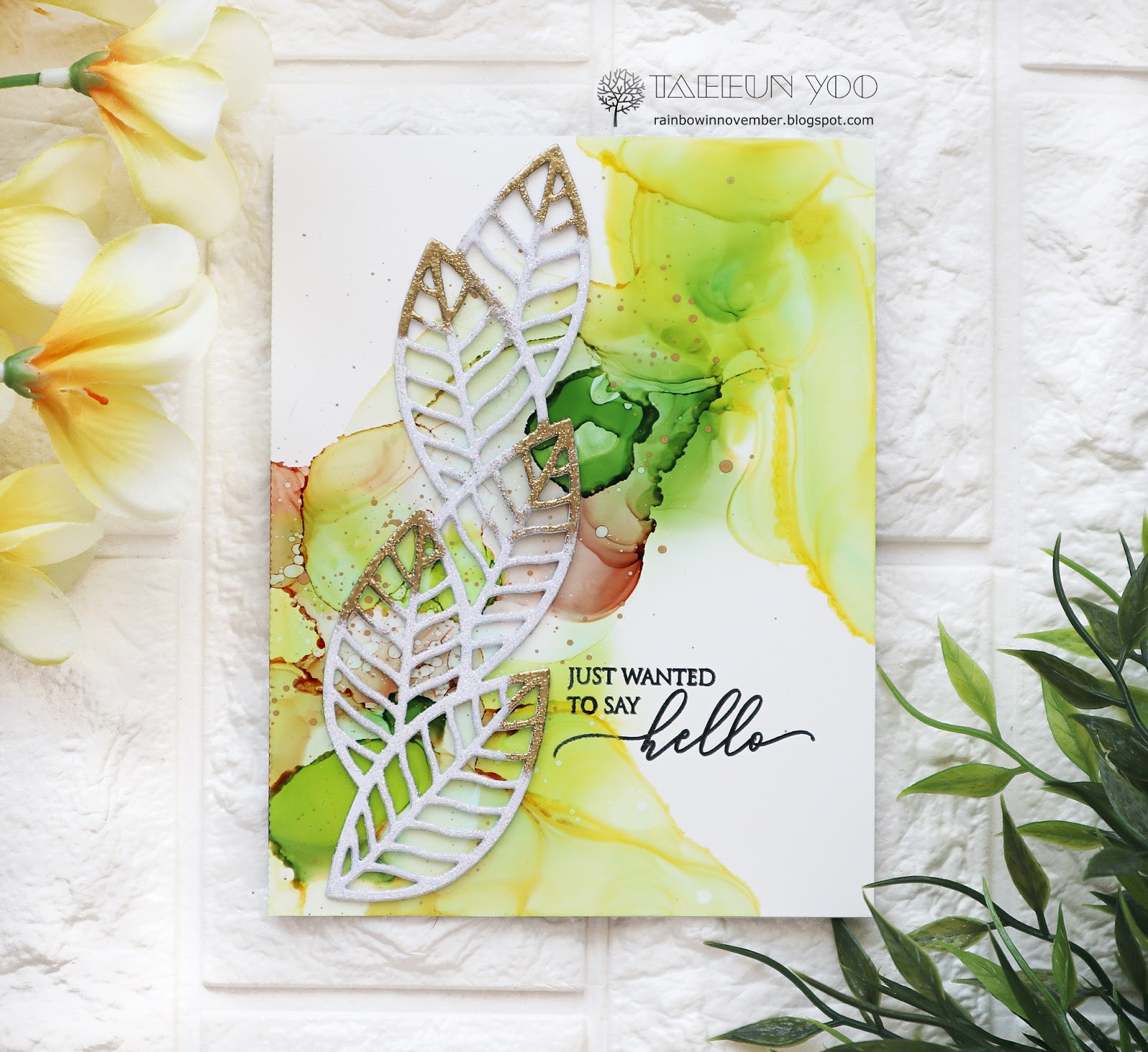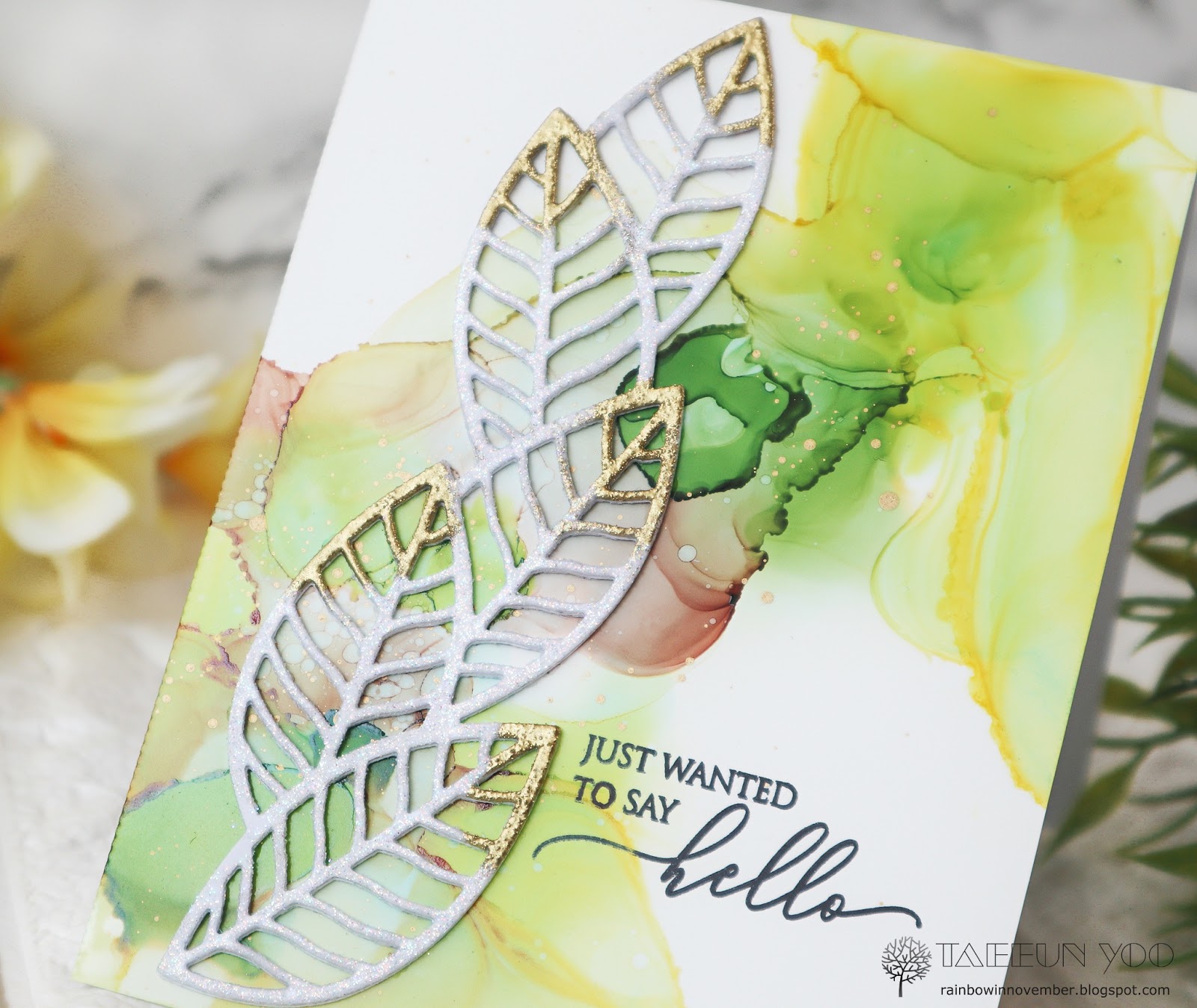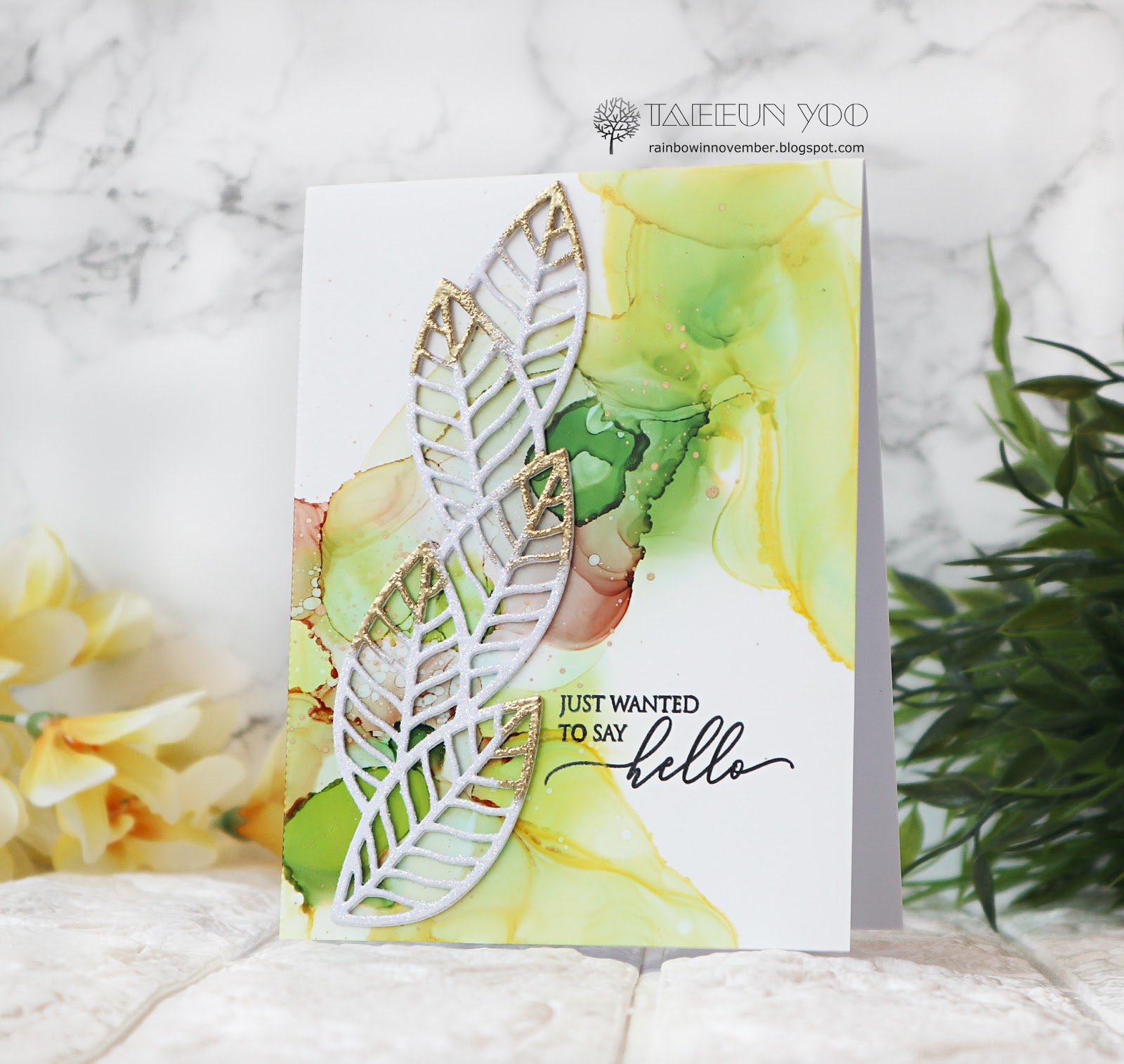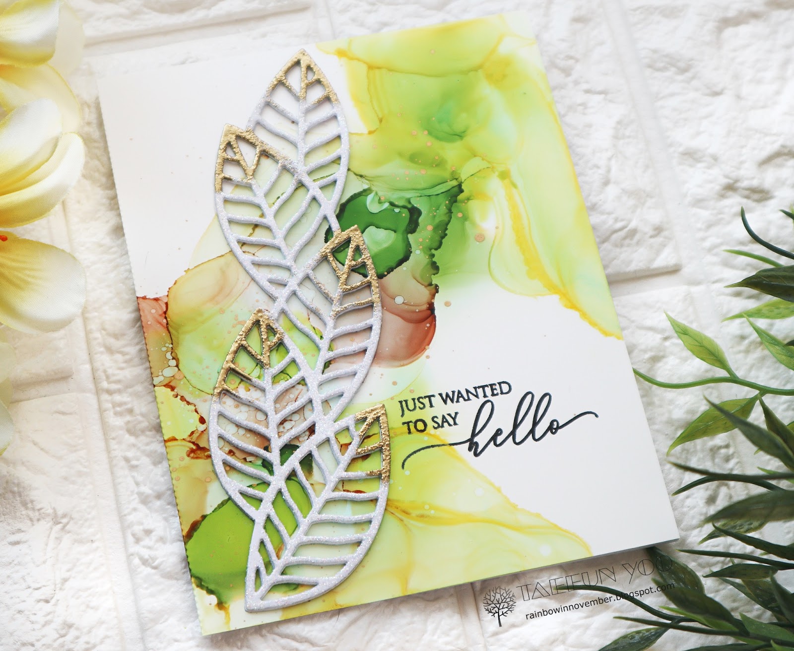 Next card is showcasing the Layered Leaves (51-633) die. I’ve made a simple card using the die and an alcohol inked YUPO panel.