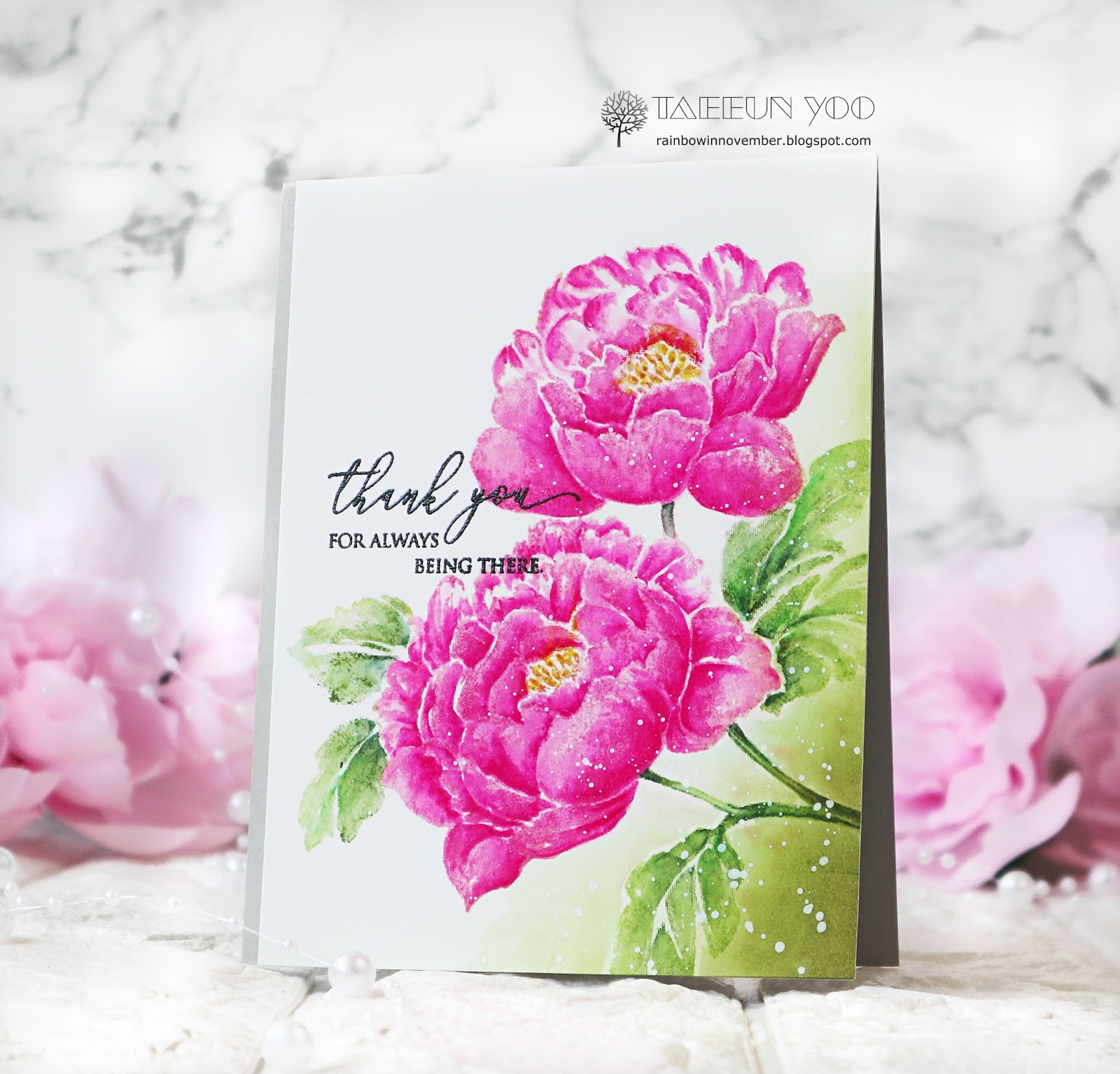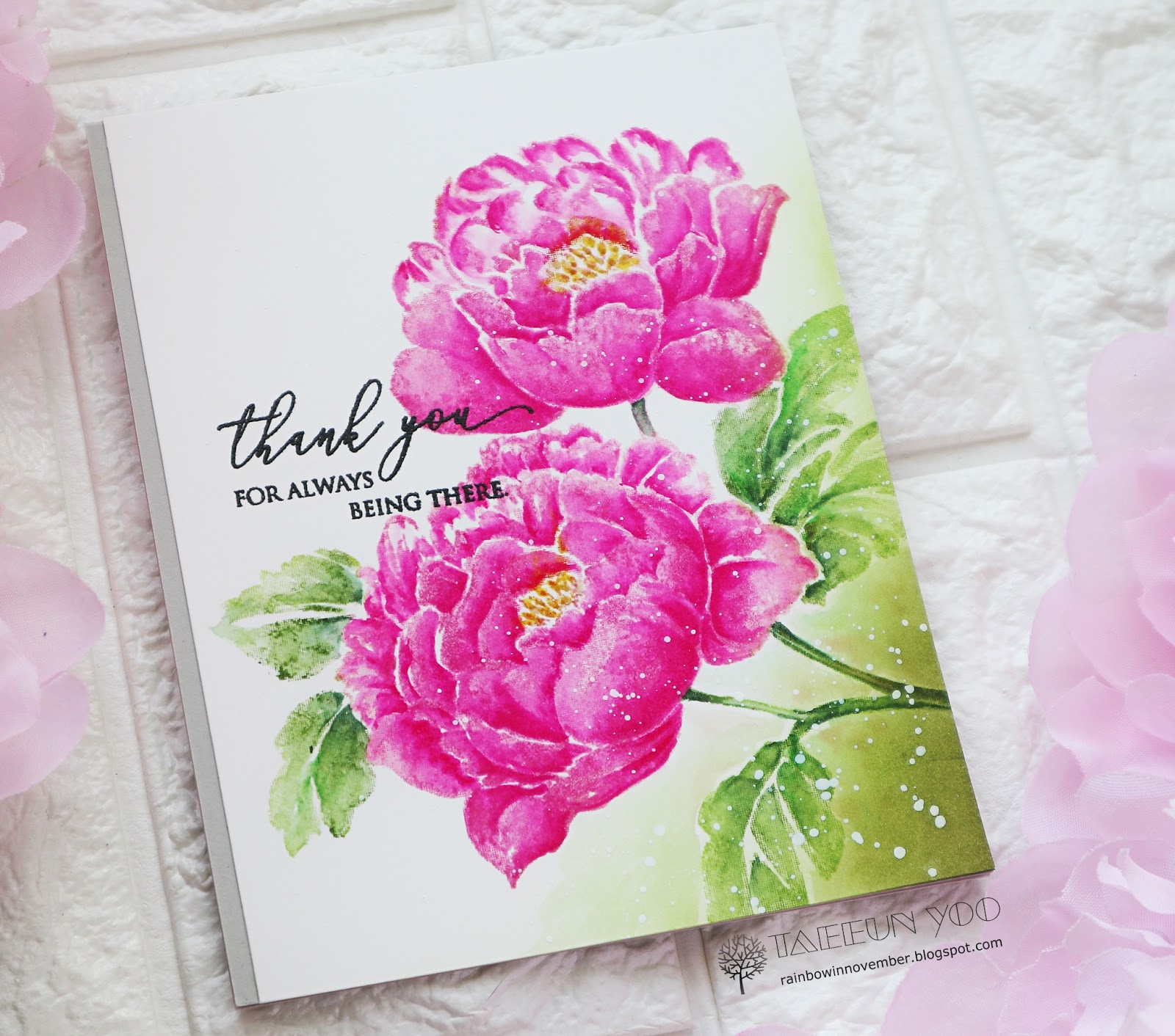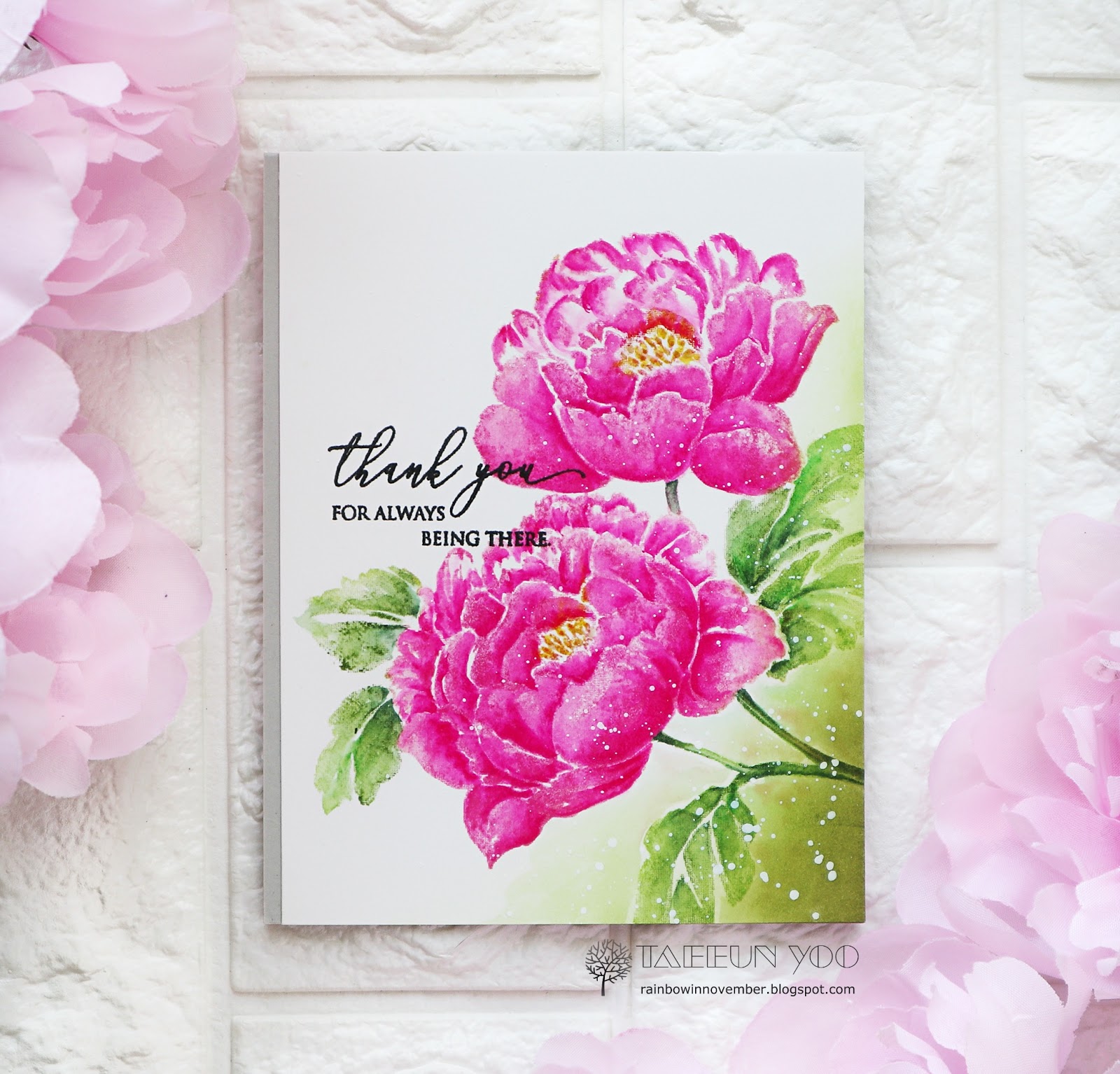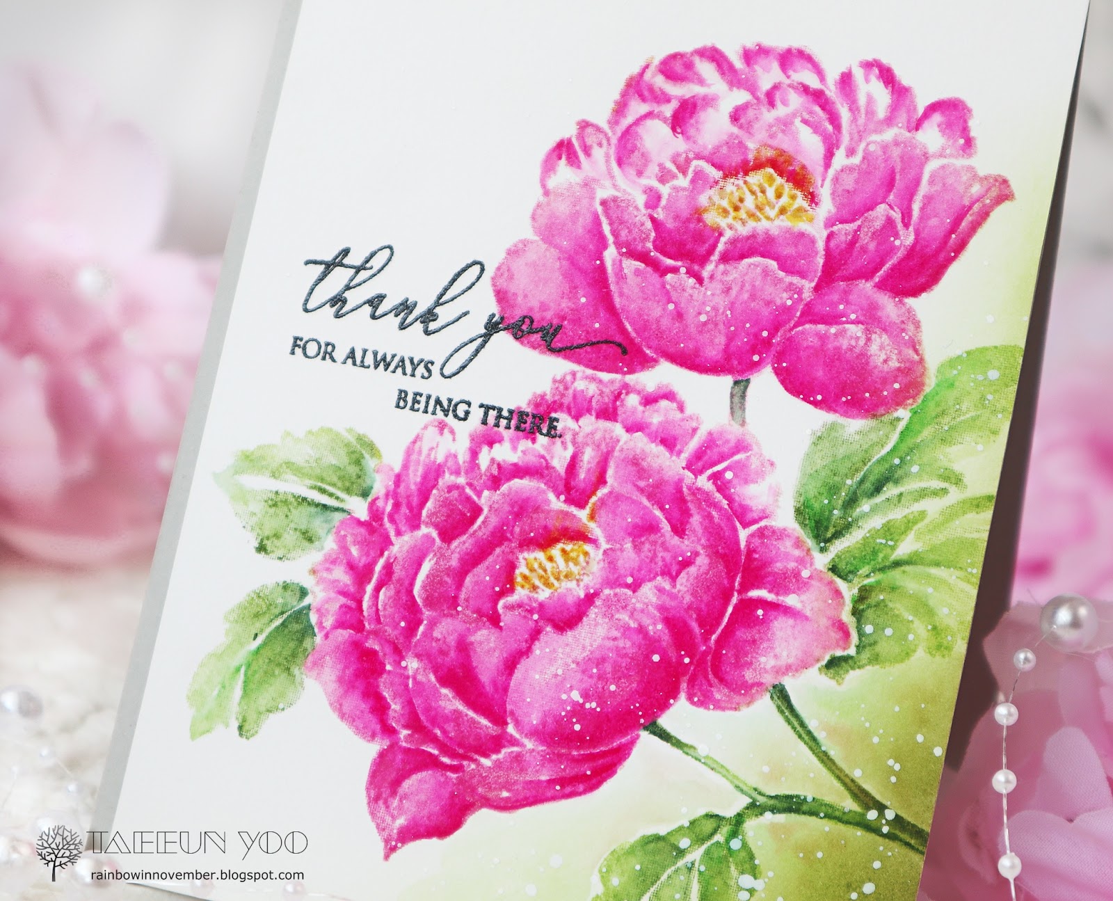 First I stamped the gorgeous peony cluster image on a watercolor paper in Picked Raspberry DI and various green shade of DIs. I used my MISTI tool to stamp the single image partly in different colors.